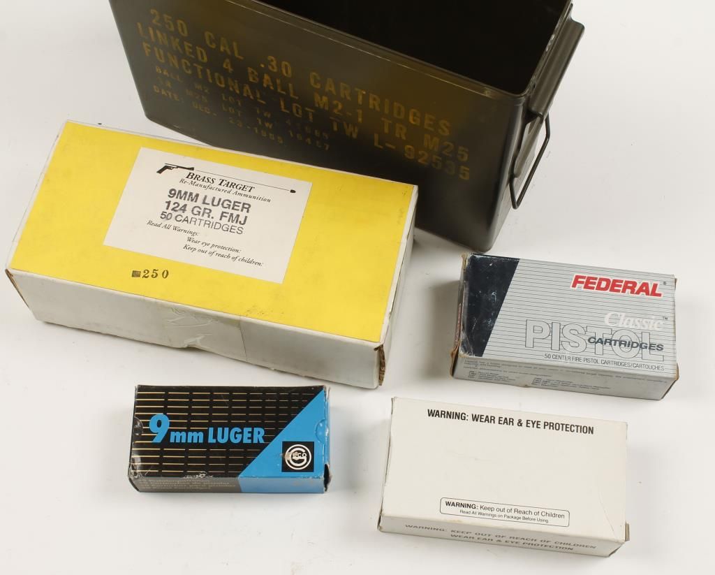 Includes 193 rounds from various manufacturers and bullet weight. in original boxes. In small green metal ammo can.