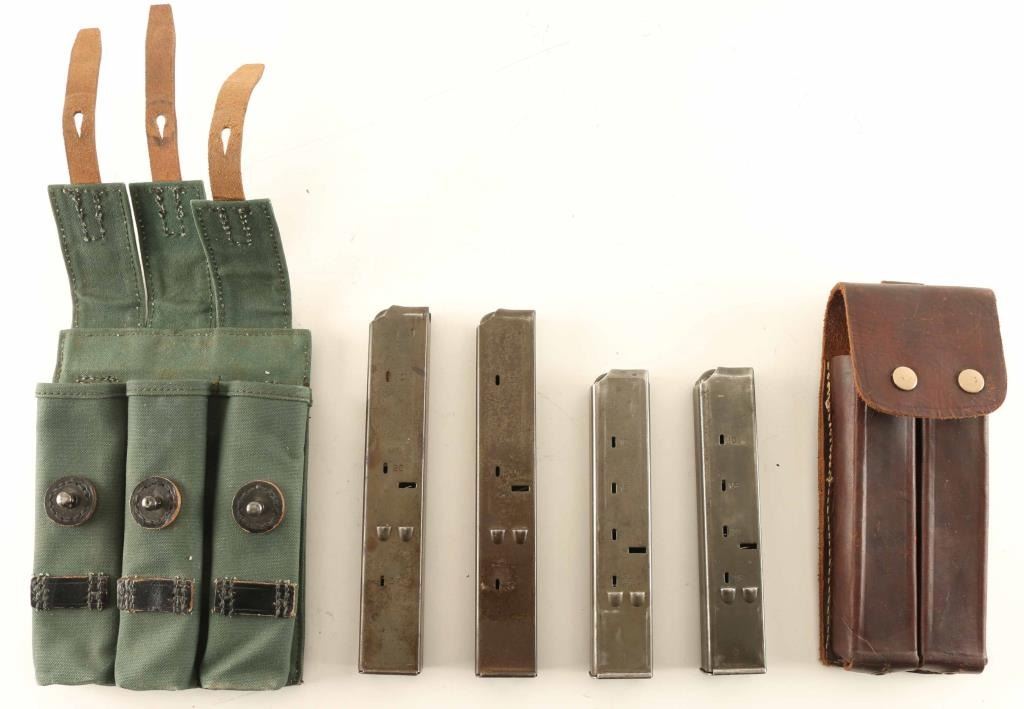 Two 25 round magazine in three slot canvas holder and two 32 round magazines in two slot leather holder