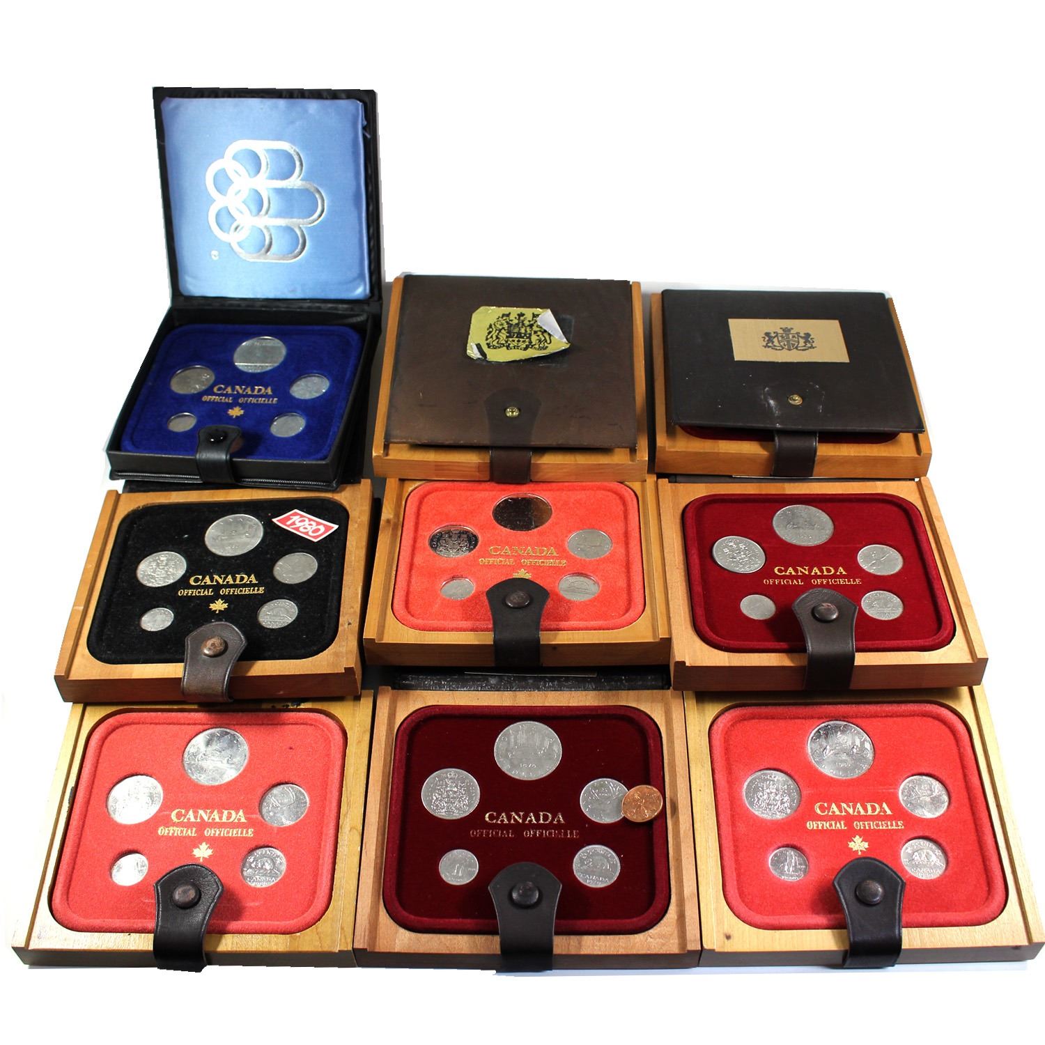 Lot of 9x 1979-1982 Canada Year Sets in Deluxe Wooden and Leather Cases and one Olympic Black Case. Various imperfections. Some duplicates possible.
