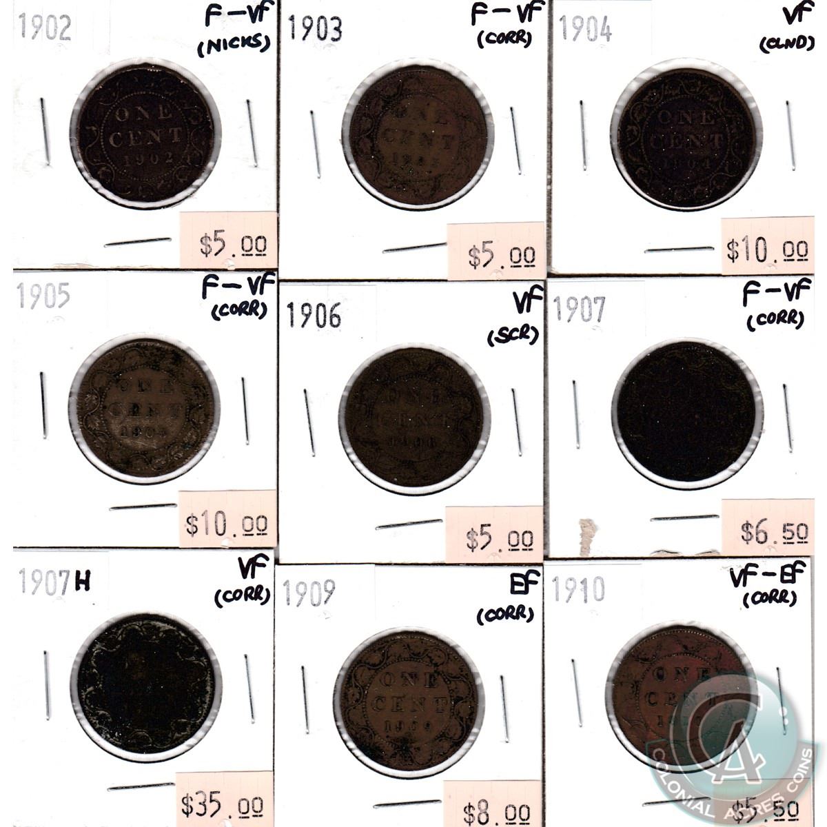 Lot of 9x Canada 1-cent Dated 1902-1906, 1907, 1907H, 1909 & 1910 in F-VF to EF (coins have minor impairments, view image). 9pcs