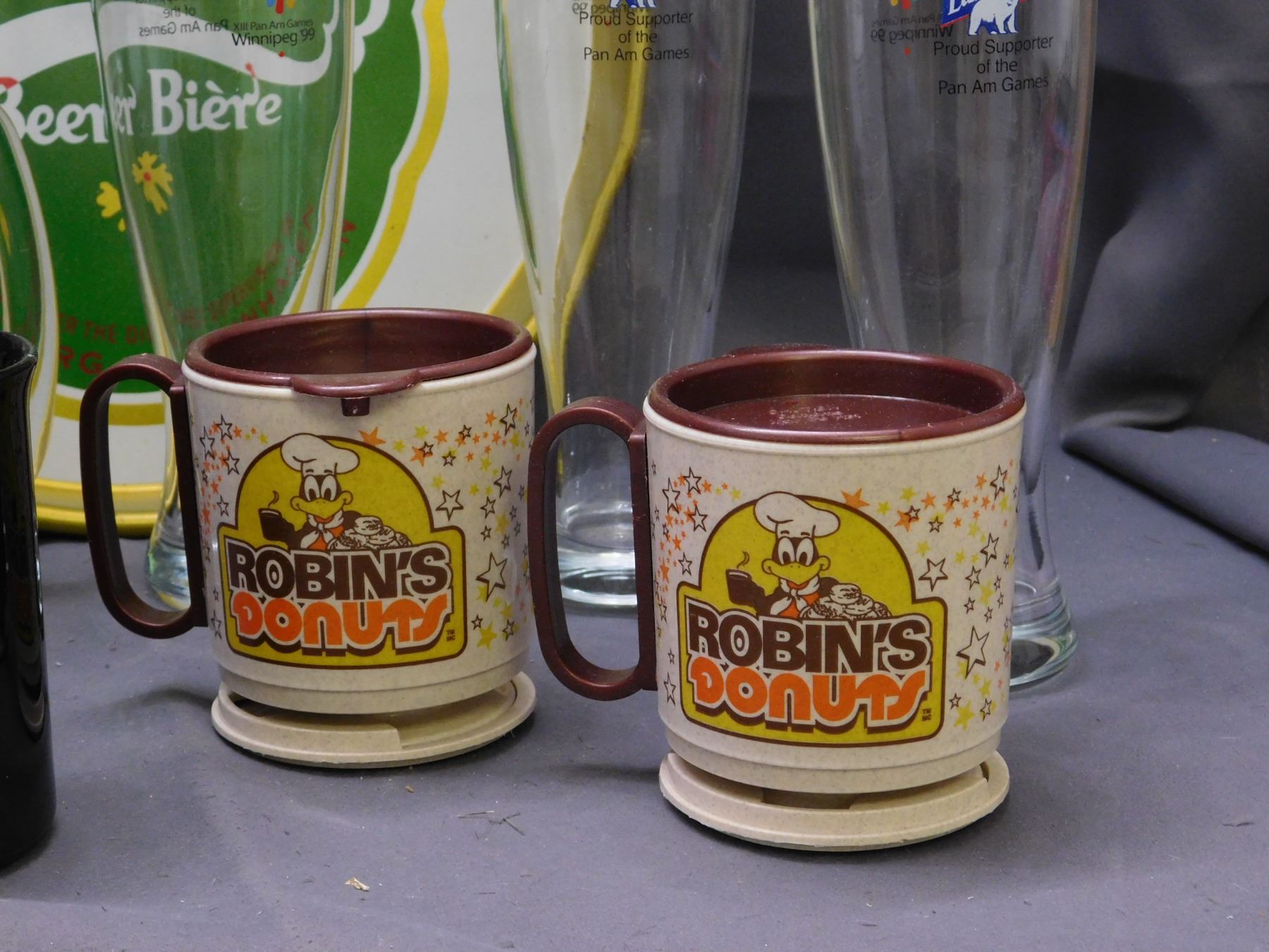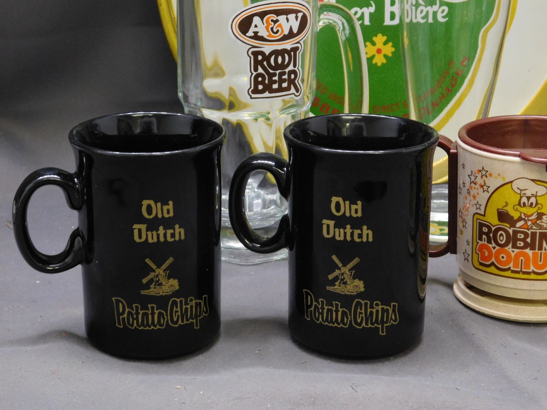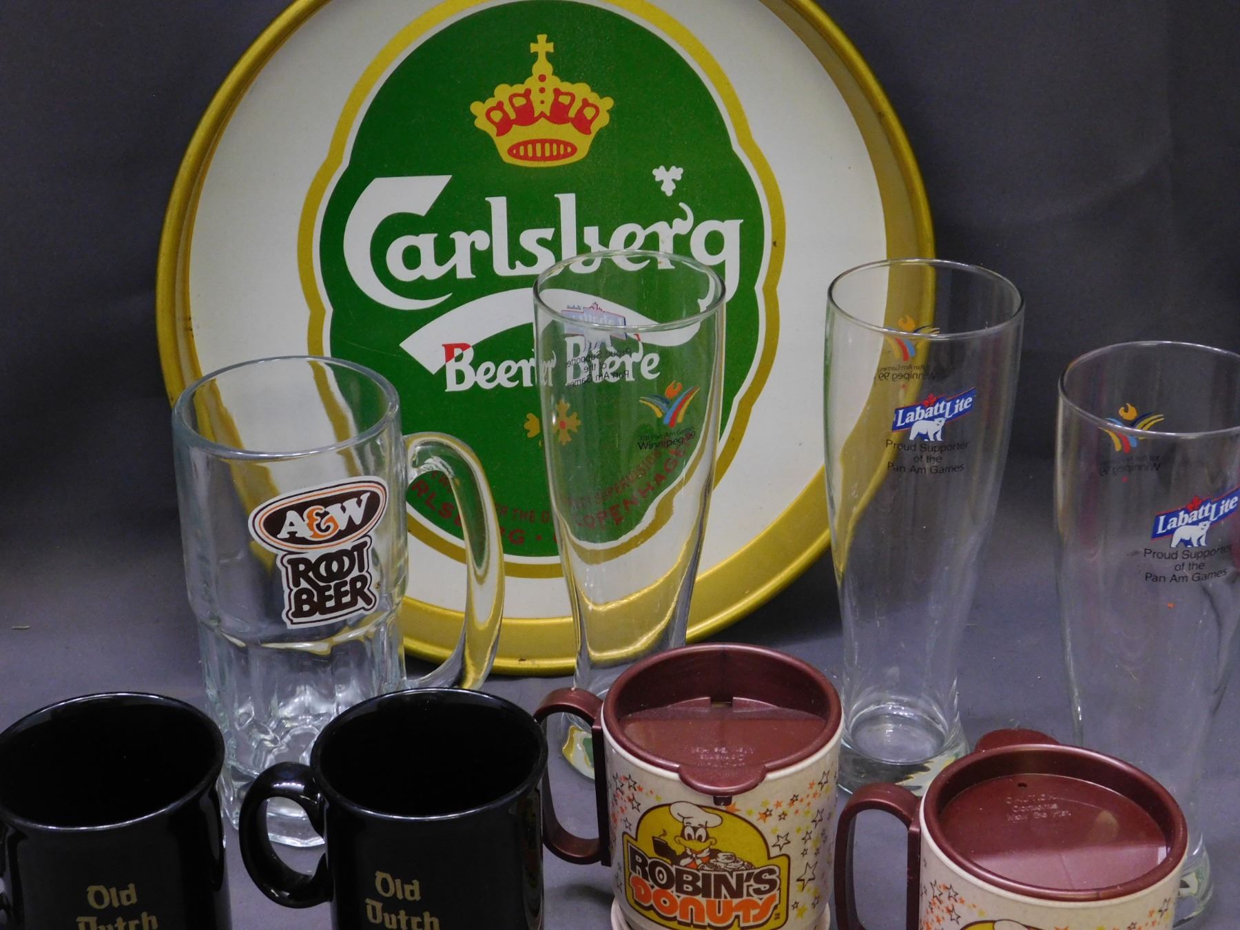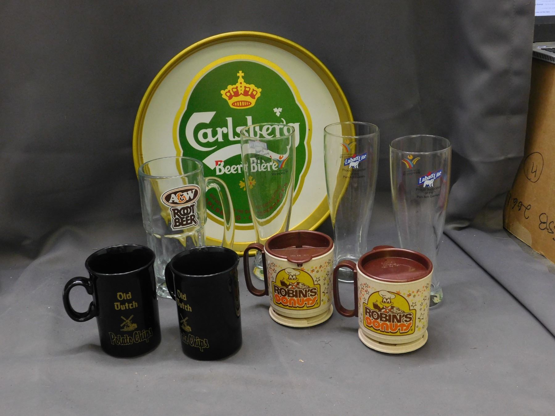 Lot of Advertising Glass Labatt Glasses, A&W, Robins Mugs, Old Dutch Mugs, Carlsberg Tray
