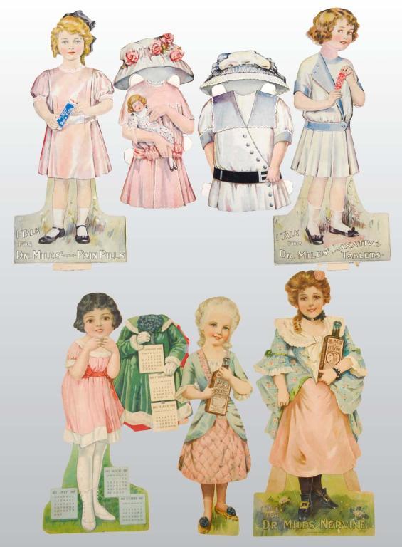 Description 1913 to 1919. This large group of dolls includes Katrina Knickerbocker, Swift's Calendar Set, Dorothy Quincy and the Maynard Liniment Girl. No set is complete and the clothing is played with. This group is rated from fair to very good.