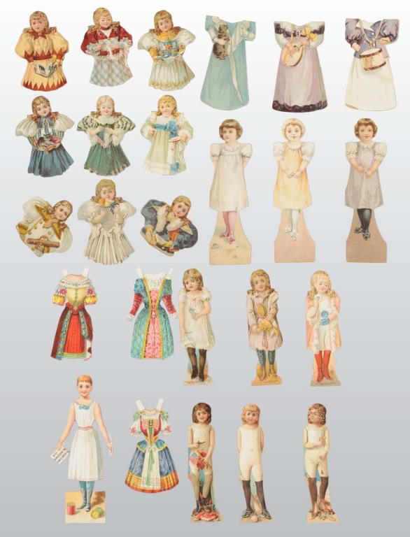 Description ND. The lot includes dolls from Brook's Spool Cotton, Blackwell Durham Tobacco, KC Baking Powder, Kabo Corsets, Gross Dry Goods, Dot Coffee, Friends Oats, Lettuce Cream Shop, etc. This lot is graded fair to fine.