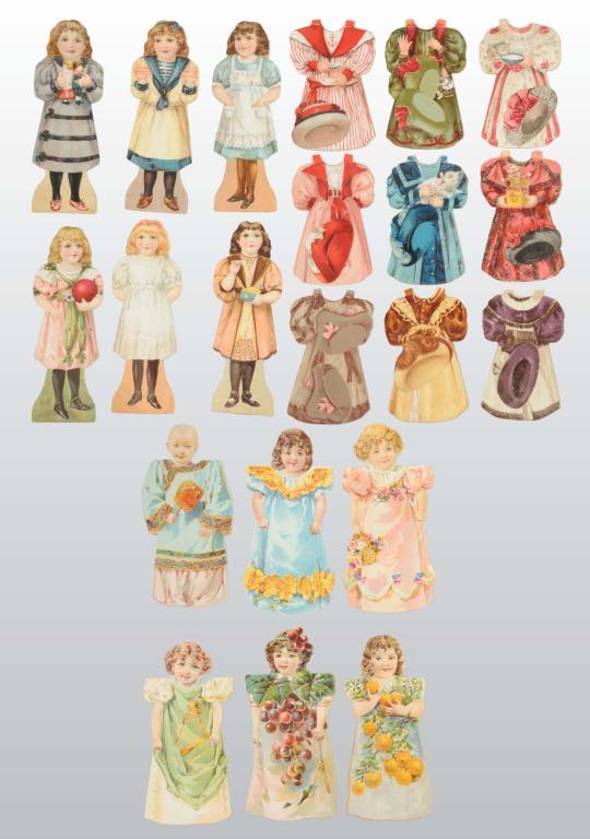 Description ND. The lot includes dolls from J. P. Coats, Diamond Dyes, Buttermilk Soap, Barbours Irish Flax, Stollwerck Breakfast Cocoa, Sunshine Biscuits, etc. The lot is graded from good to fine.