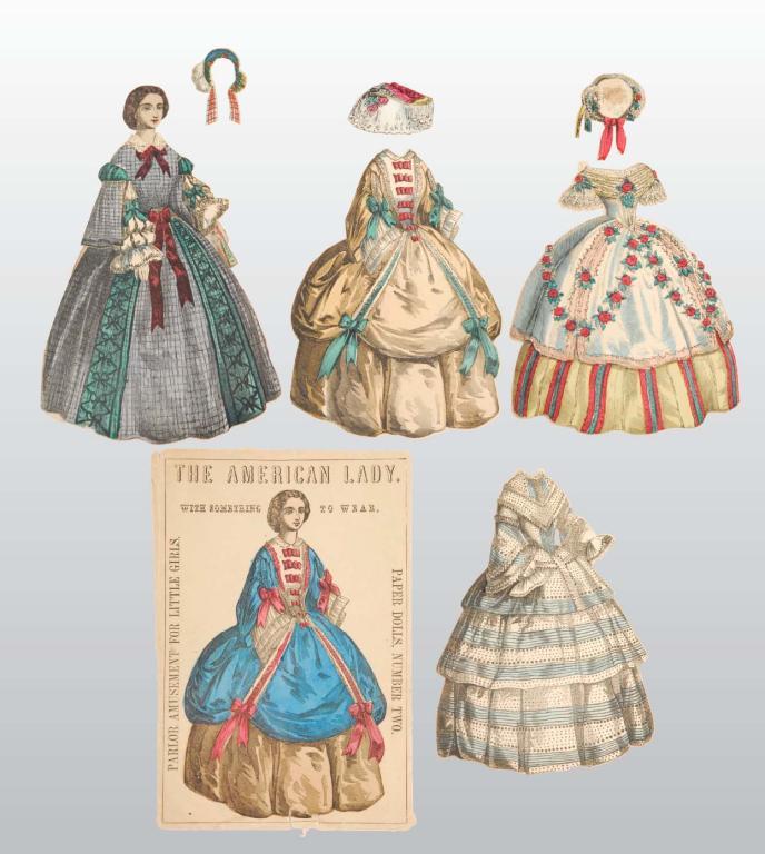 Description Dated 1857. Hand colored from wood engravings, this set has five lovely, detailed gowns, one shawl and four headdresses. Only the front of the envelope remains. The set is in wonderful condition with the average age and wear.