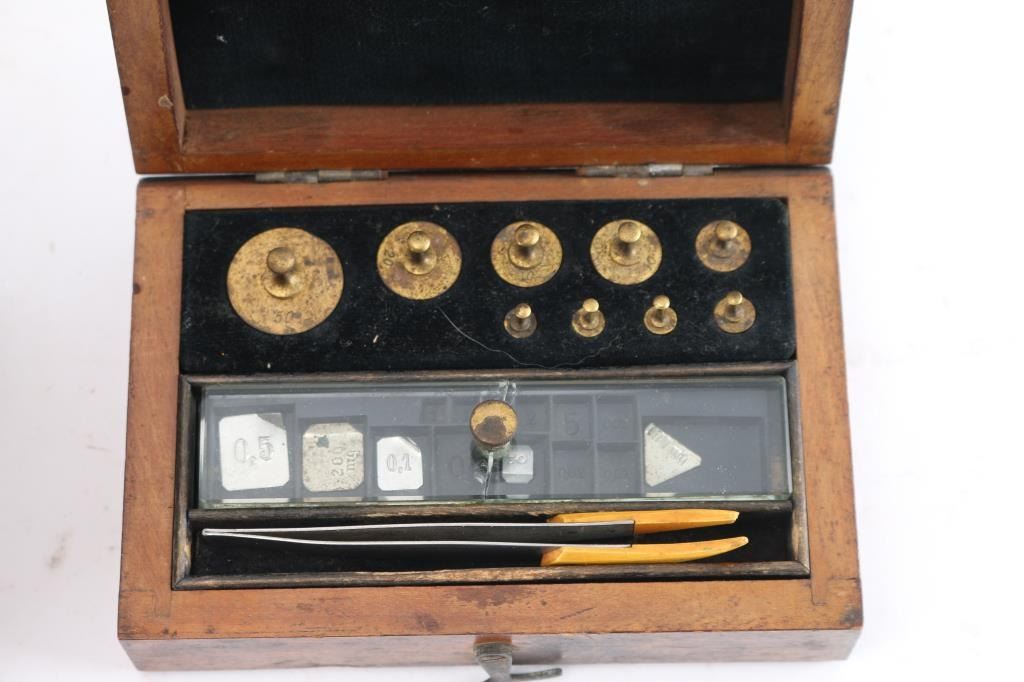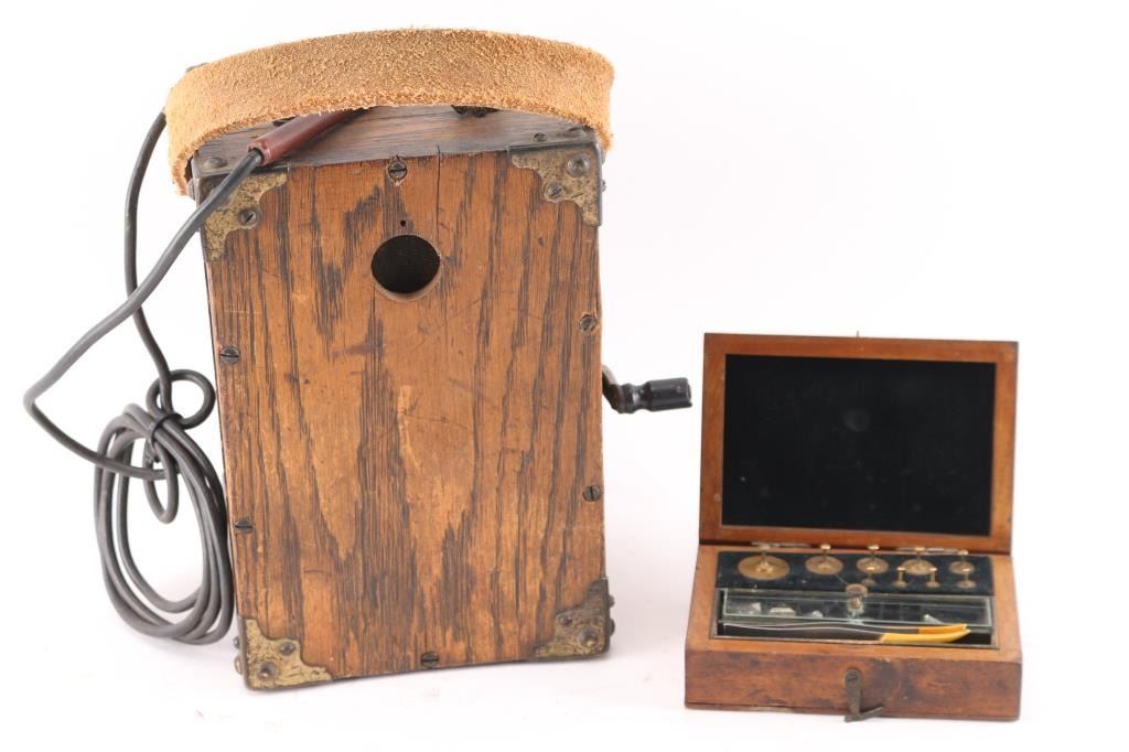 Antique phone by the Holtzer-Cabot Electric Company.And, set of scale weights in wood box.