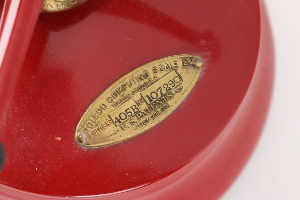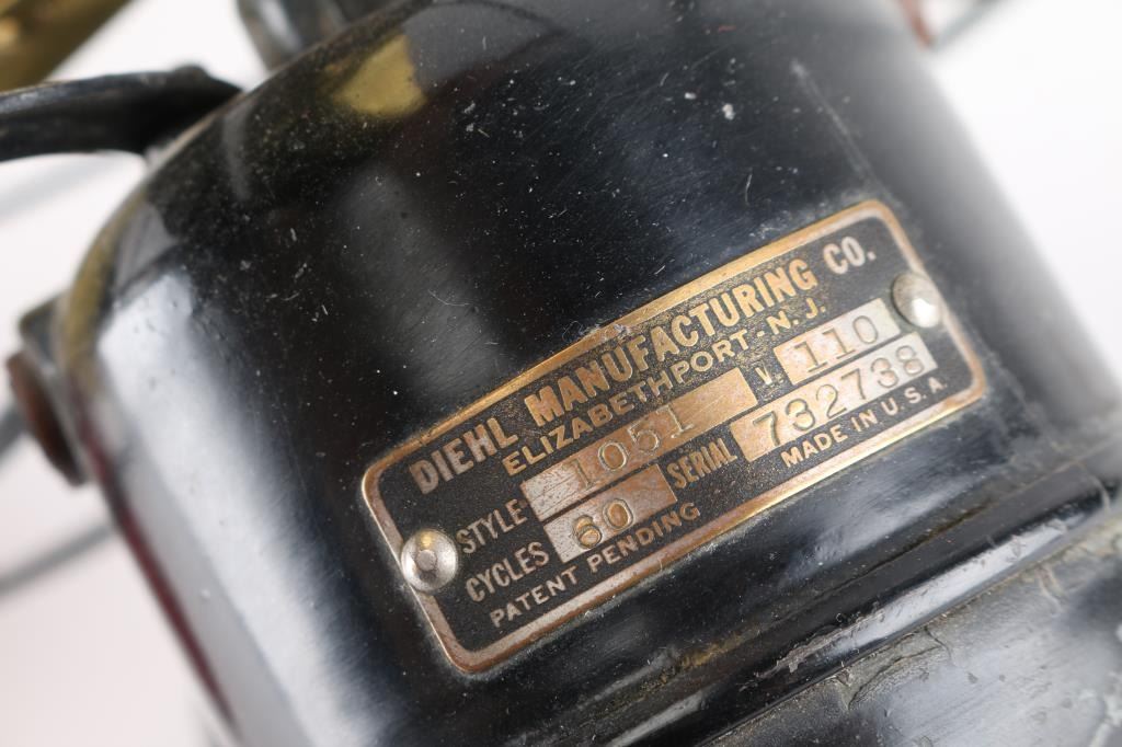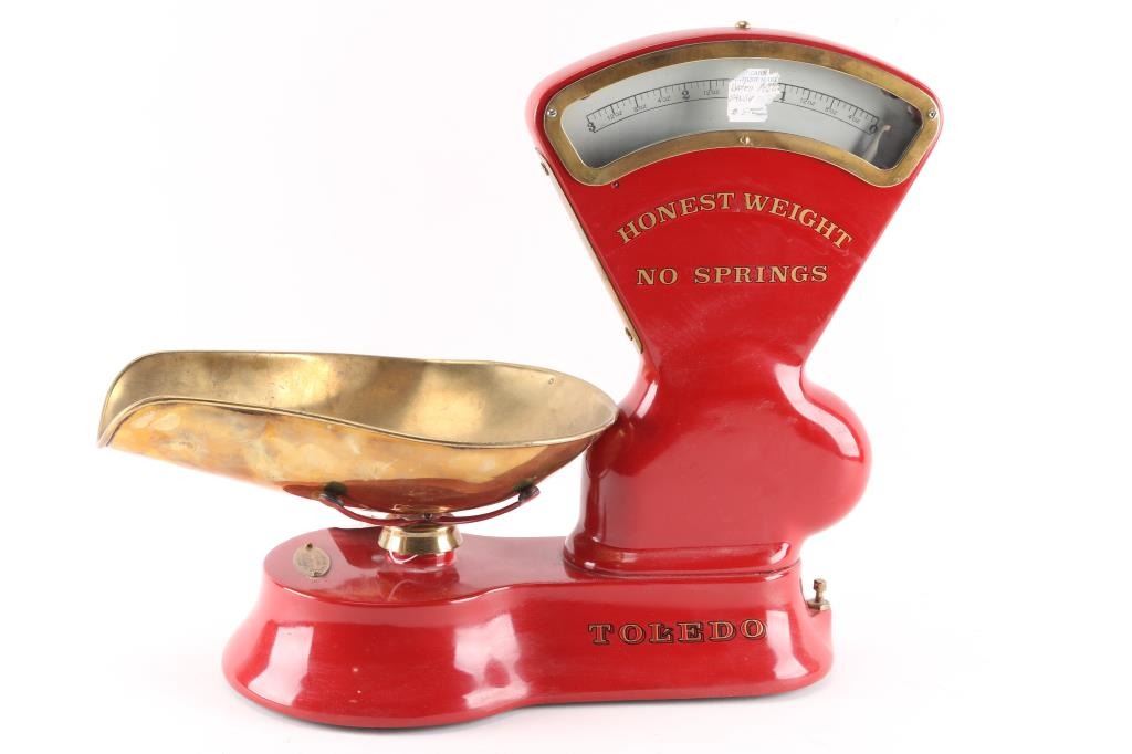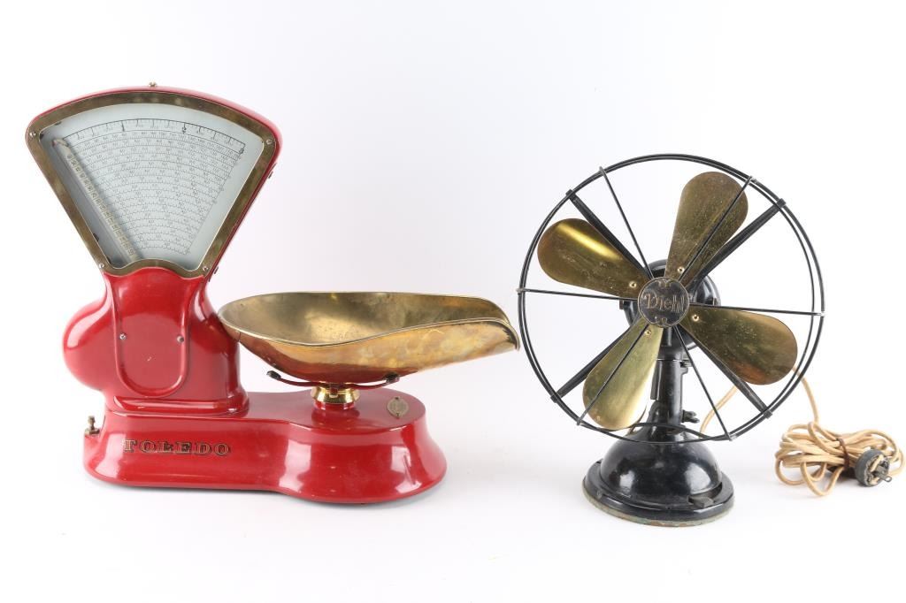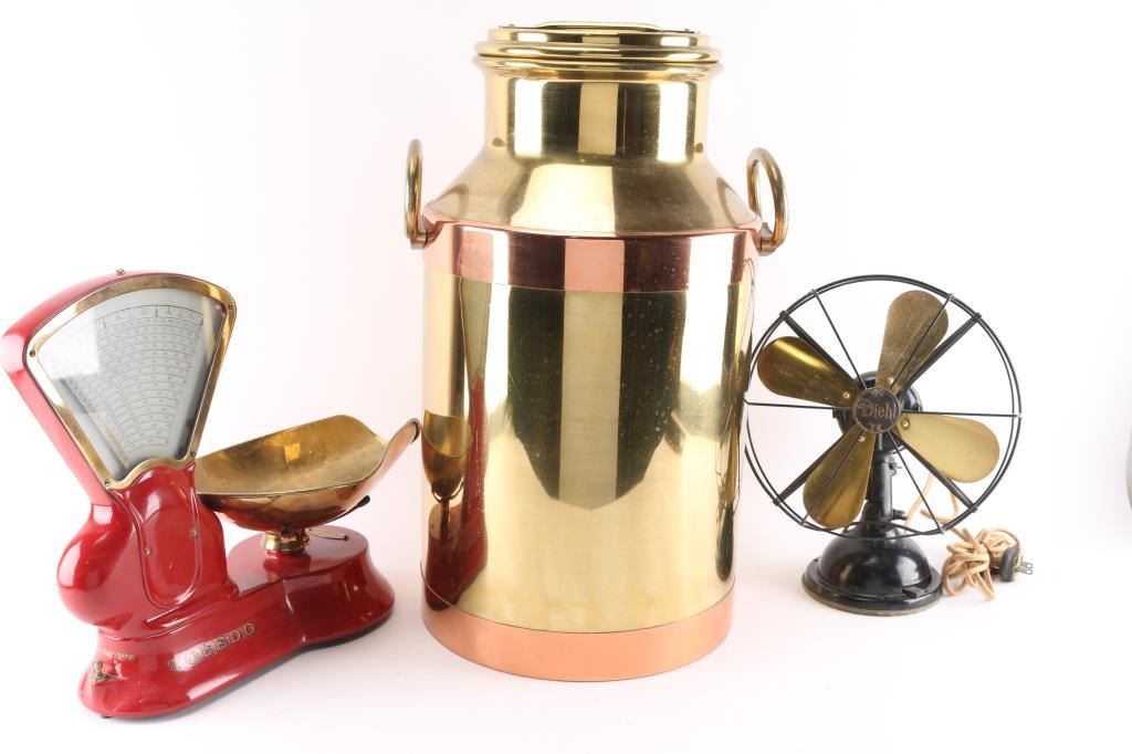 (1) Antique Toledo candy scale. 15"H x 14"W x11"D. (1) Antique Diehl fan. 13"H x 11"W x 7"D. (1) Brass and copper milk can. 22"H x 14"W x 14"D. (1) Antique balance scale.