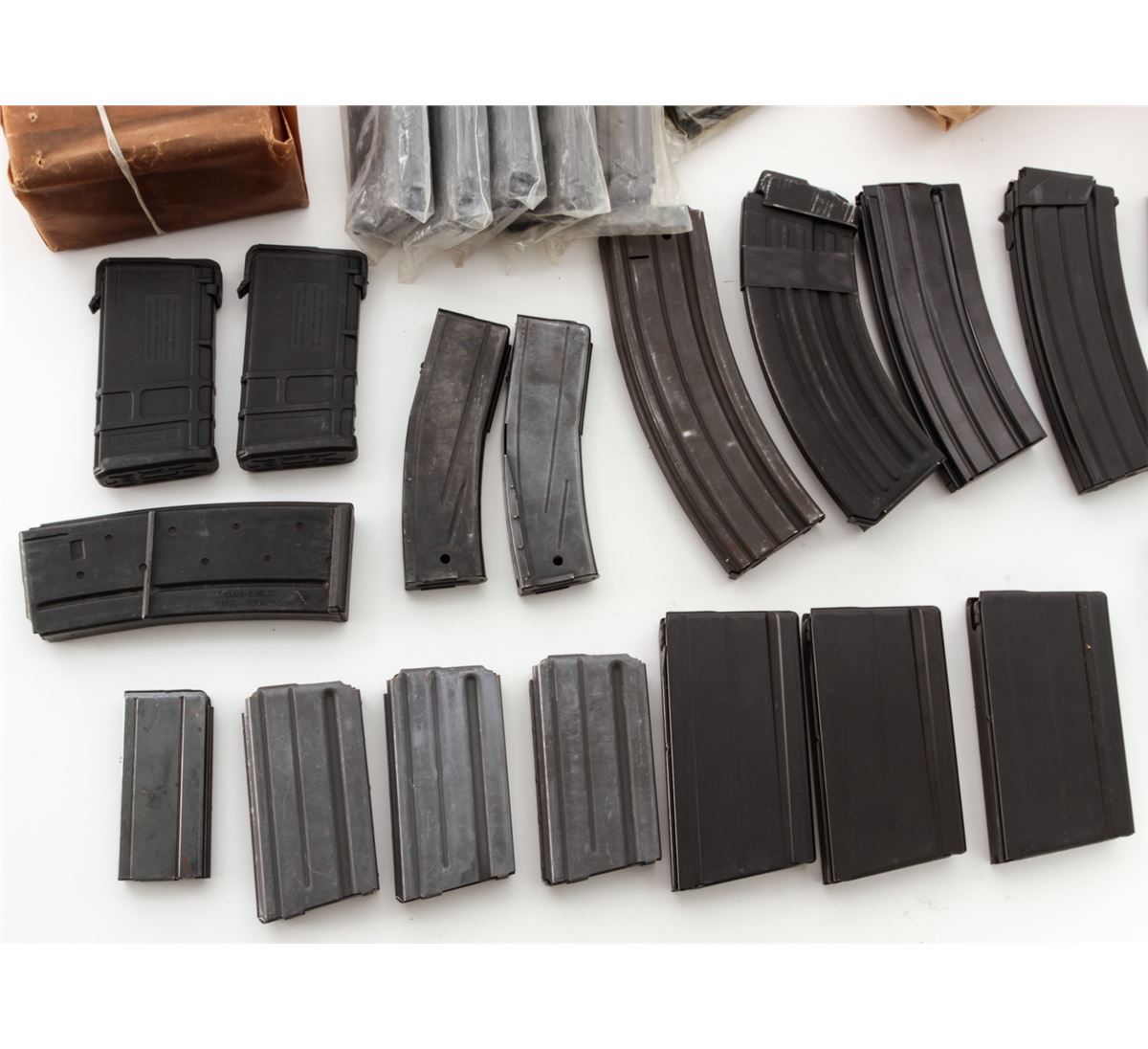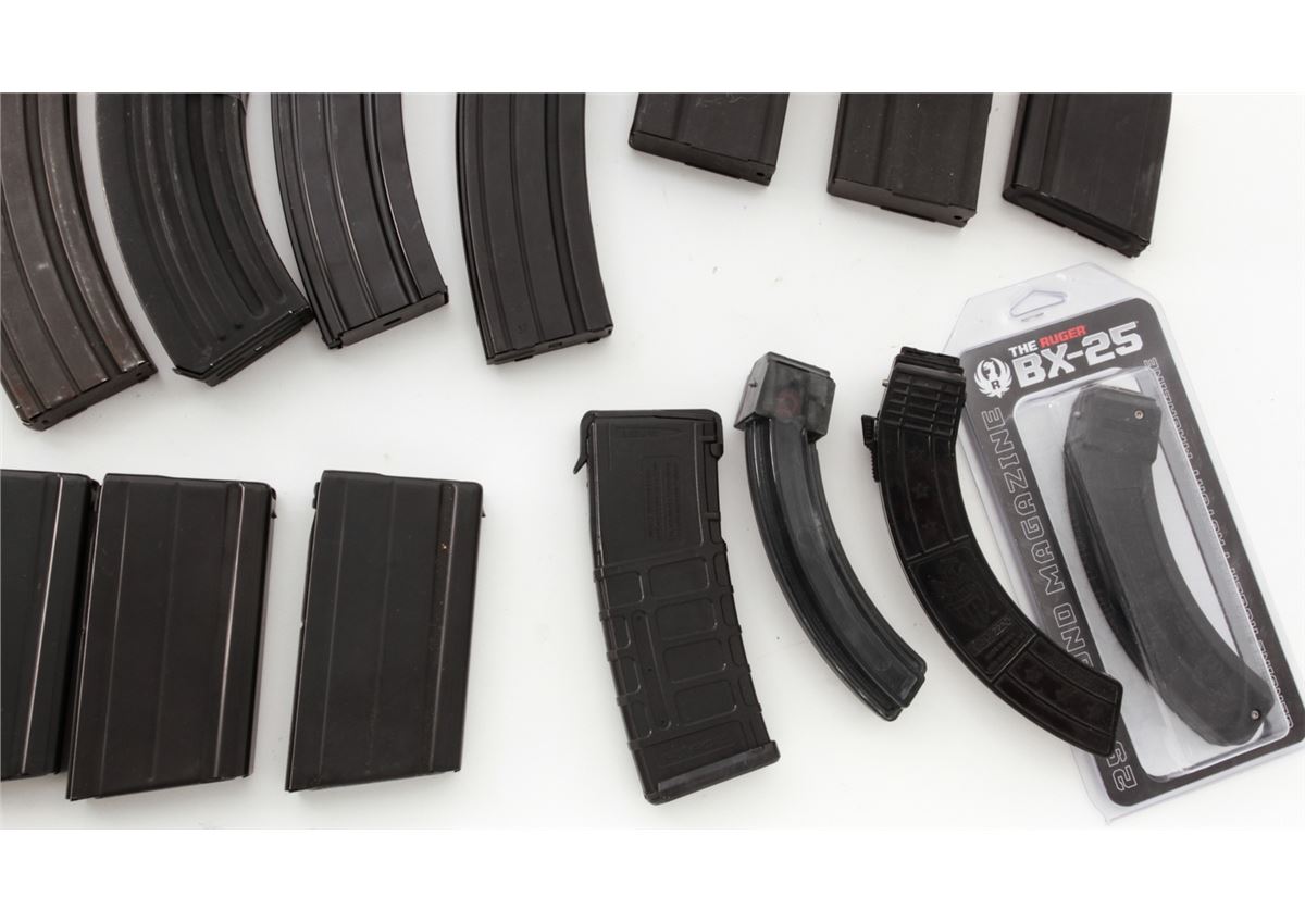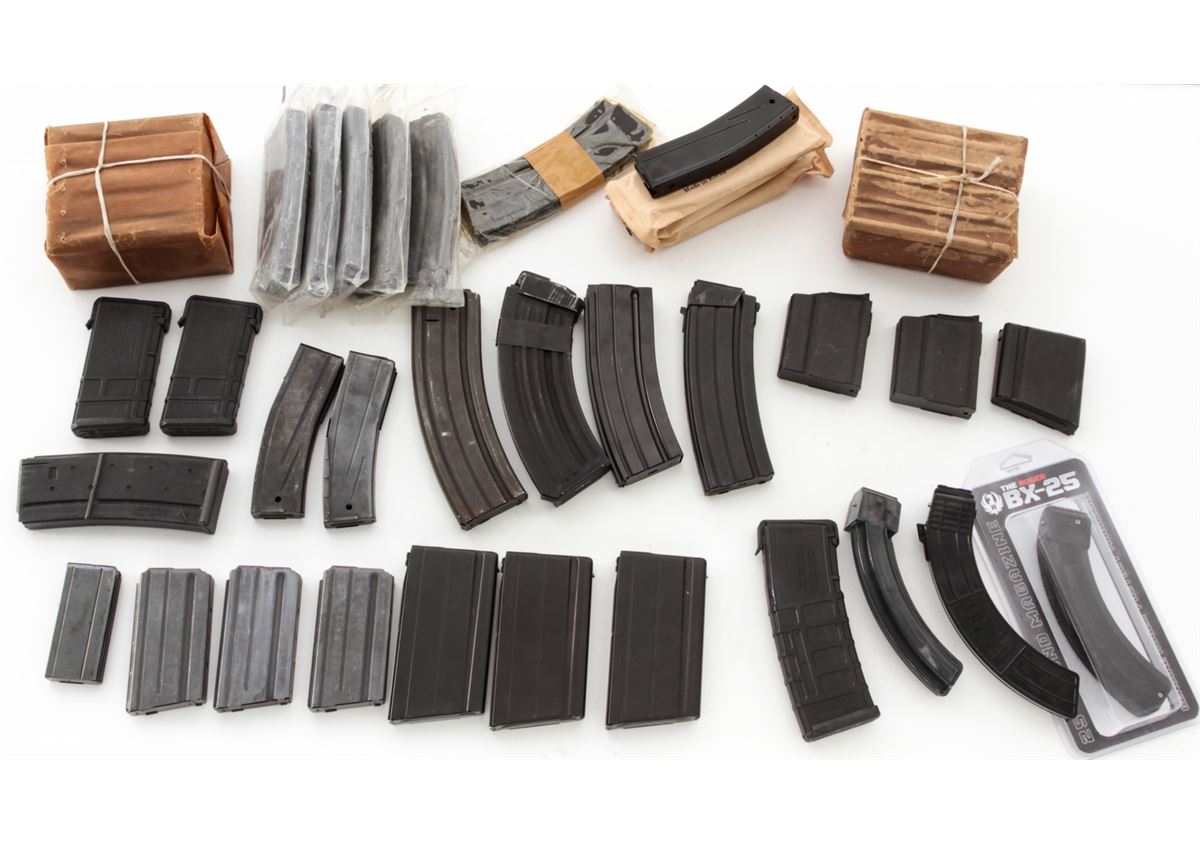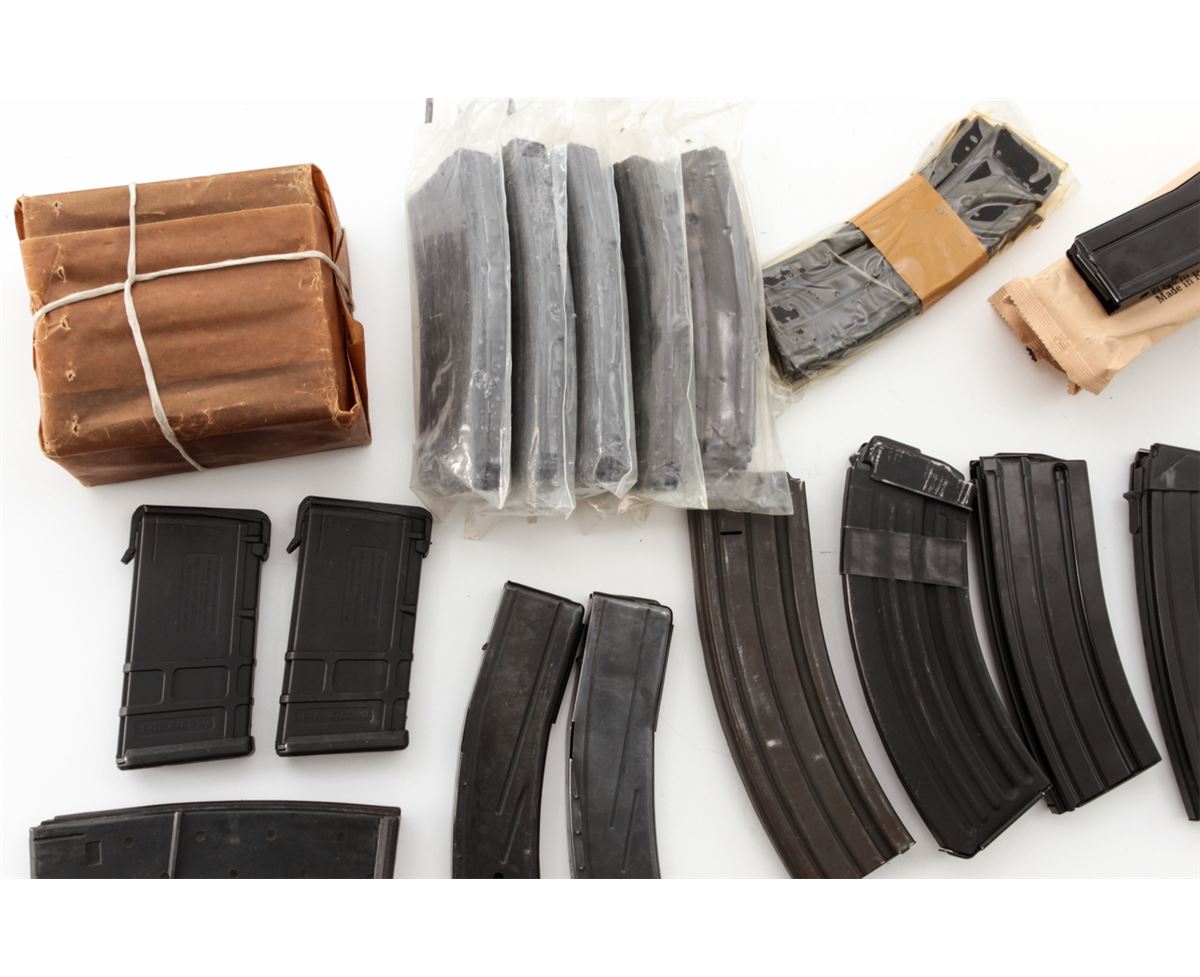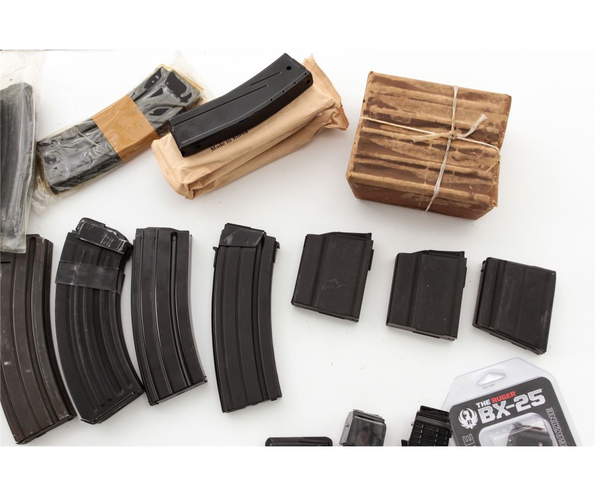 Lot of Approx. Forty-Three (43) High-Capacity Magazines, consisting of: Sixteen (16) SA58/FAL 7.62 cal. mags, 20 & 15 rounds; Fifteen (15) AR-15 mags, 20 & 30 rounds; Seven (7) .30 Carbine mags, 30 & 15 rounds; Three (3) 10/22, 25 rounds; and two (2) AR47 mags. Est.: $400-$600/lot. (High-cap mags not available to California residents.)