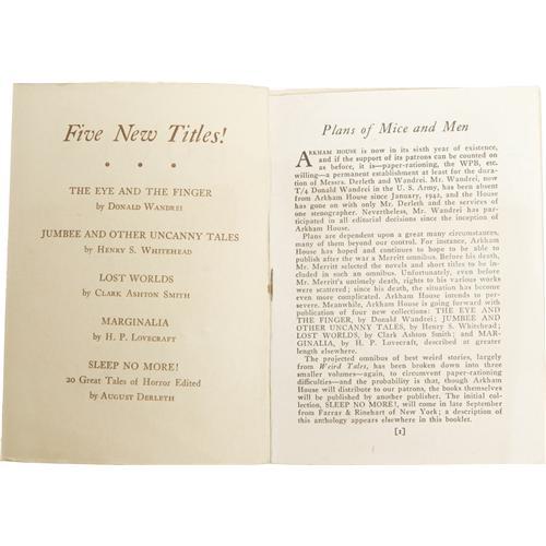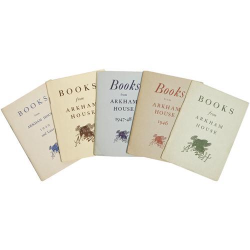 <B>Great Collection of Arkham House Catalogs from 1944-1949.</B></I> All catalogs published by Arkham House Publishers, Sauk City, Wisconsin, 24mo (4" x 5.5"), ranging from 16 to 38 pages, stapled paper covers, in near fine condition, and including 1944, 1945, 1946, 1947-48, and 1949 editions. As mentioned all catalogs are in near fine condition with the exception of the 1944 edition that has a few ink check marks beside a previous owners wish list. These Arkham House associated items are scarce and highly collectible. <I>From the Ventura Collection.</B></I><BR><BR><b>Shipping:</b> Books & Catalogs (<a target="_blank" href="http://www.heritageauctions.com/common/shipping.php">view shipping information</a>)