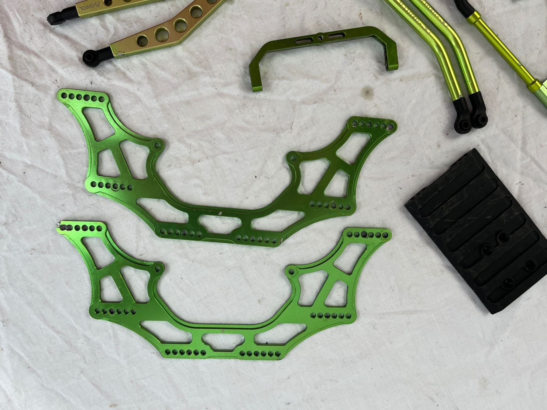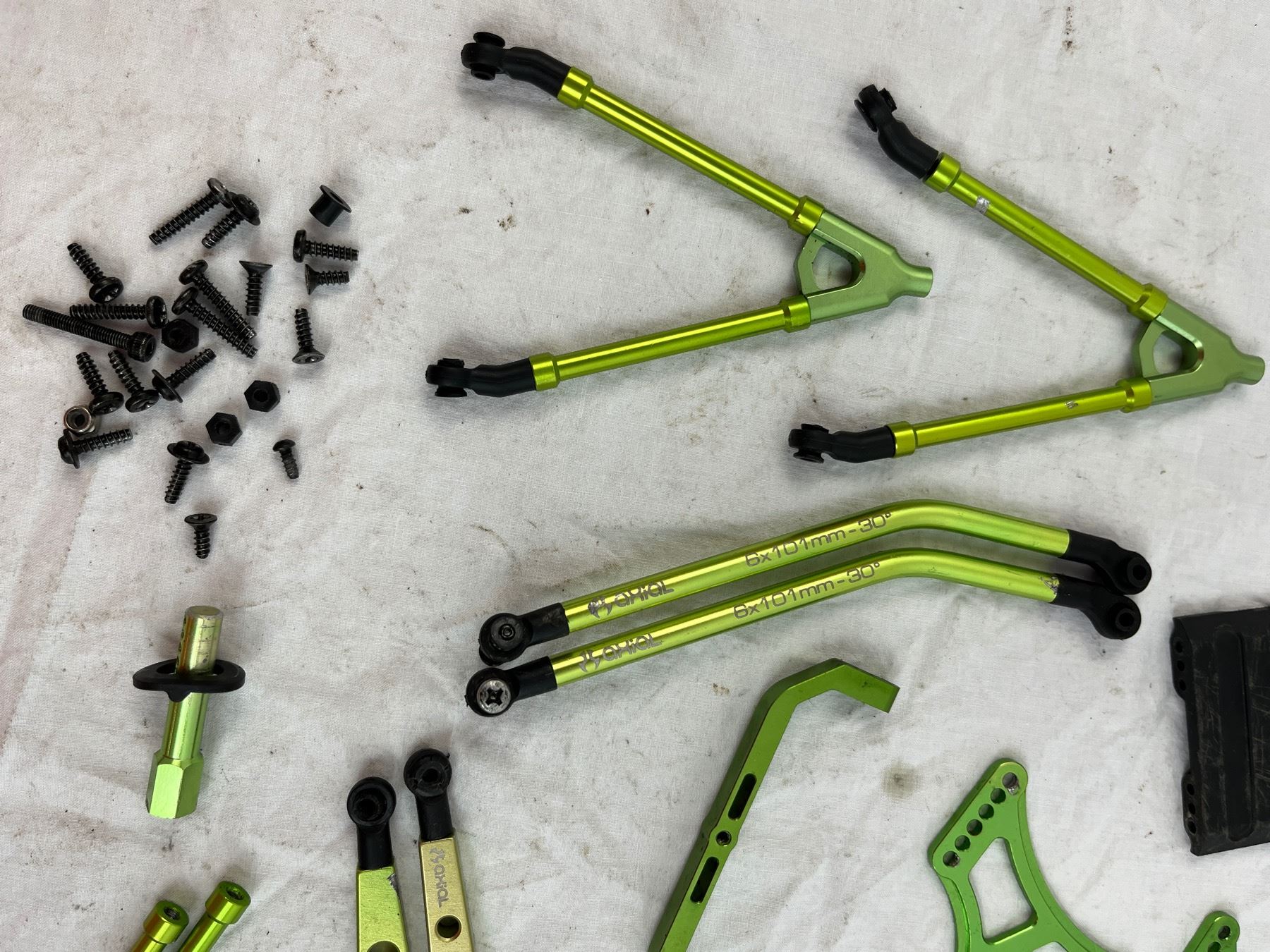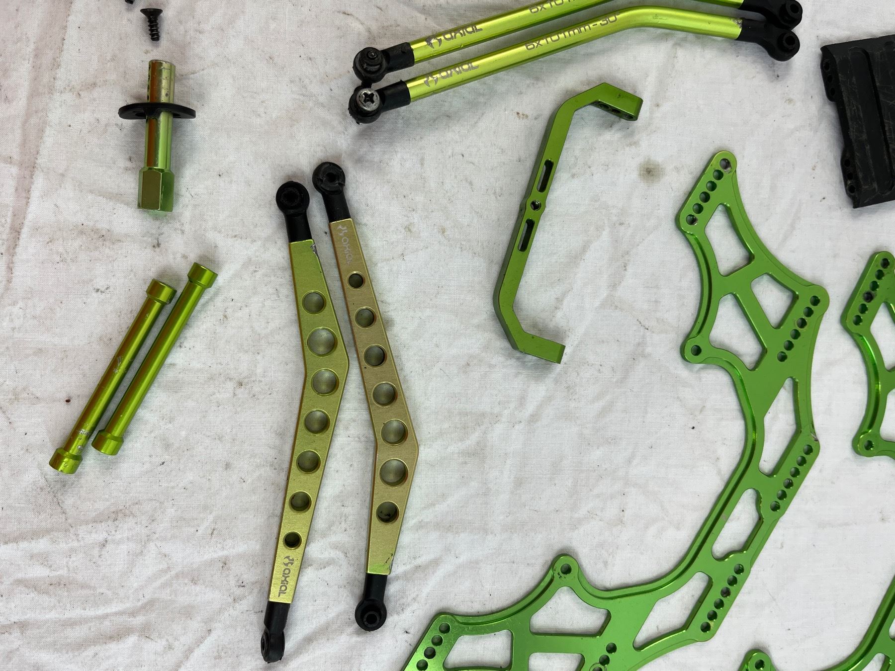 Green Aluminium Axial car part lot, chassis parts and other components.