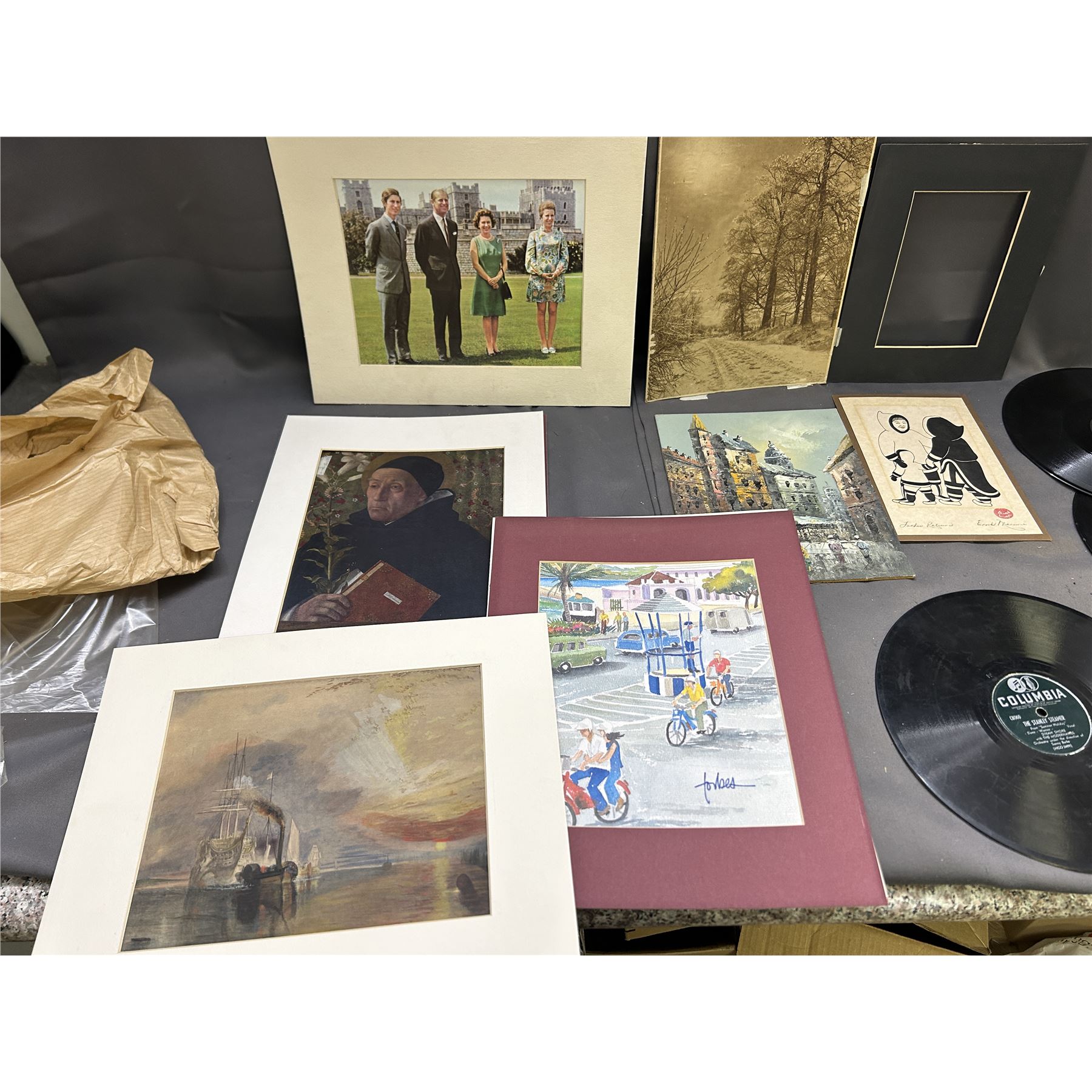 Lot of Assorted 78s Records, Painting, Prints, Royal Family Photo, Indigenous Ink Print, Etc