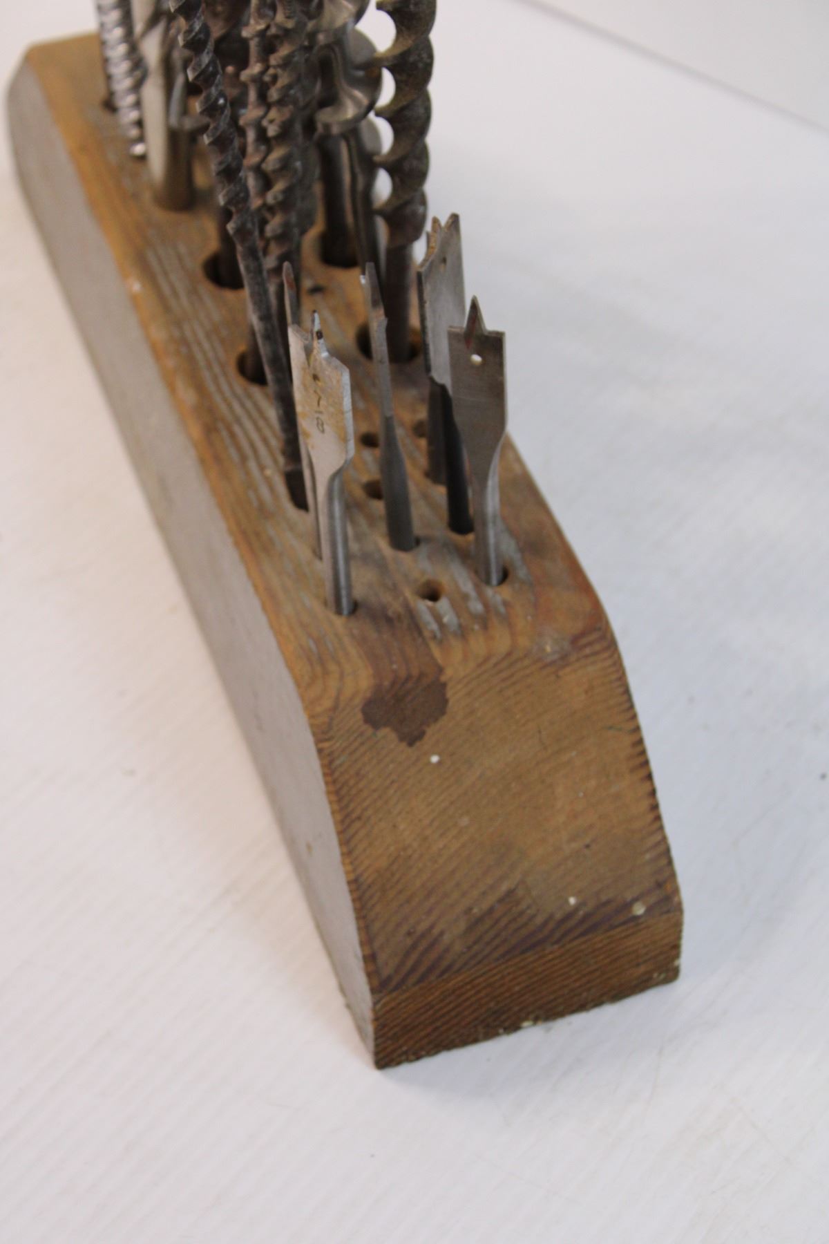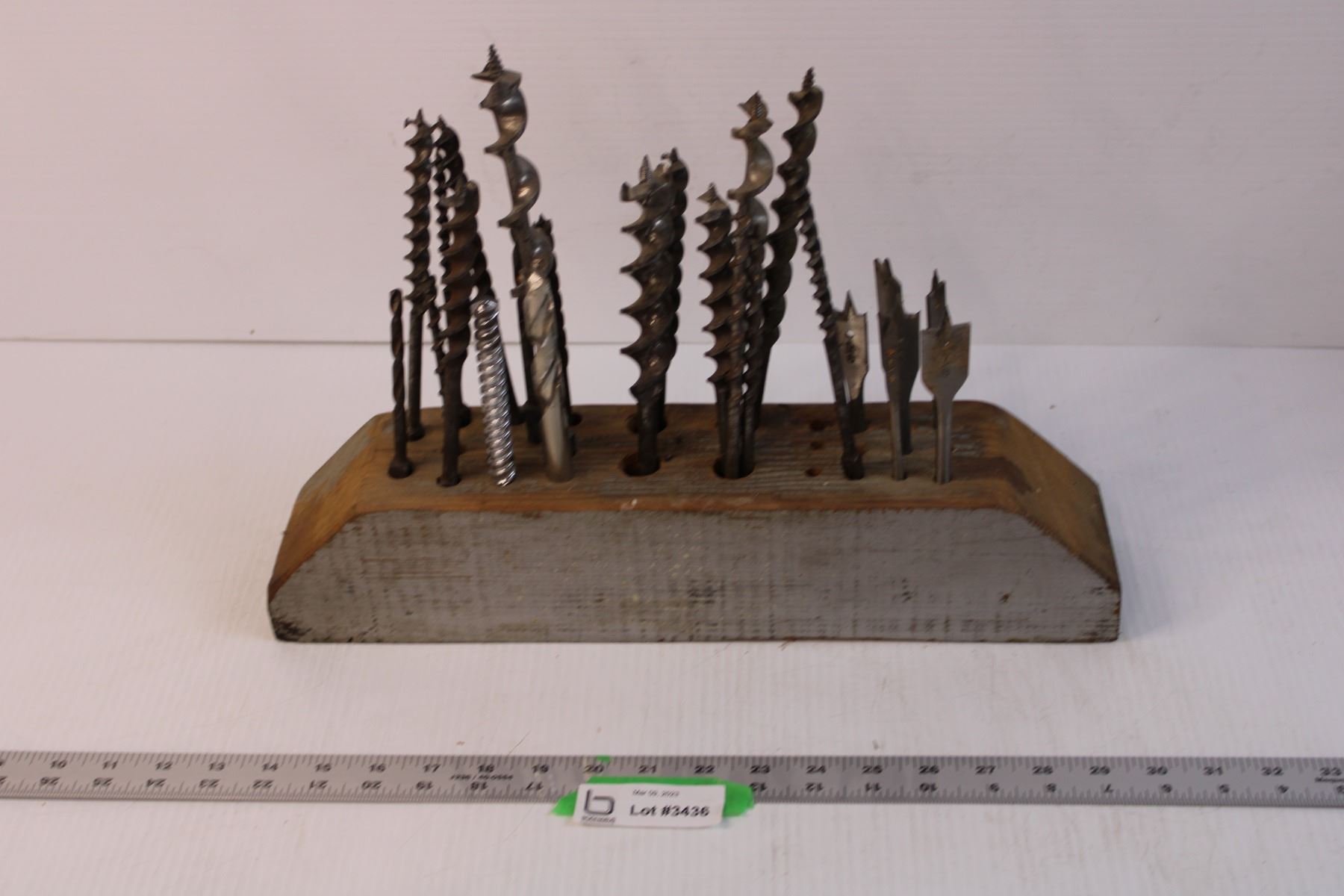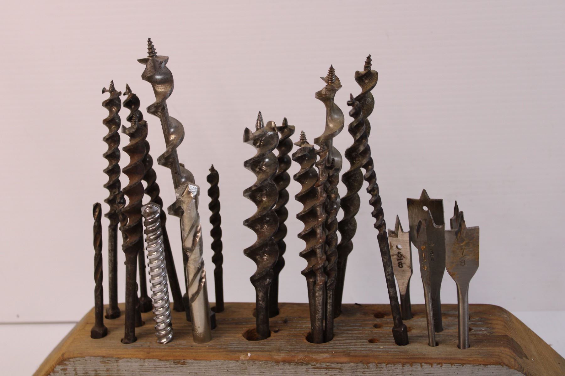 Lot of Assorted Brace Bits with Wooden Holder (Holder is Stained, Some Bits are Rusty)