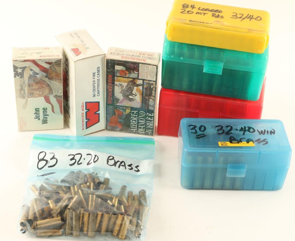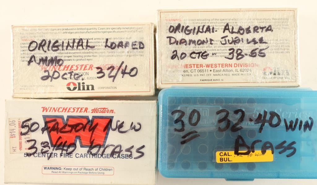 Including 83 rds of 32-20 brass, 50 rds of 32-40 brass, 84 rds of 32-40 reloads, 20 rds of WIN new in box 32-40 ammo, 50 rds of new WIN 38-40 brass, and 20 rds of Alberta Diamond Jubilee 38-55 cartridges.