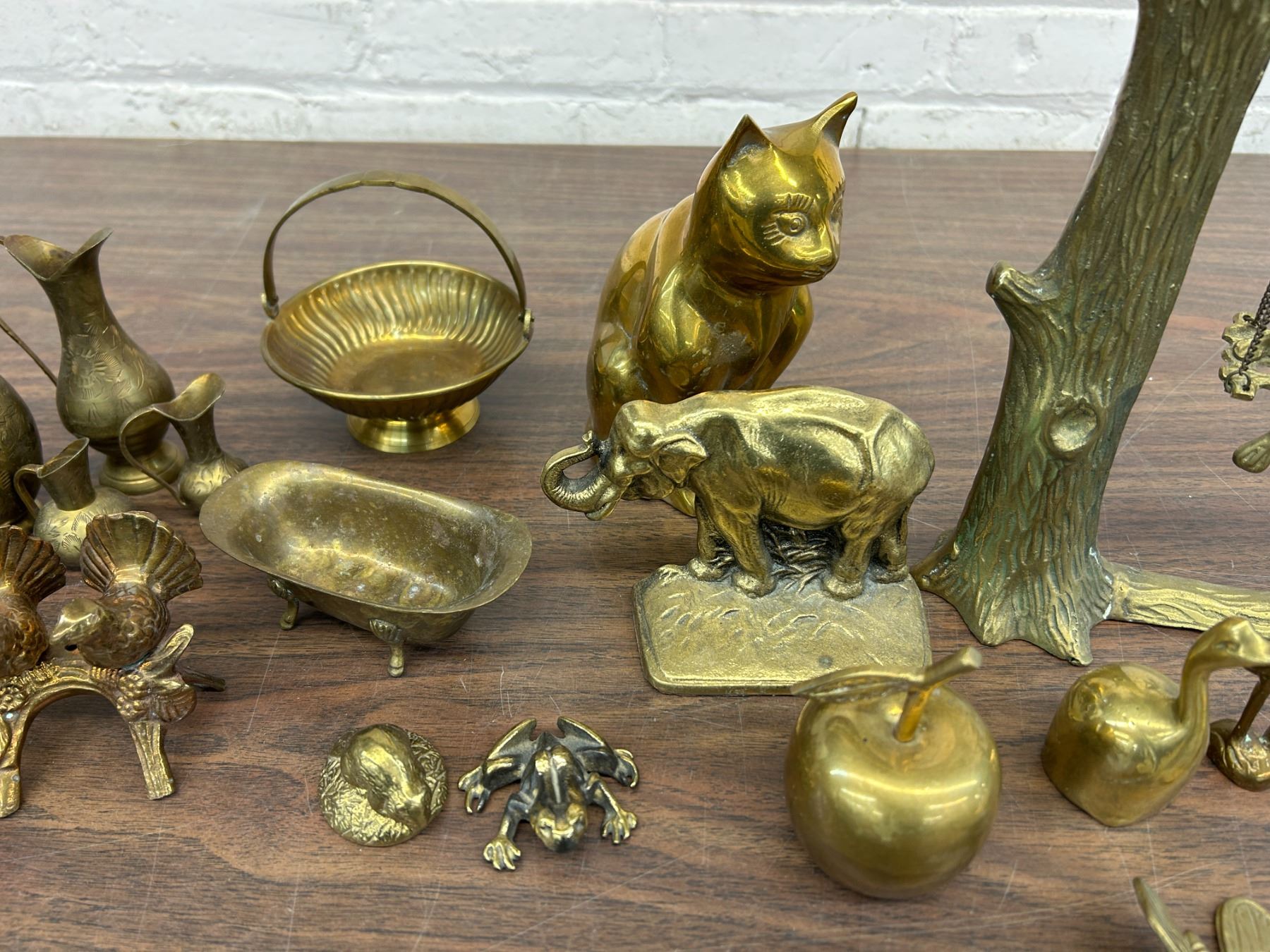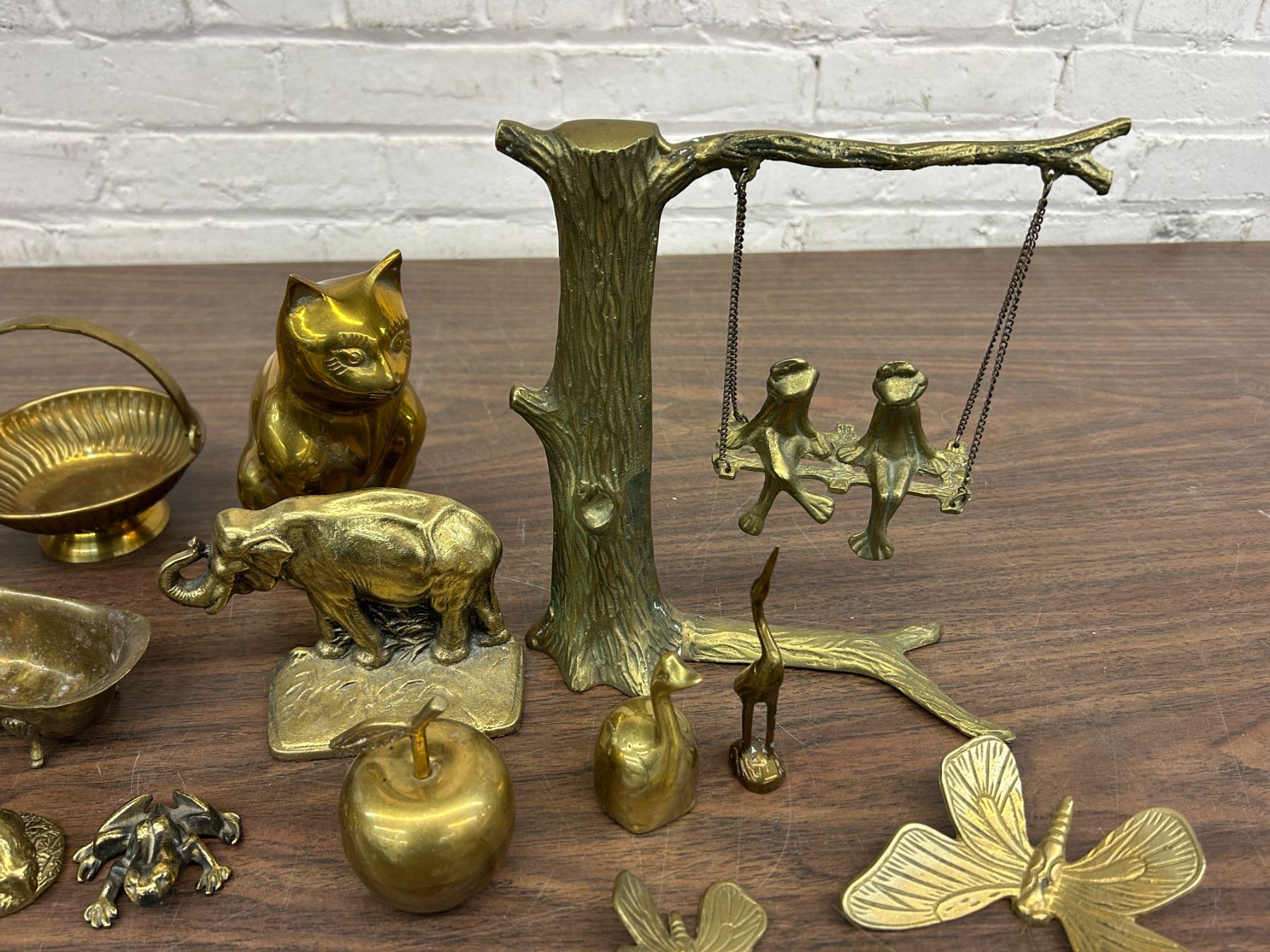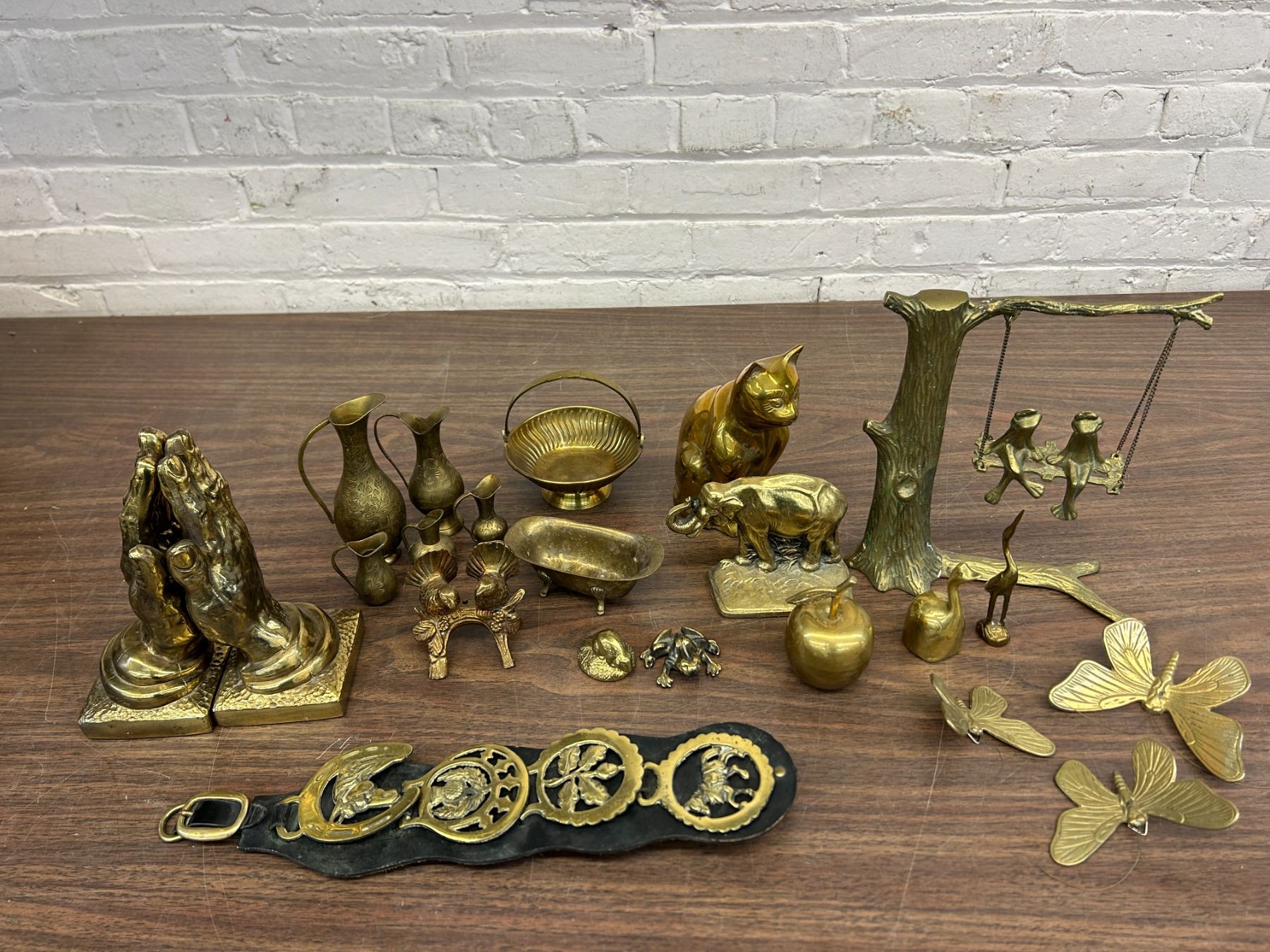Lot of Assorted Brass Figurines, Hand Bookends, Frog, Elephant, Cat, Butterfly, etc