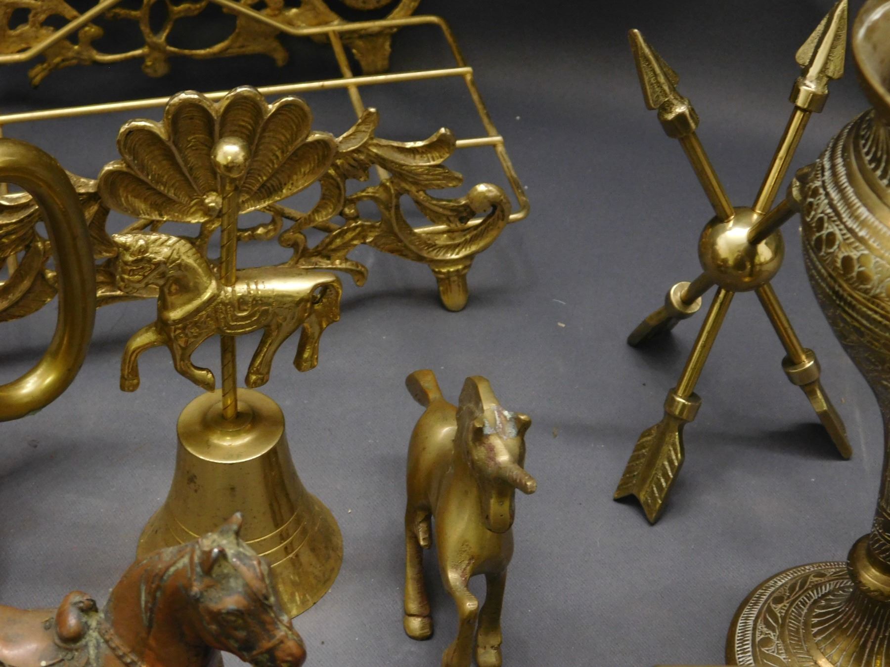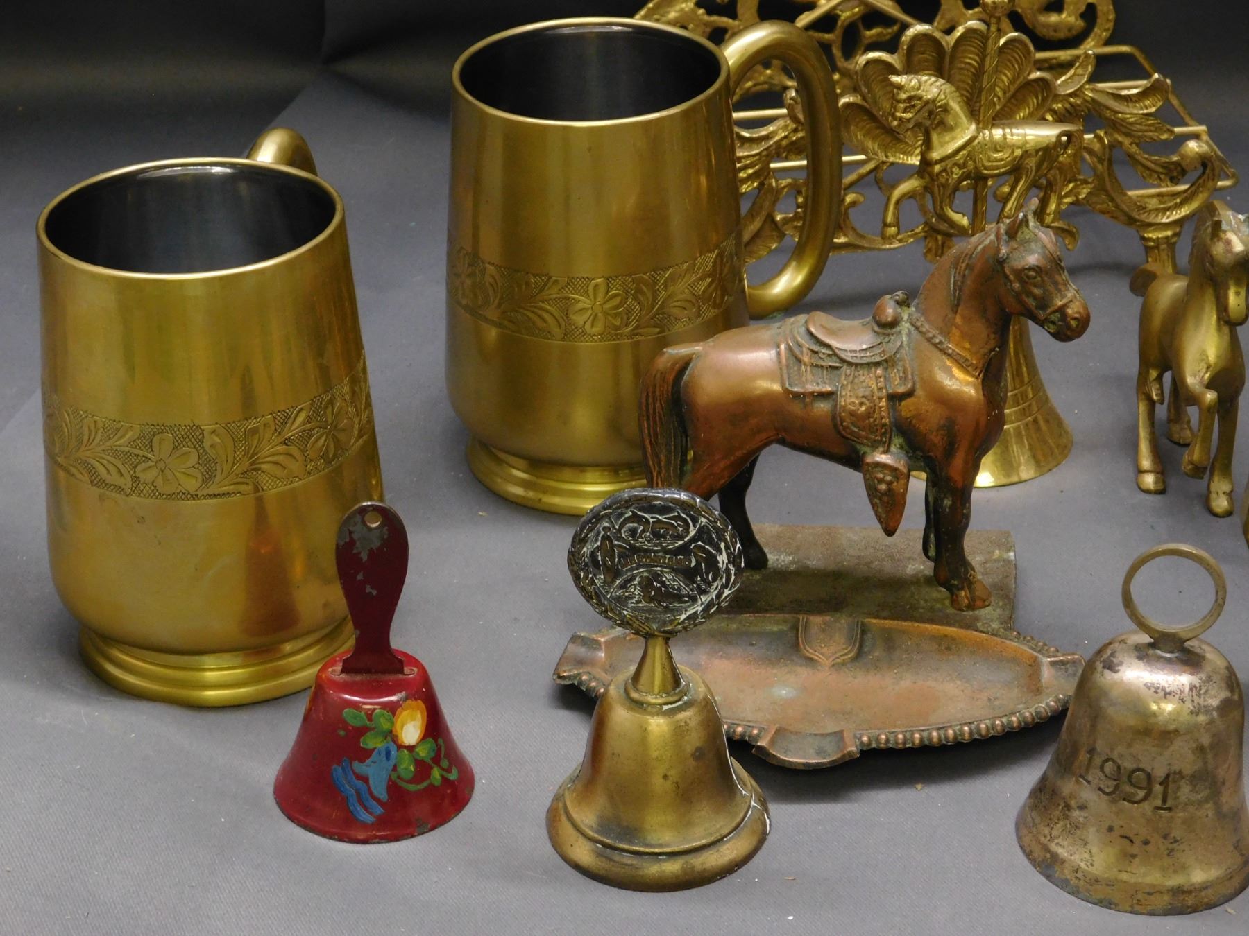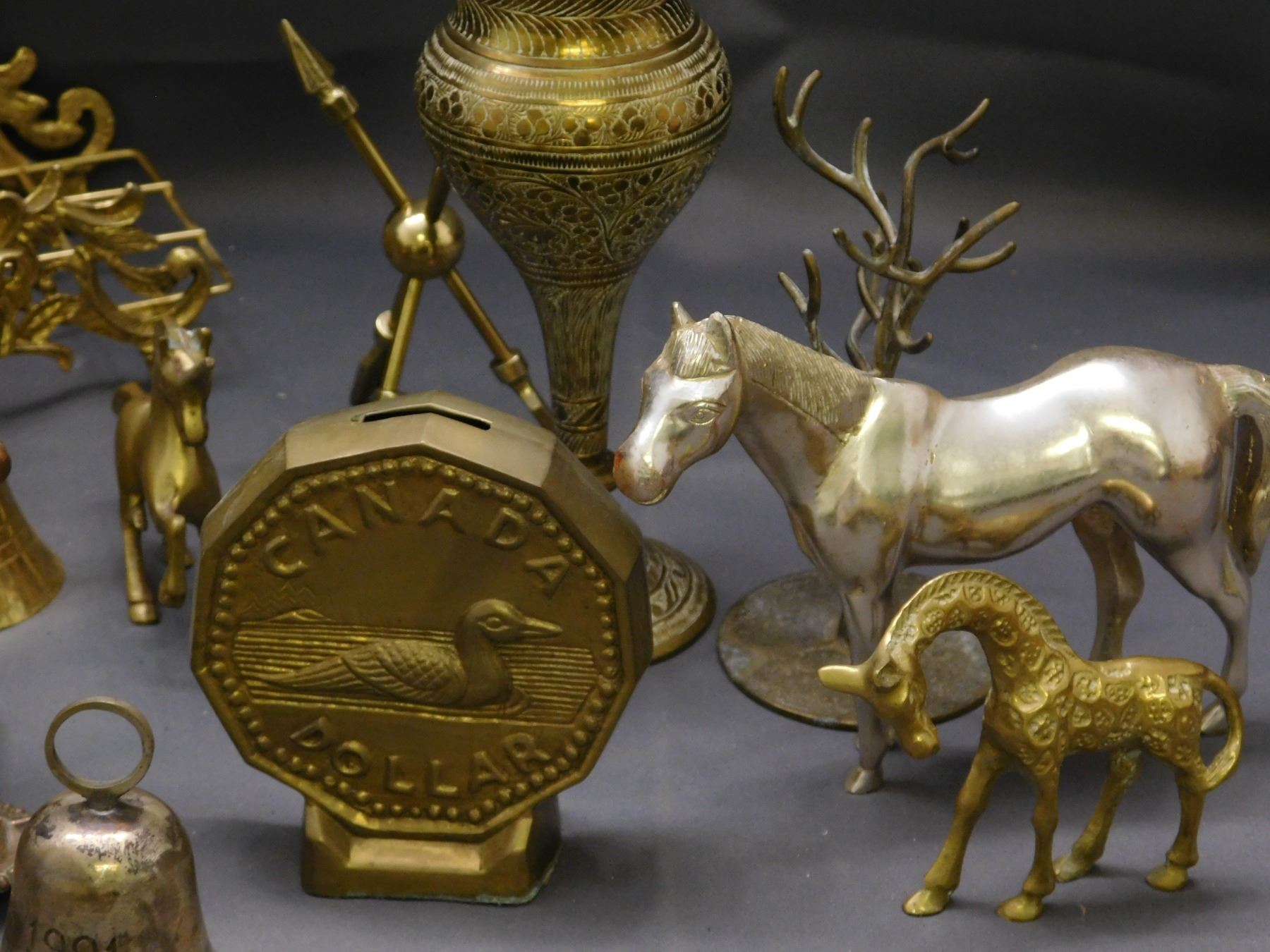 Lot of Assorted Brass Ware Vases, Loonie Coin Bank, Horses, Dinner Bell, Mugs, Etc