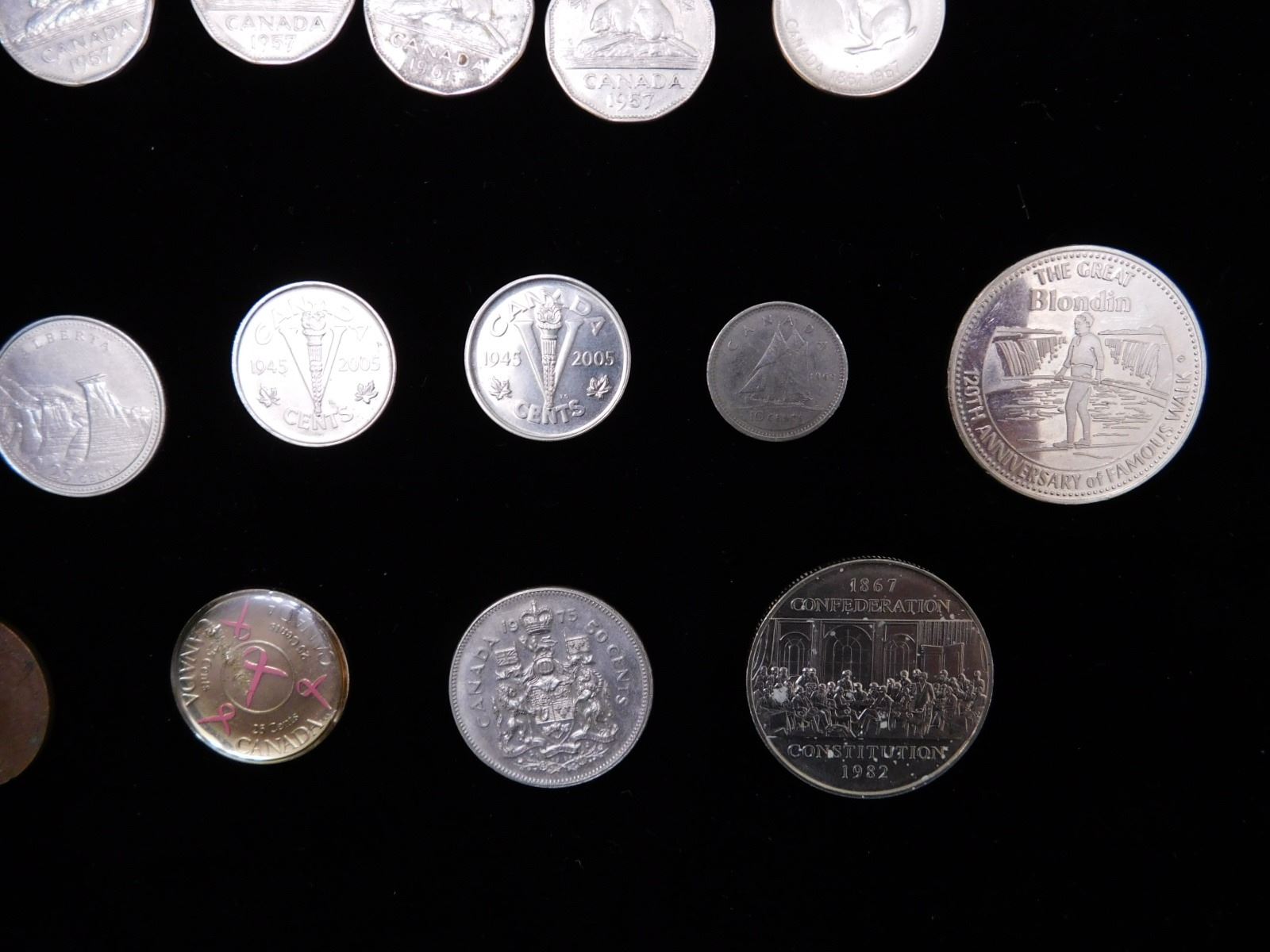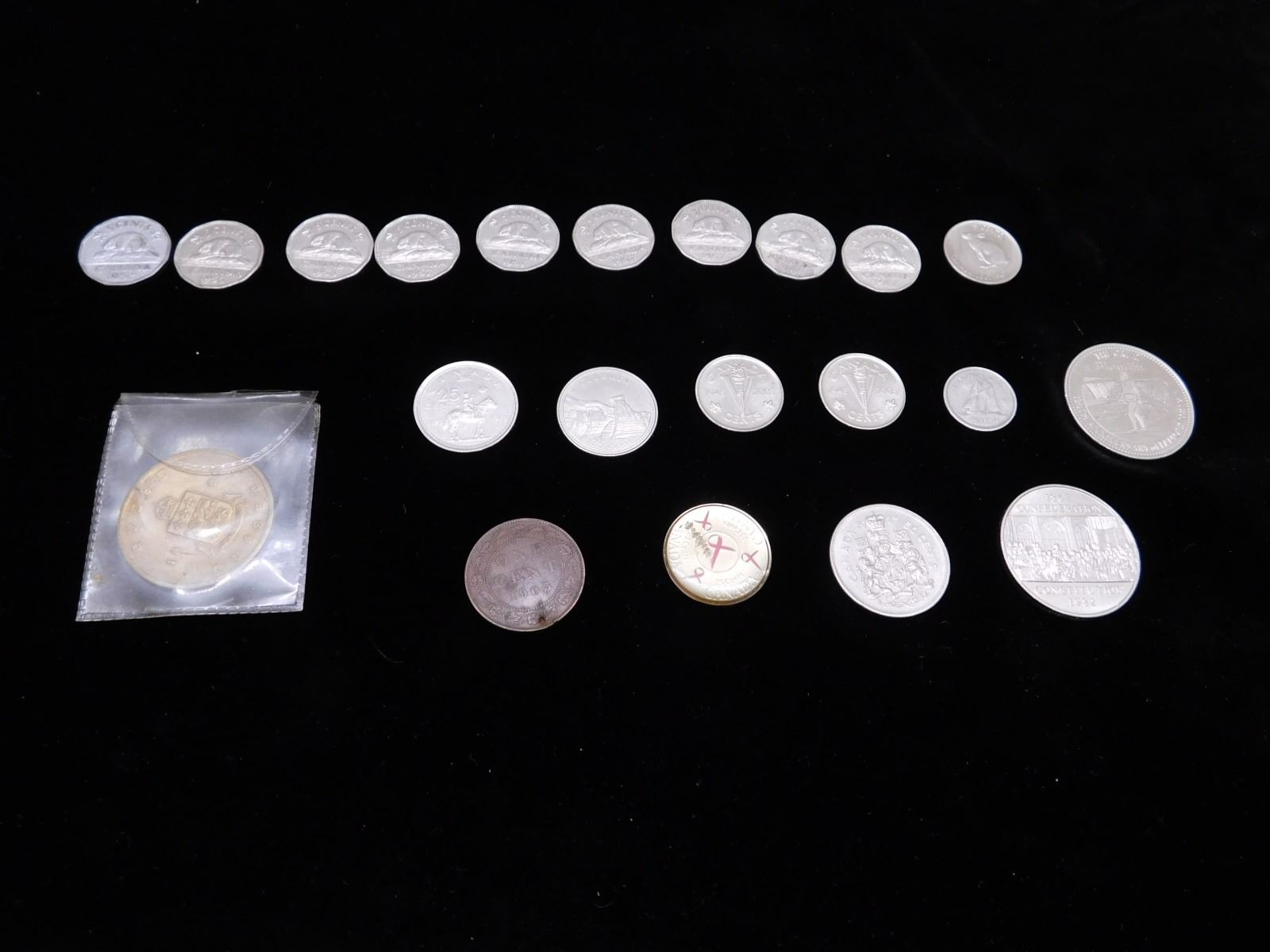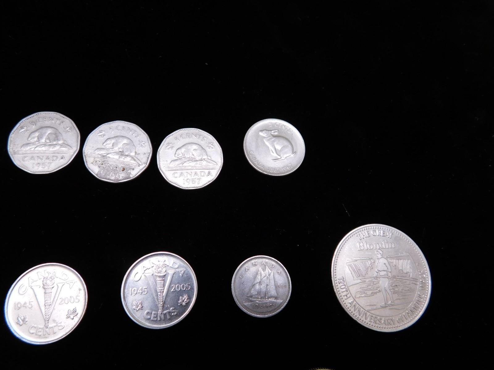 nickels from 1952-67, (2) 2005 commemorative nickels, 1982 silver dollar, 1979 niagra falls trade dollar, 1975 50c piece, 1903 penny, 1973 rcmp quarter, 1867 quebec white garden lily medal