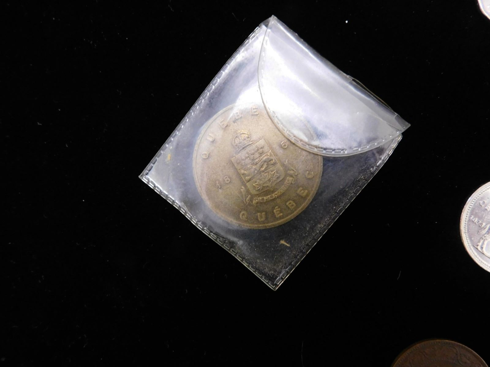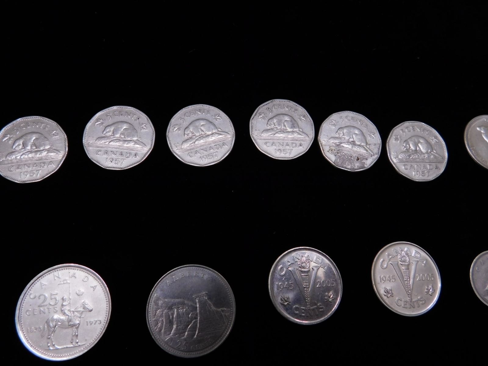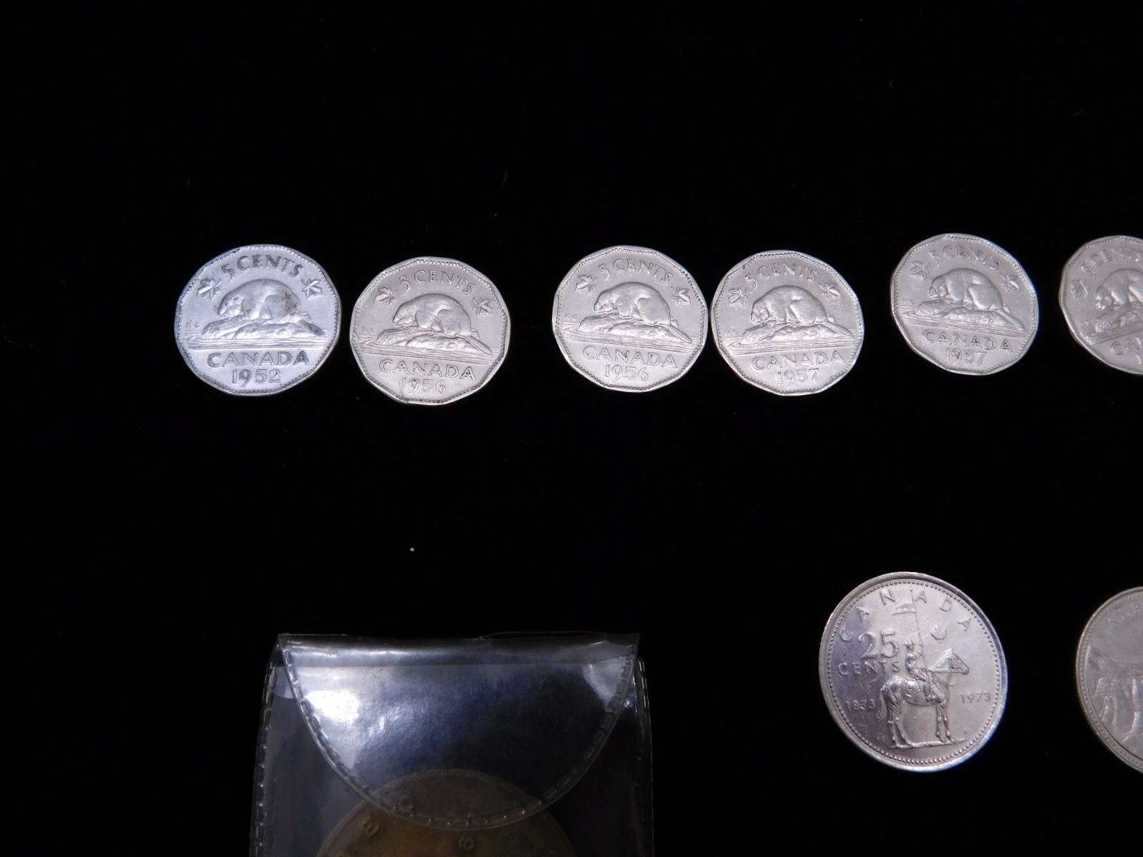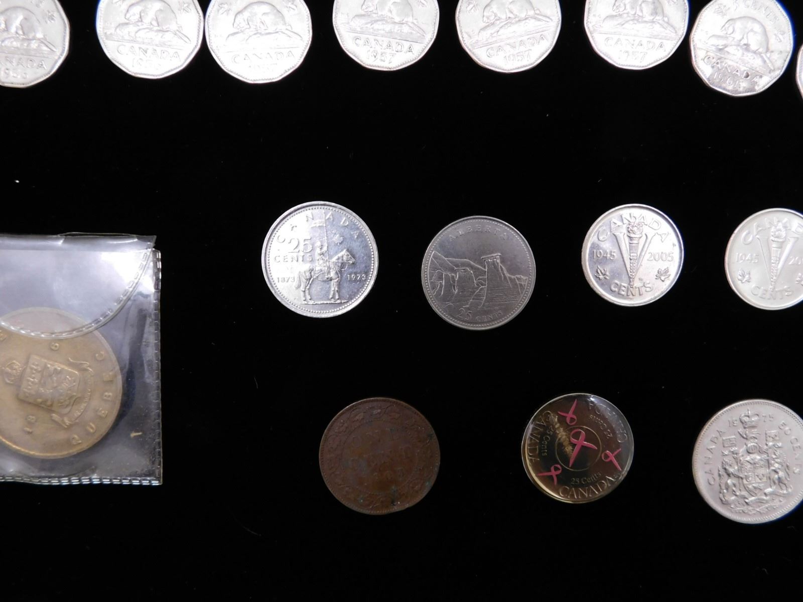 nickels from 1952-67, (2) 2005 commemorative nickels, 1982 silver dollar, 1979 niagra falls trade dollar, 1975 50c piece, 1903 penny, 1973 rcmp quarter, 1867 quebec white garden lily medal