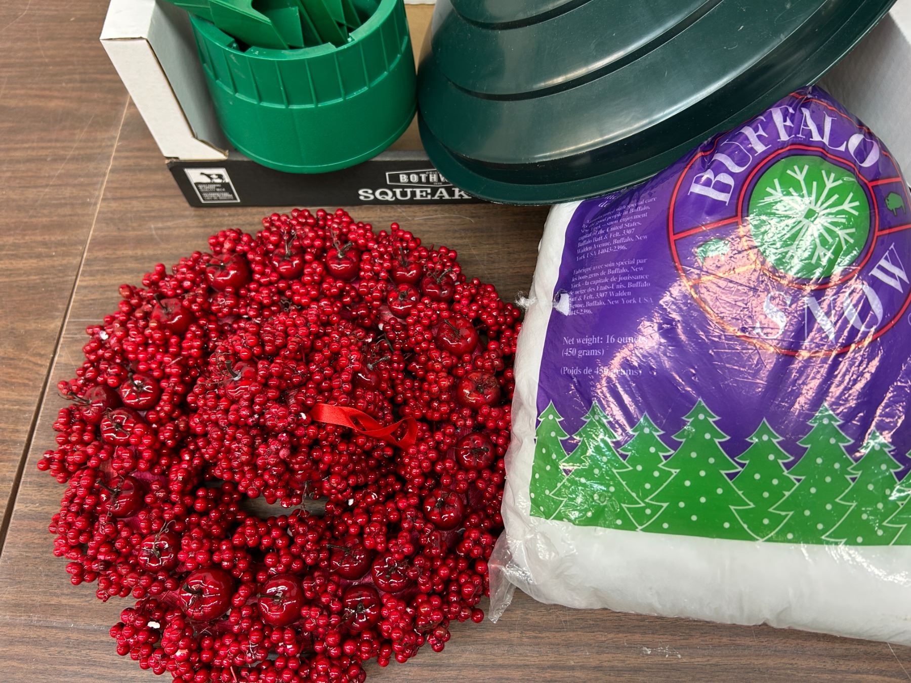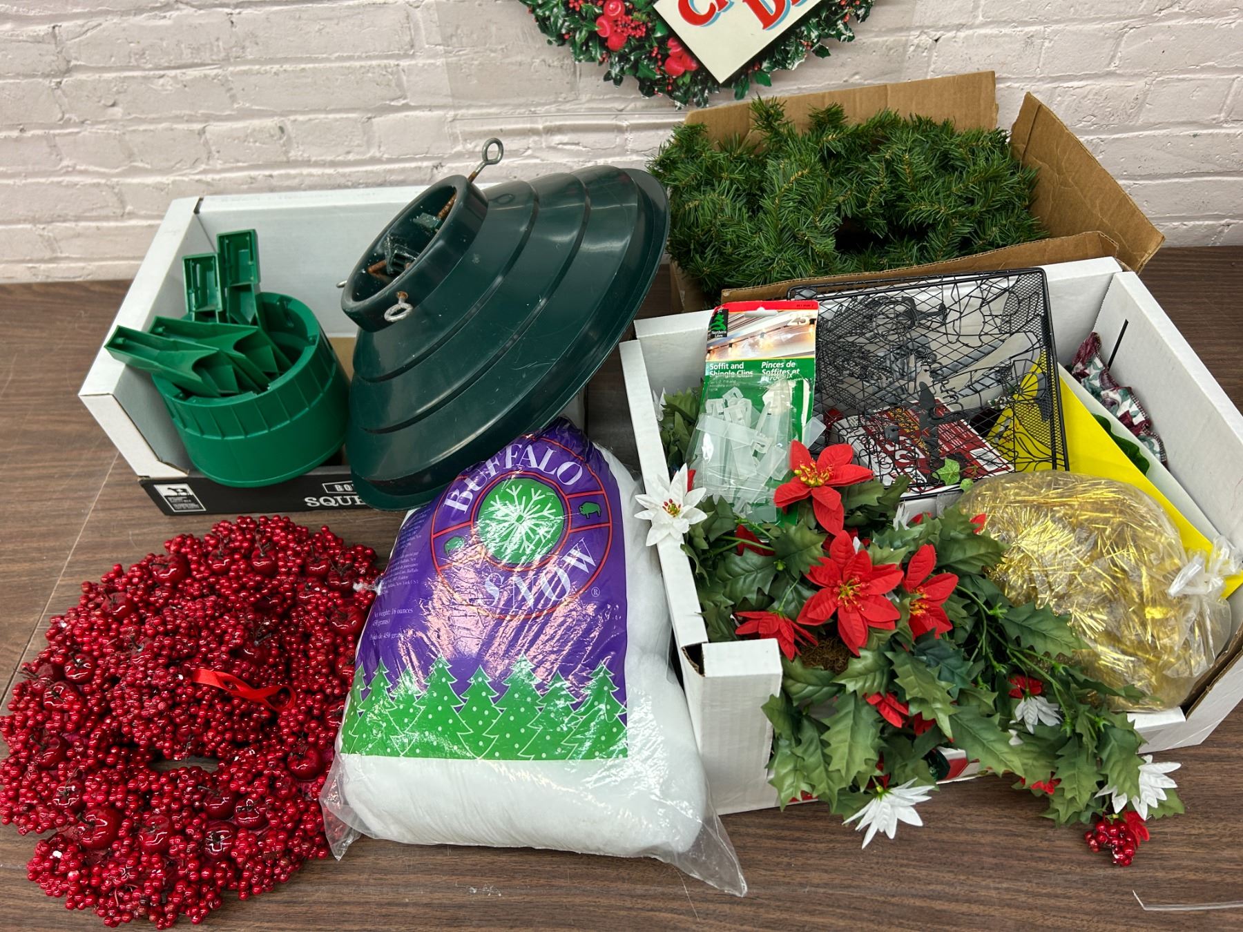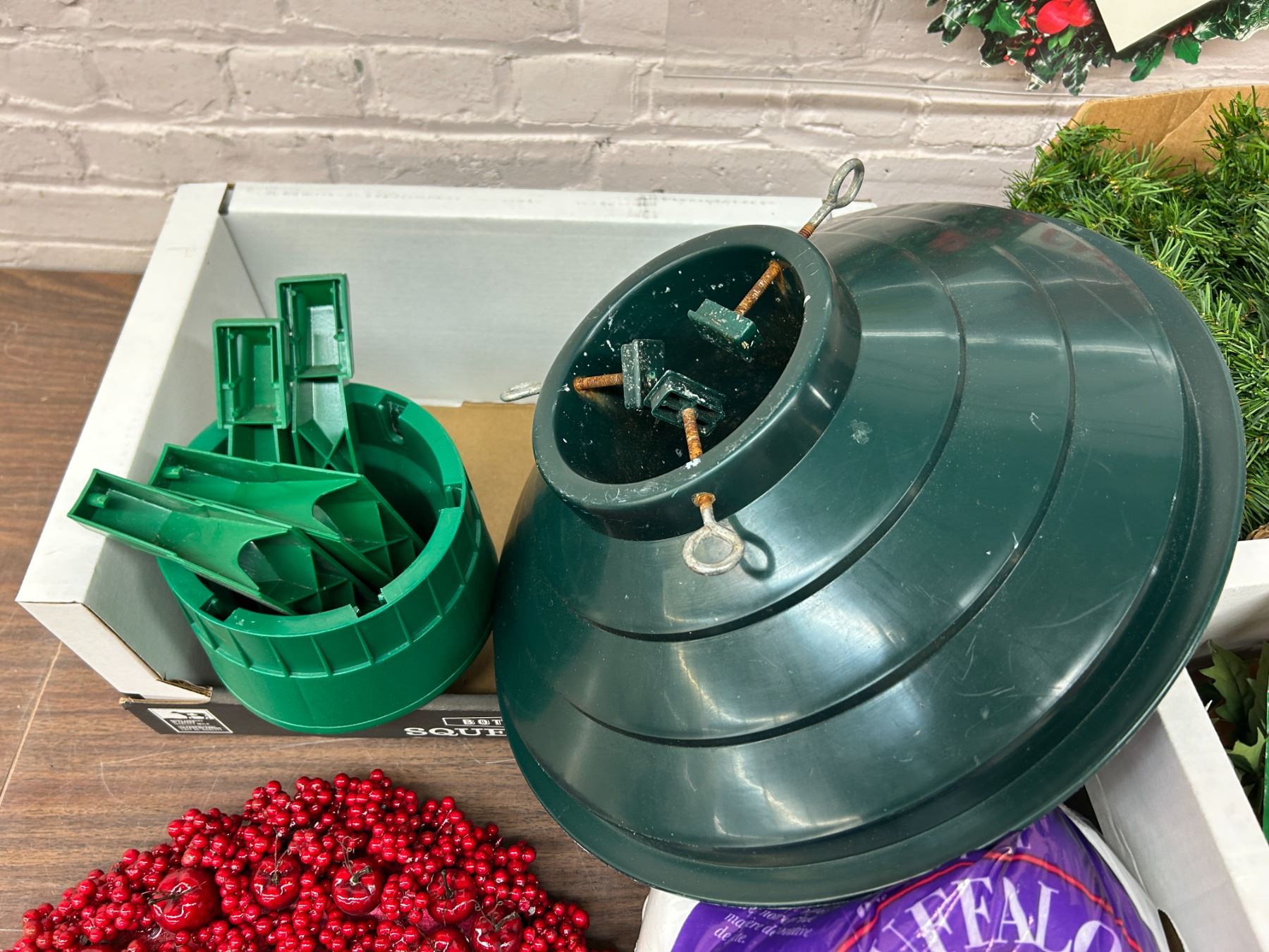 Lot of Assorted Christmas Decor Berry Wreath, Tree Stand, Garland, Etc