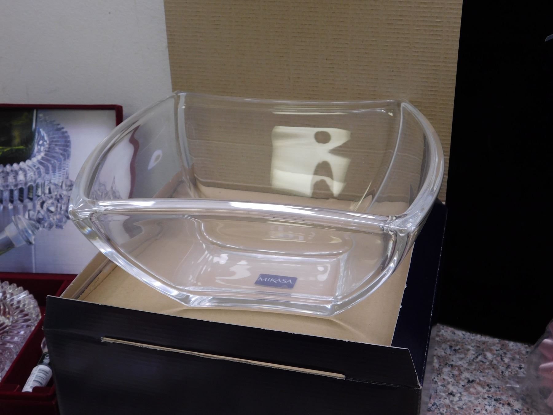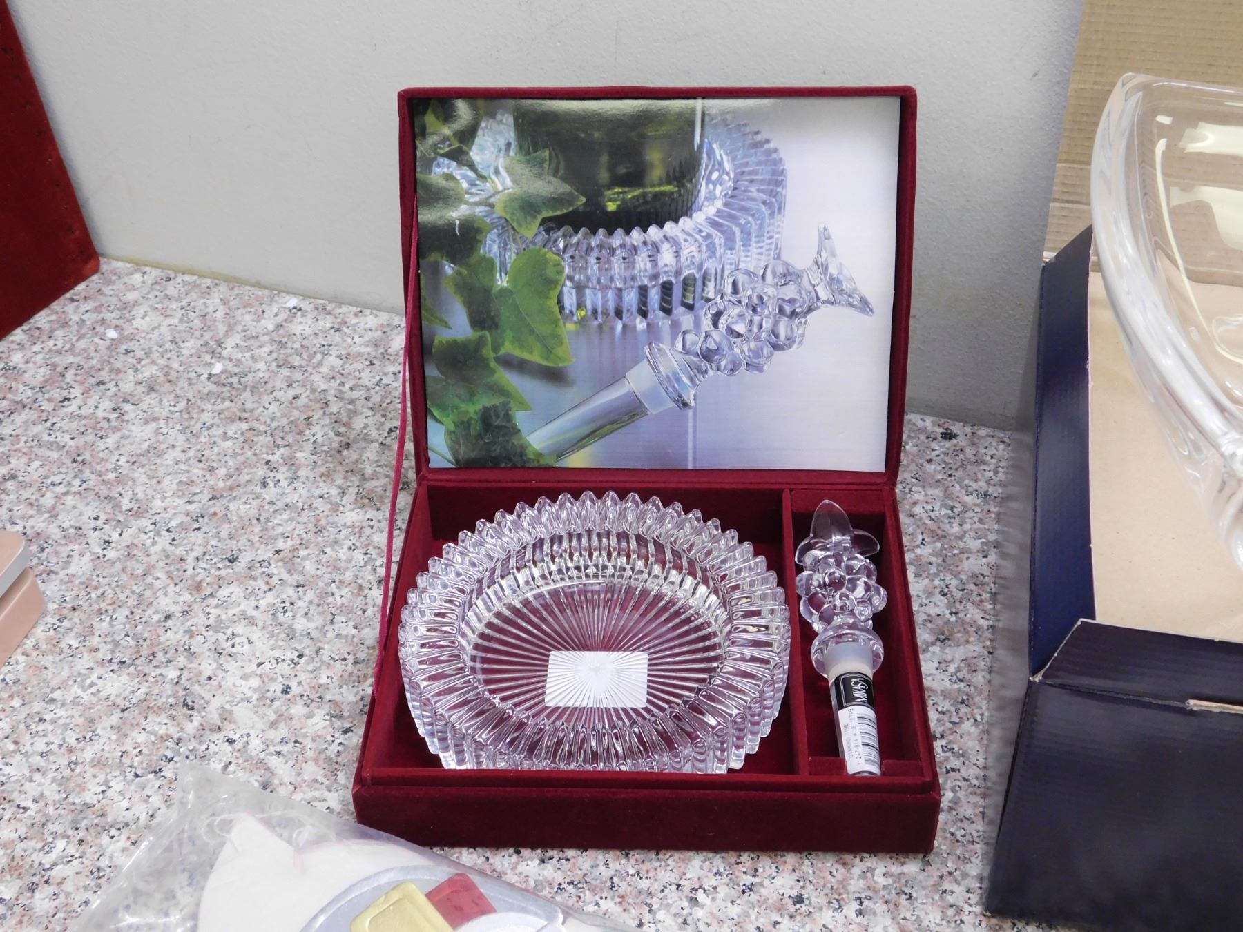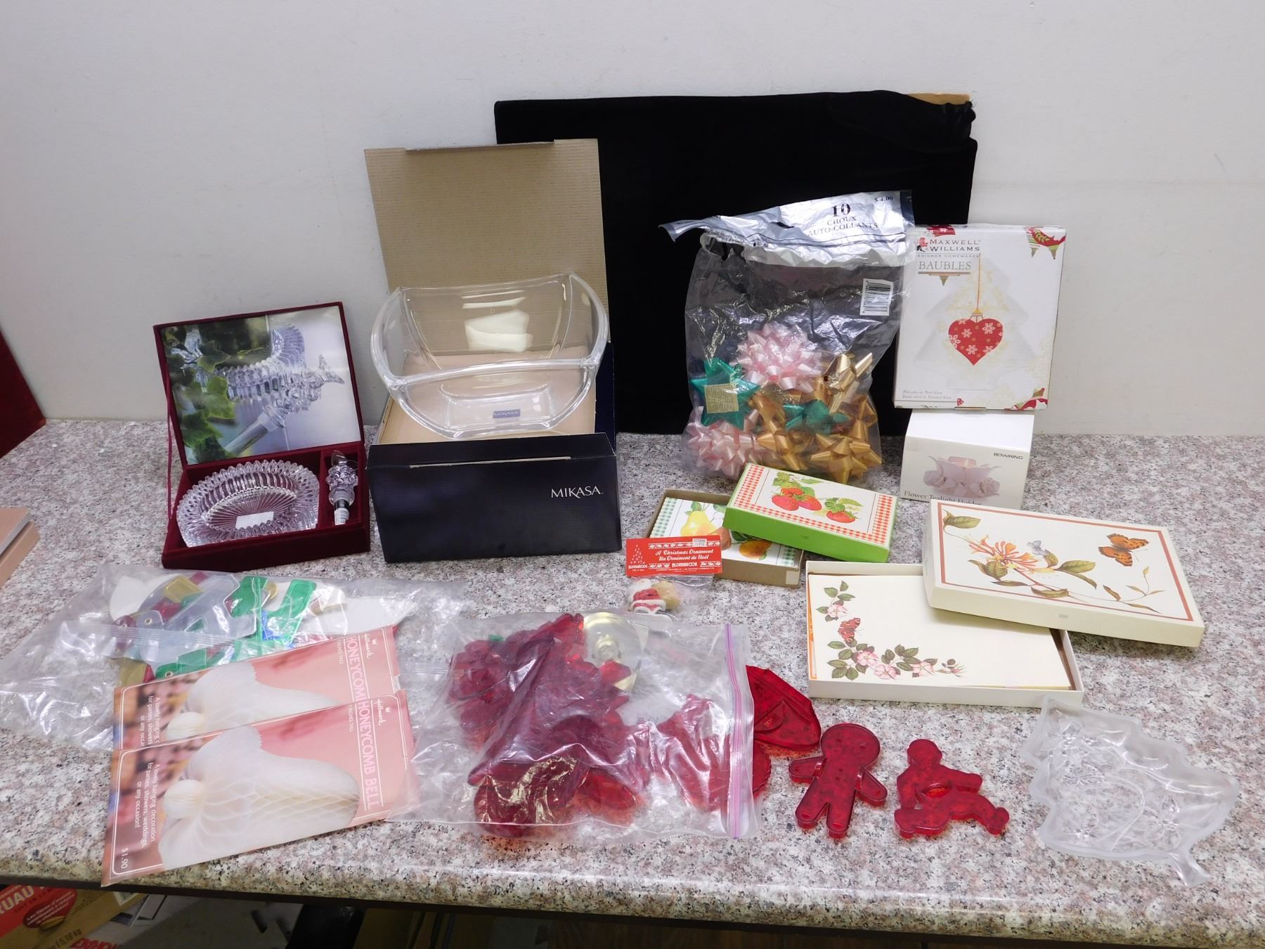 Lot of Assorted Festive Holiday Items Cards, Bows, Serving Bowl, Crystal Wine Set, Baubles, Cookie
