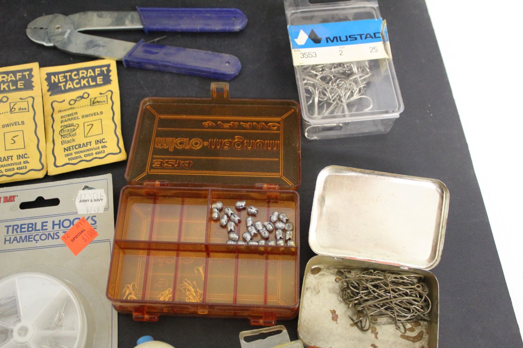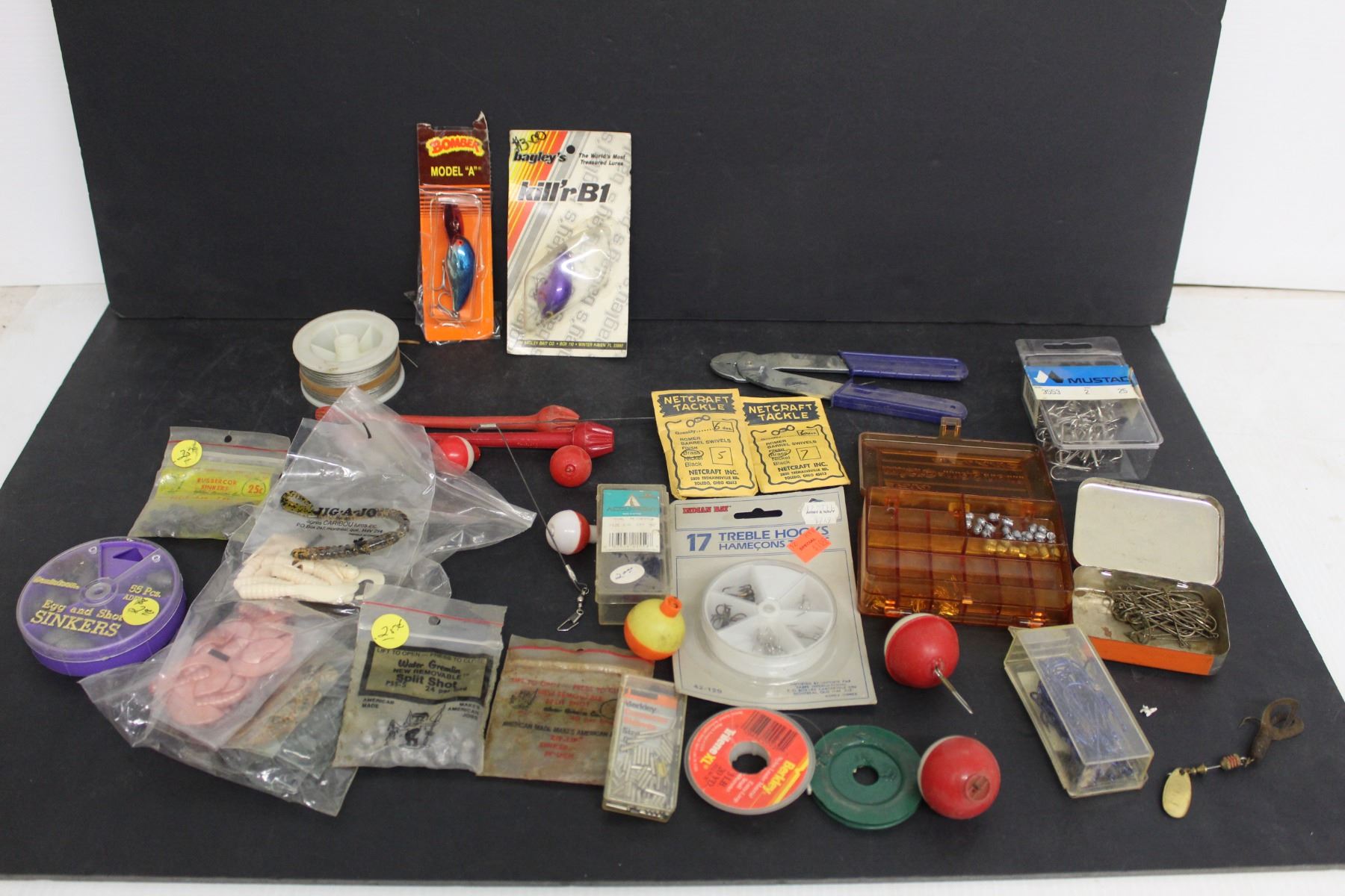 Lot of Assorted Fishing Items - J-Hooks, Treble Hooks, Lone Tail Bait, Line Weights