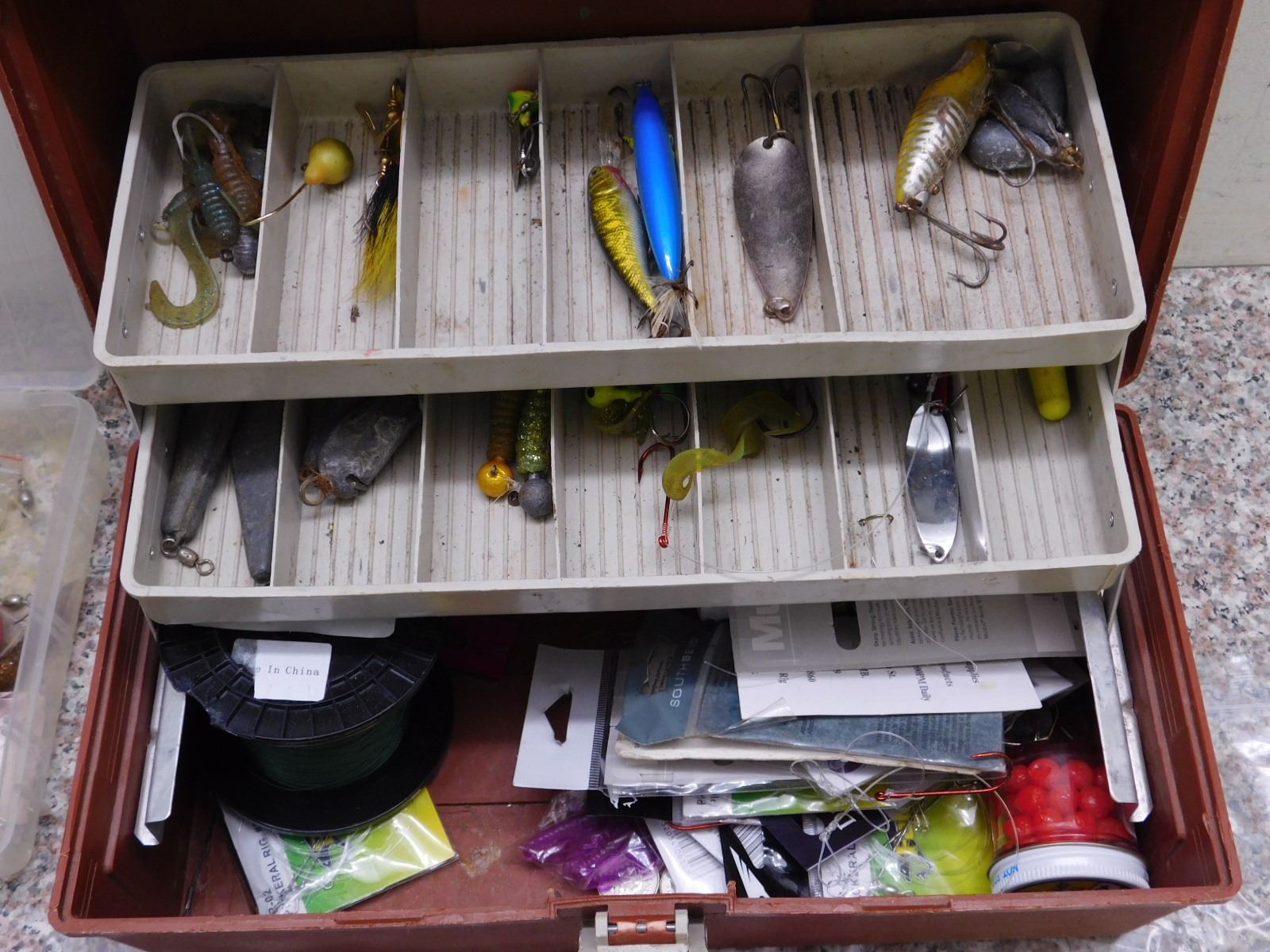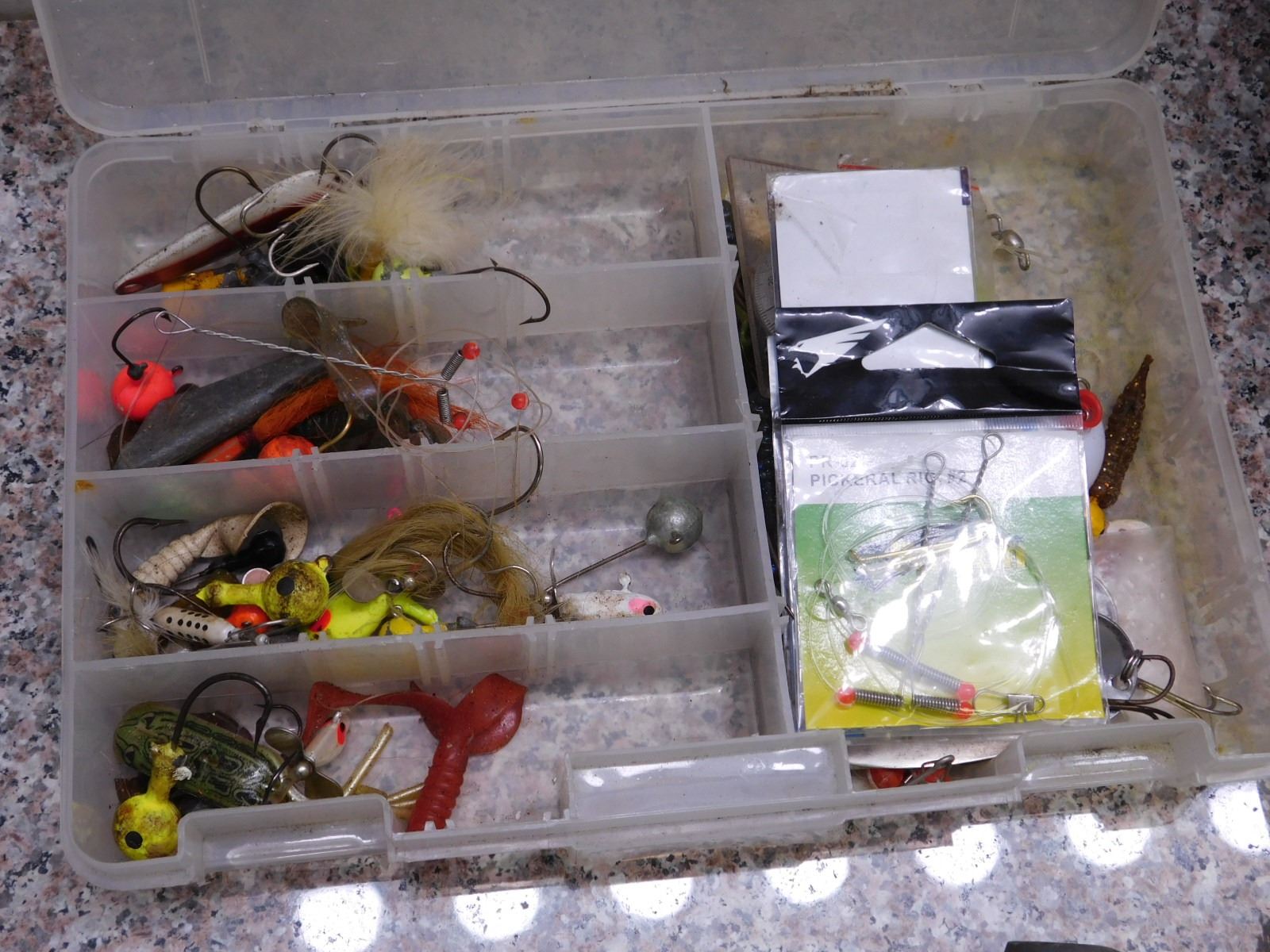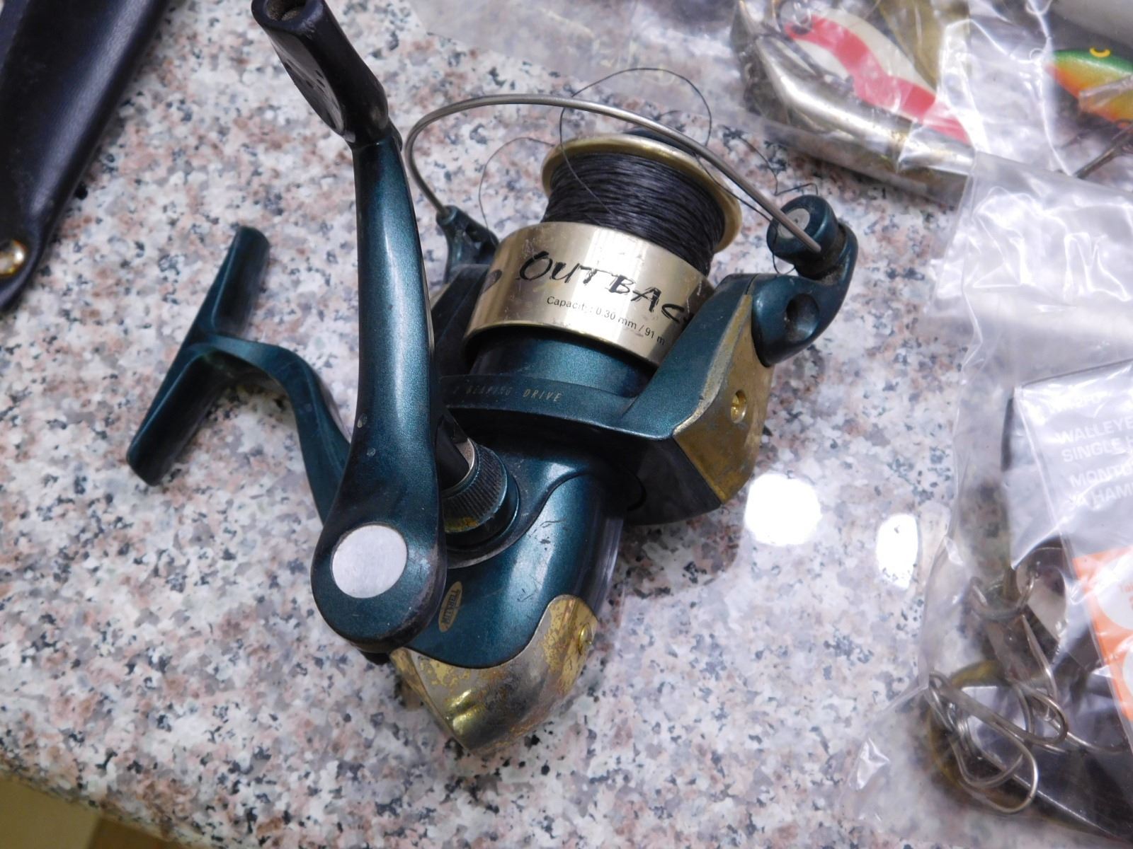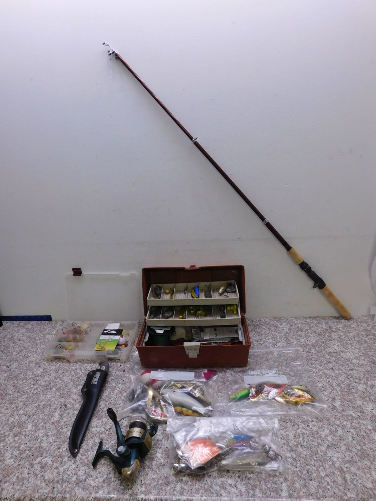 Lot of Assorted Fishing Lures, Supplies, Tackle Box, Proton Rod and Outback Fishing Reel, Knife, Etc