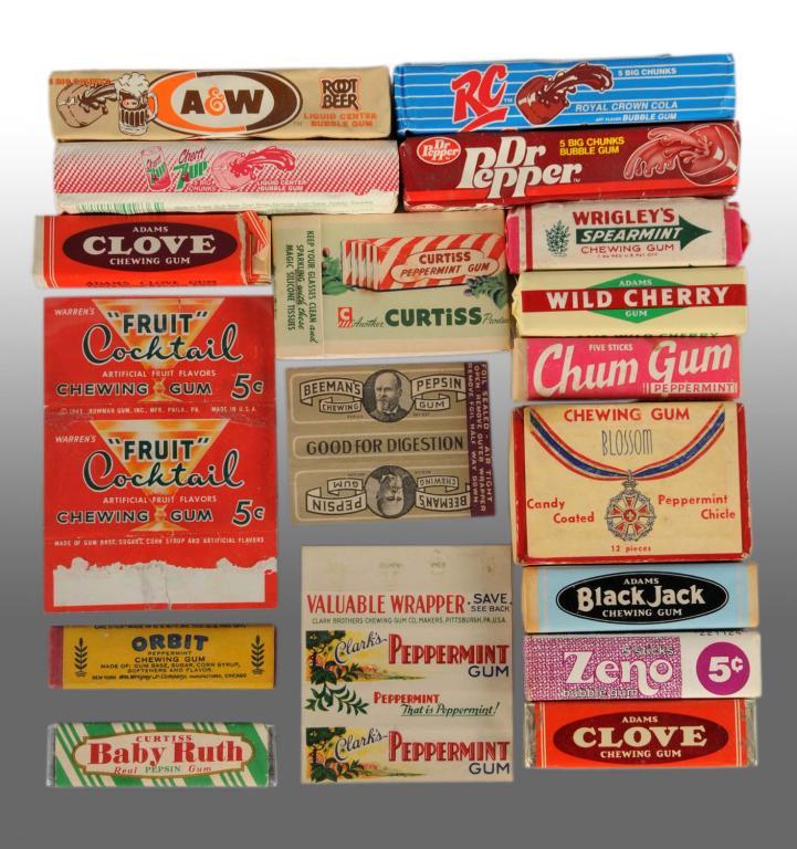 Description Includes items for Wrigley's Gum, Dr. Pepper, RC Cola, A & W, Cherry 7-Up, Clove, "Fruit" Cocktail, Curtiss, Chum Gum, Blossom, Beeman's, Orbit, Baby Ruth, Clark's, Black Jack, and Zeno. Staining and tearing throughout with overall wear in various sizes. Condition (Good - Excellent).