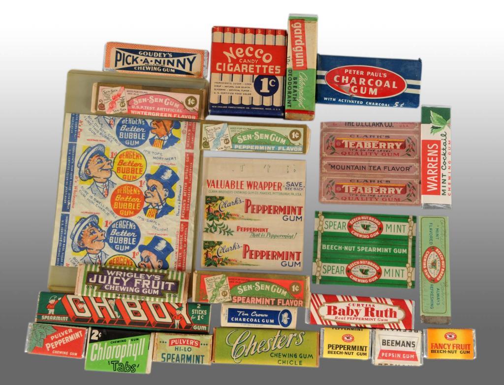 Description Includes Necco candy cigarettes, Clark's Peppermint wrapper, Teaberry wrapper, Beech-Nut wrapper, full pack of Guard Gum, Bergen's Better Bubble Gum, Pulver's gum stick, Oh Boy Gum stick, Warrens, Juicy Fruit, Sen-Sen, Charcoal Gum, Chlorophyll, free sample Baby Ruth Gum, Chester's Chewing Gum Chiclets, and an assortment of other gum wrappers, all in various sizes. Condition (Very Good - Excellent).