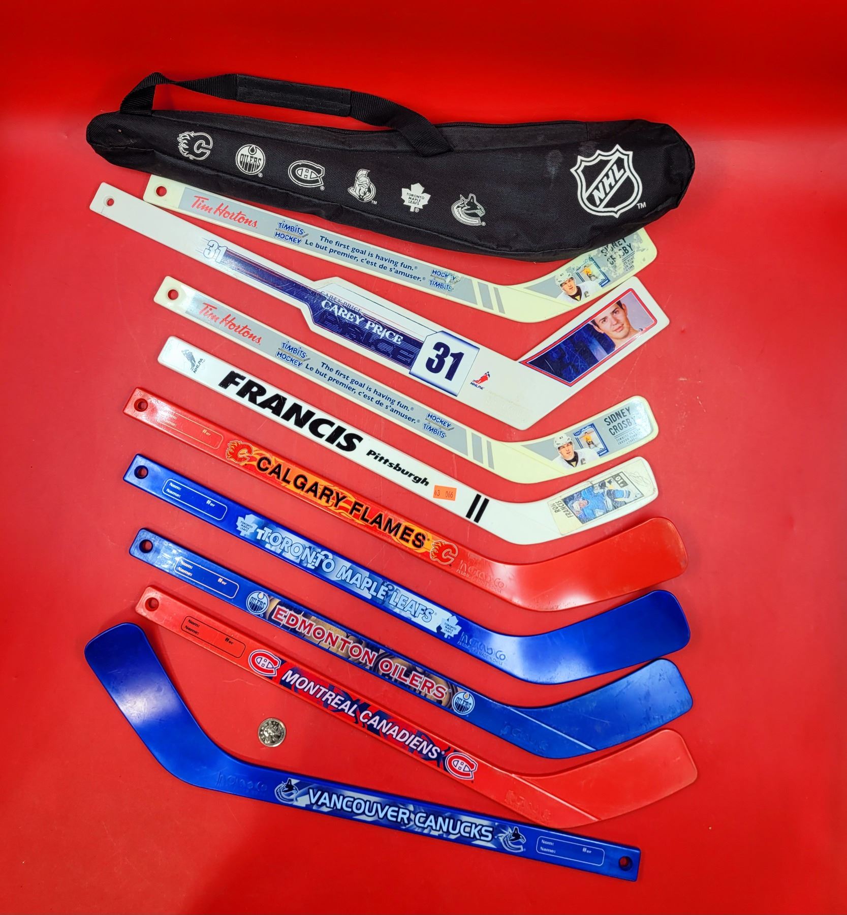 Lot of Assorted Mini Hockey Sticks w/ Case (Maple Leafs, Canucks, Flames, Oilers, etc.)