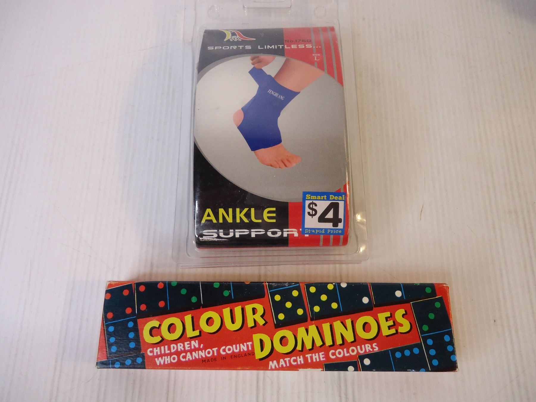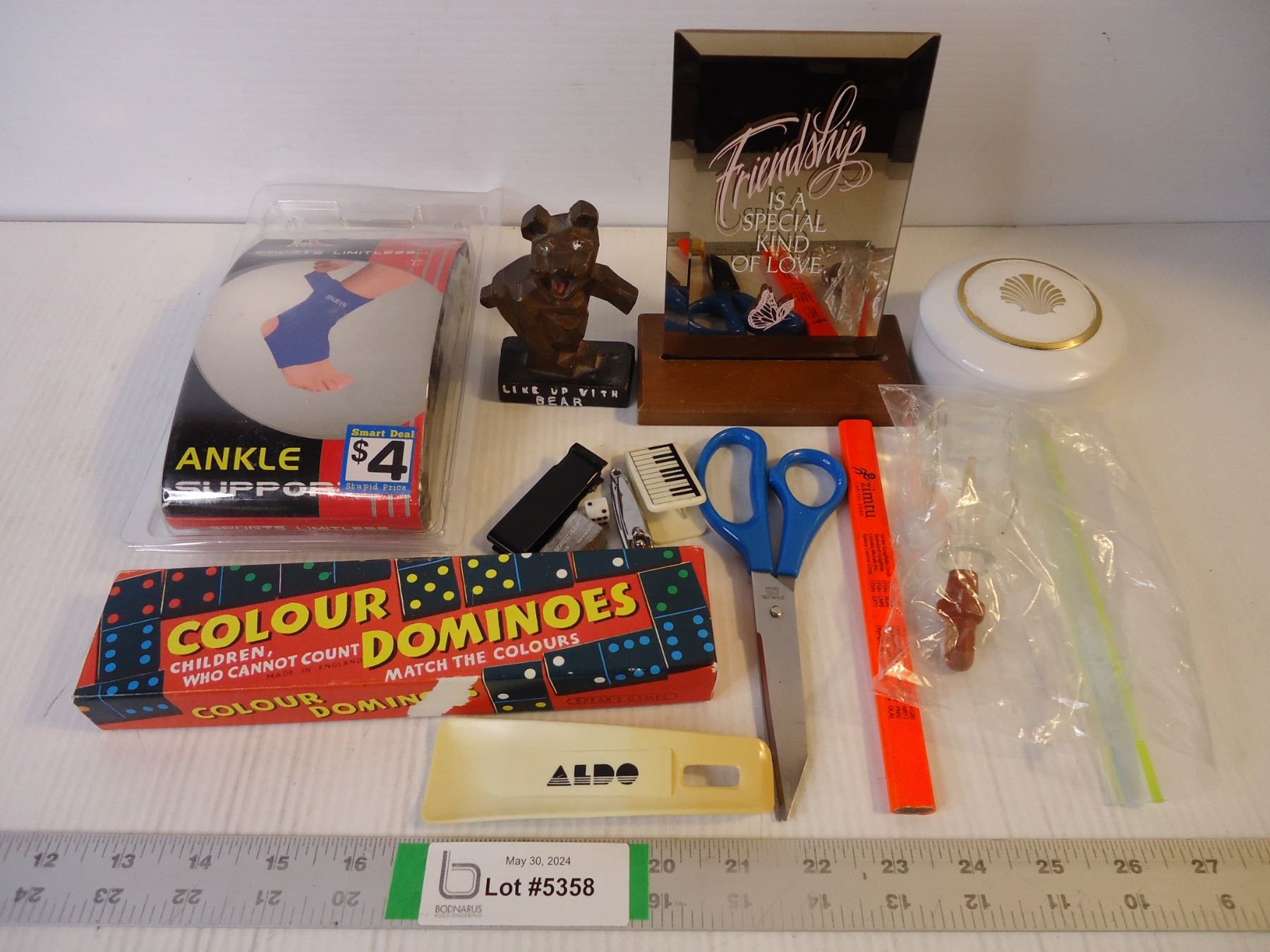 Lot of Assorted Misc. items as pictured including ankle support, Ornaments, Dominos and more