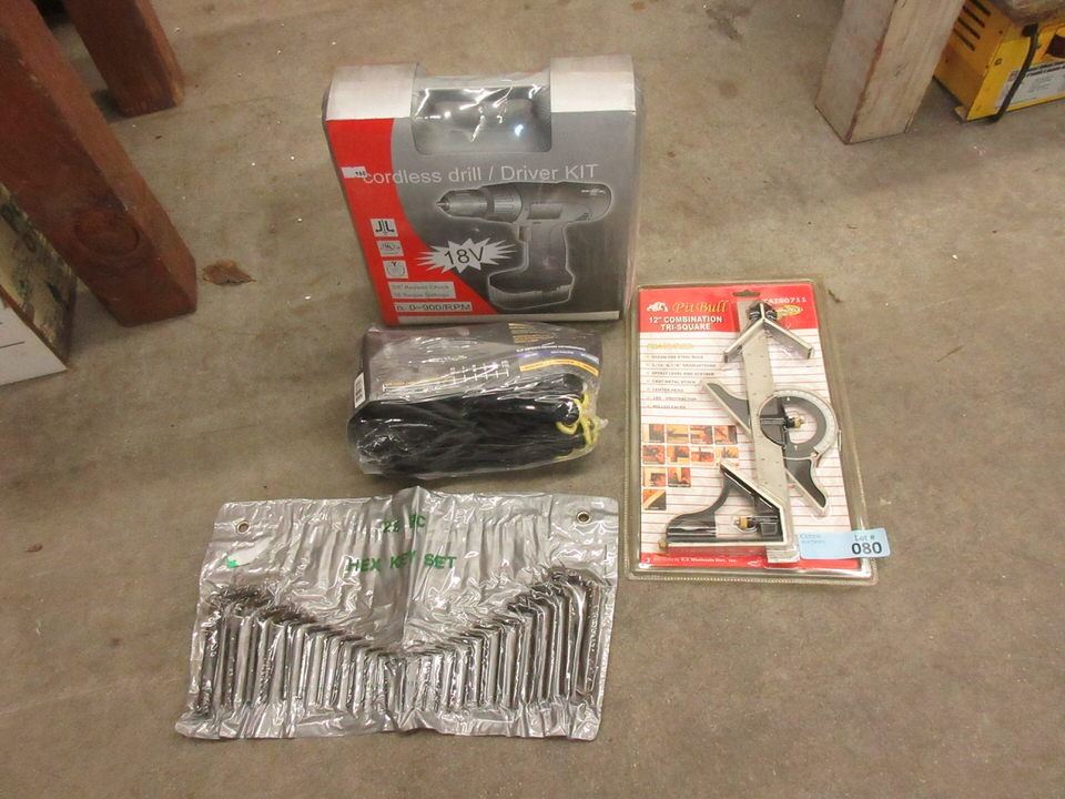 Combination square., cordless drill, 12 pair of gloves & 225 piece allan key sets.