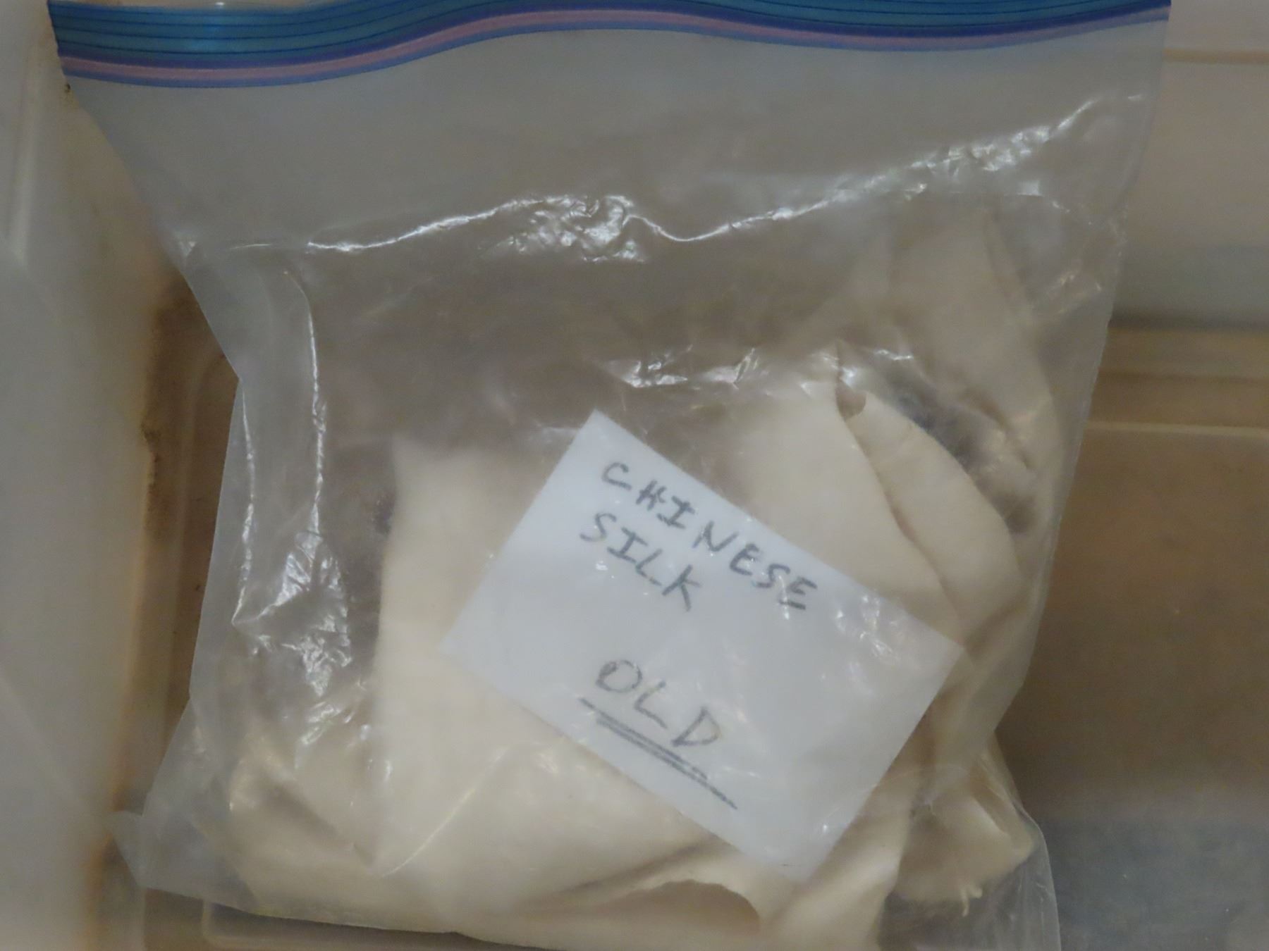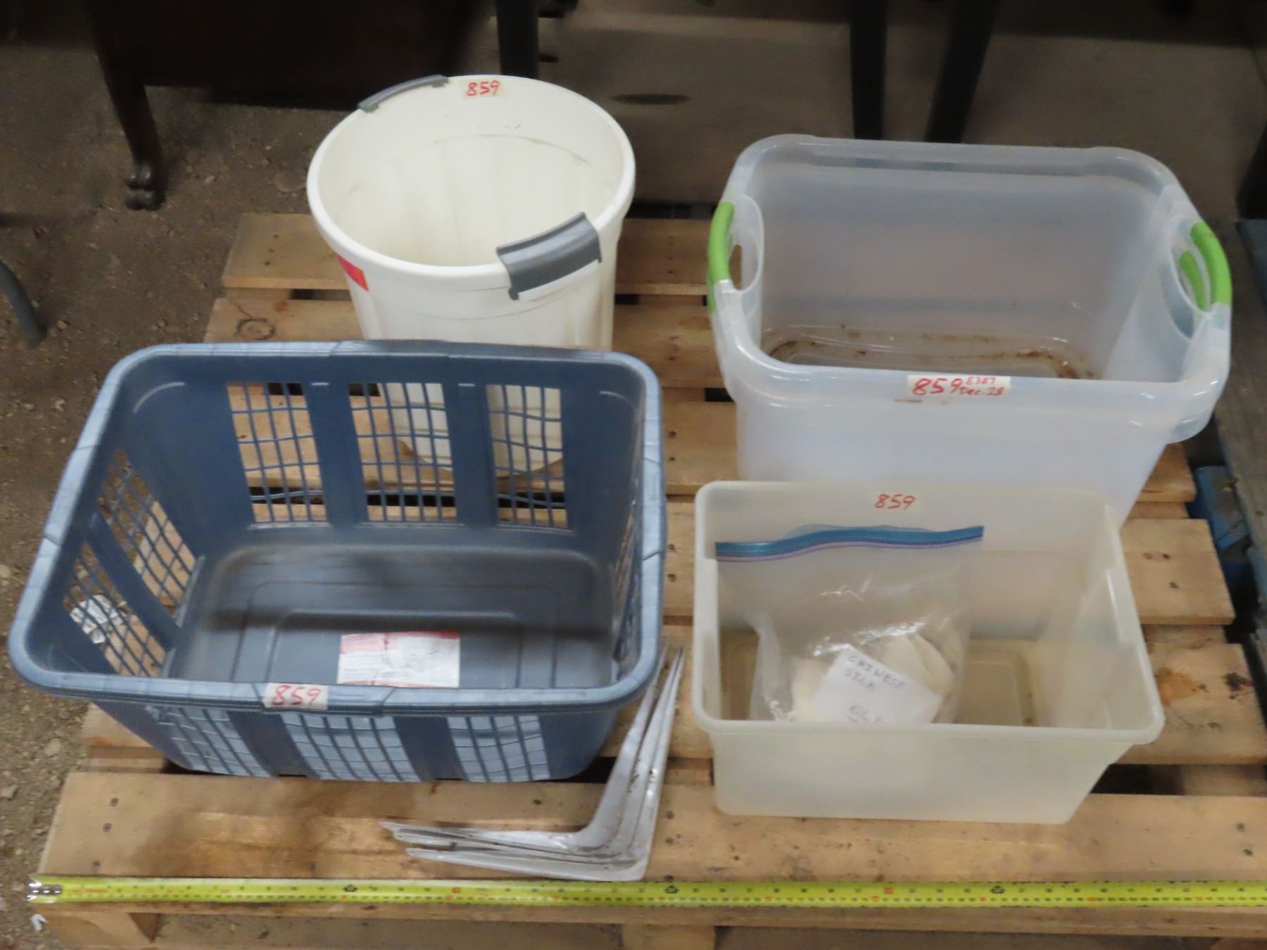 Lot of Assorted Plastic storage containers + Chinese Silk + 3 White metal brackets