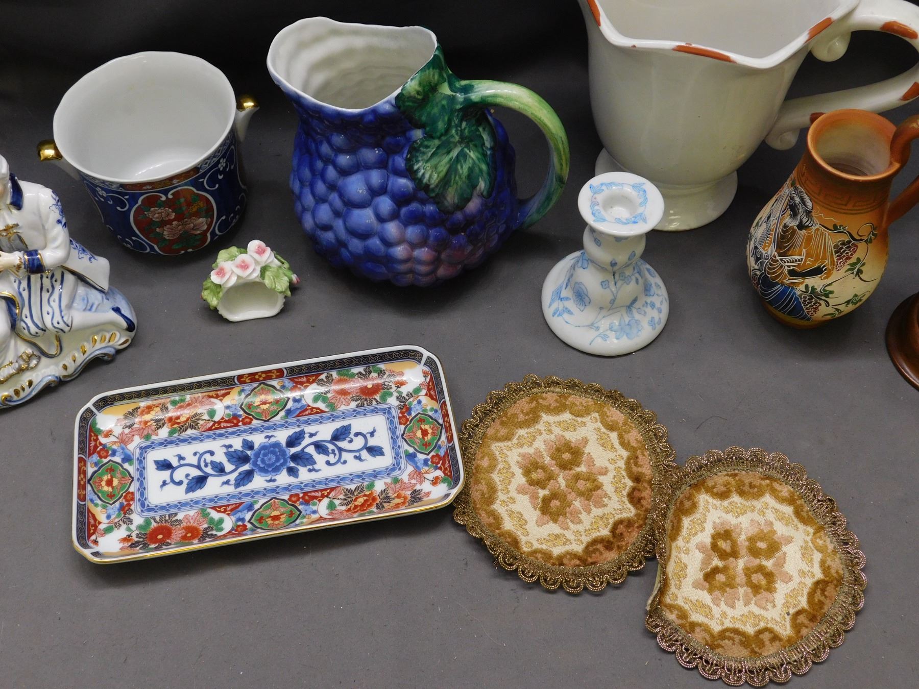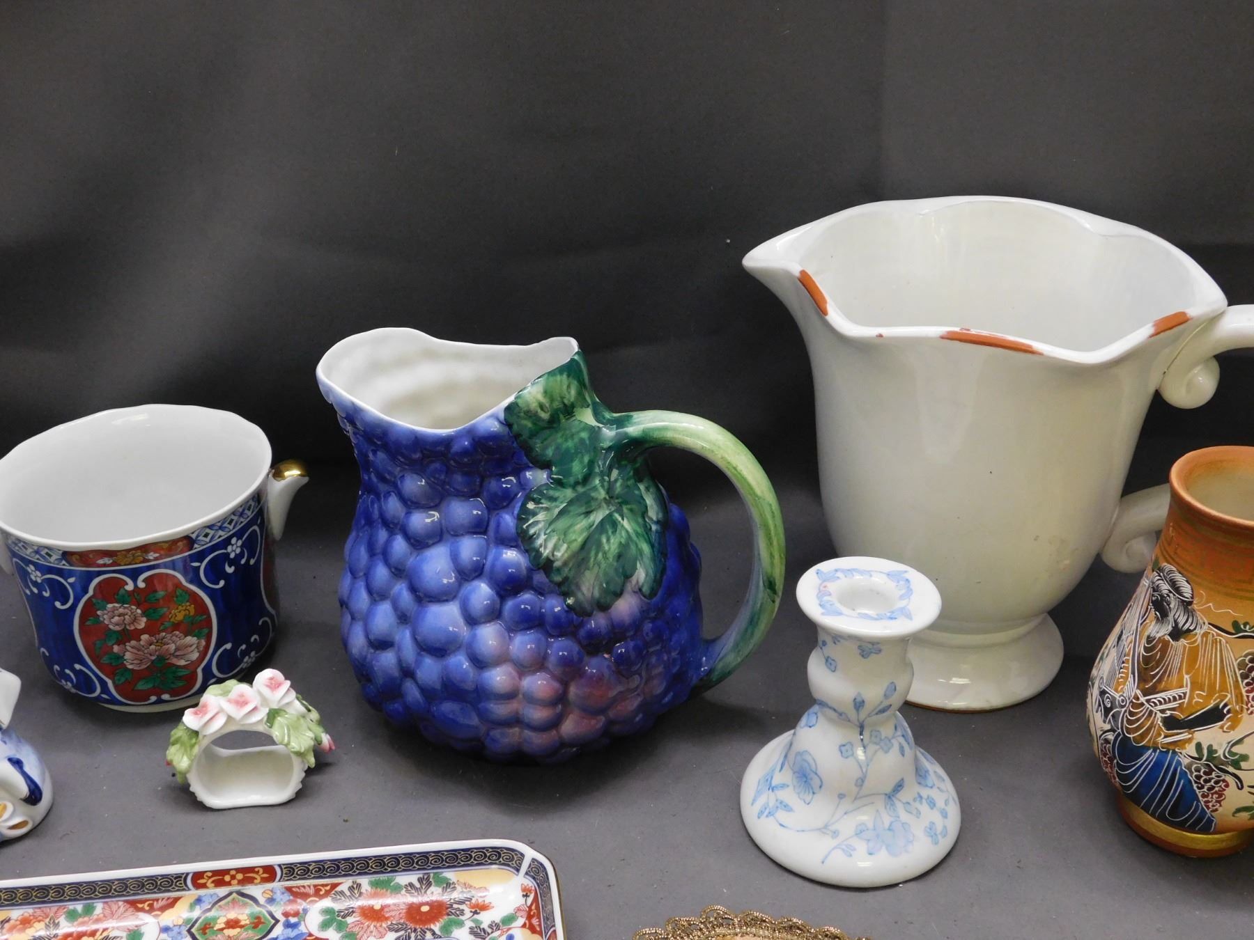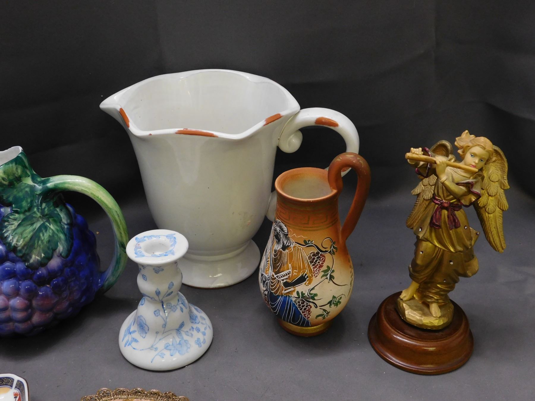 Lot of Assorted Pottery, Grape Decanter, Figurines, Candlestick, Pitcher, Greece Japan Italy Etc