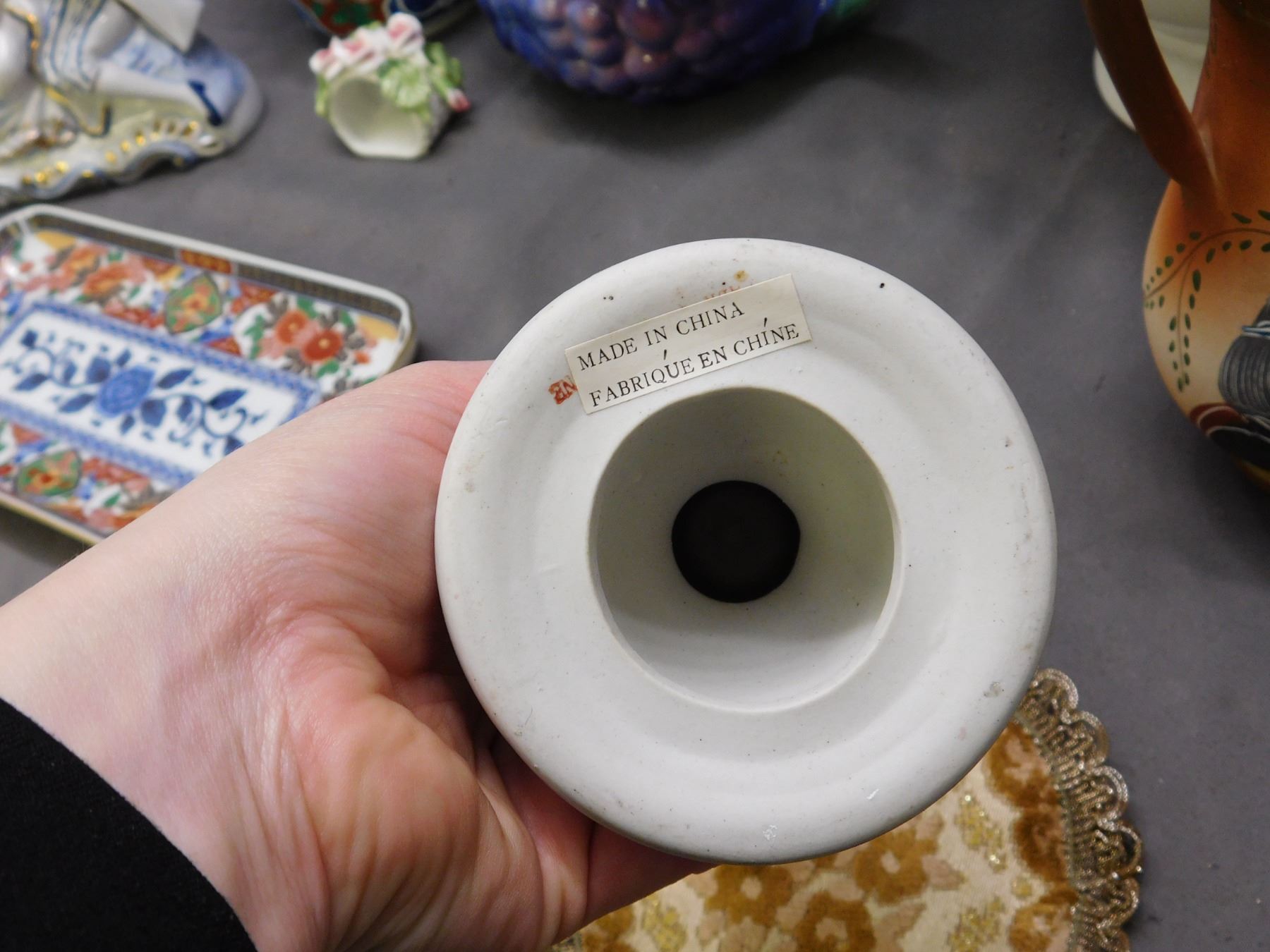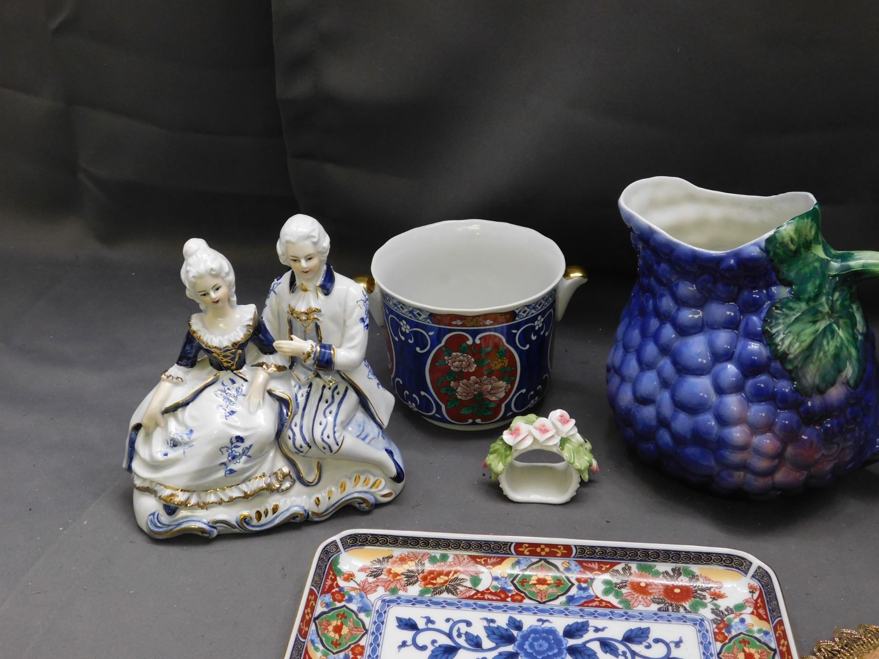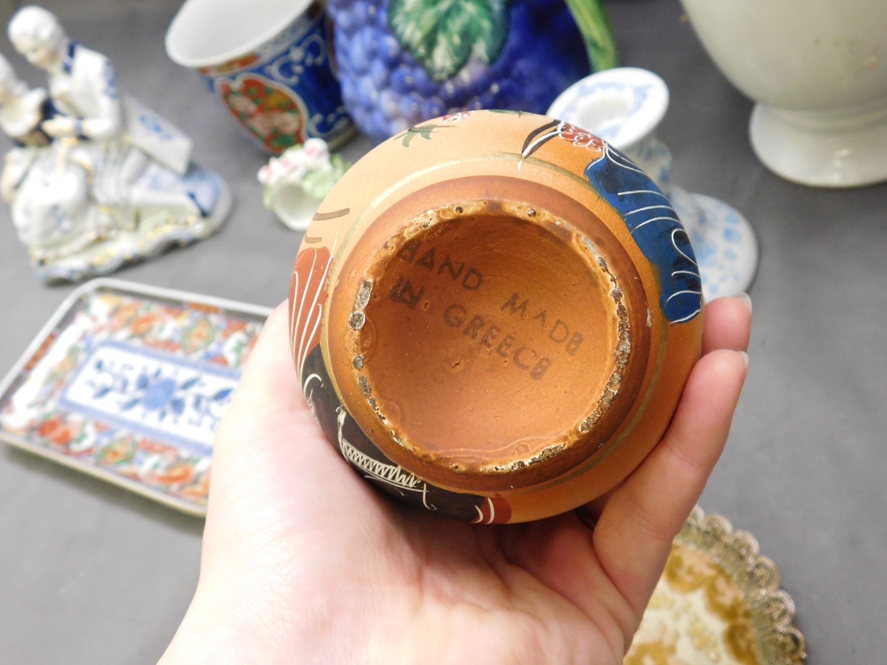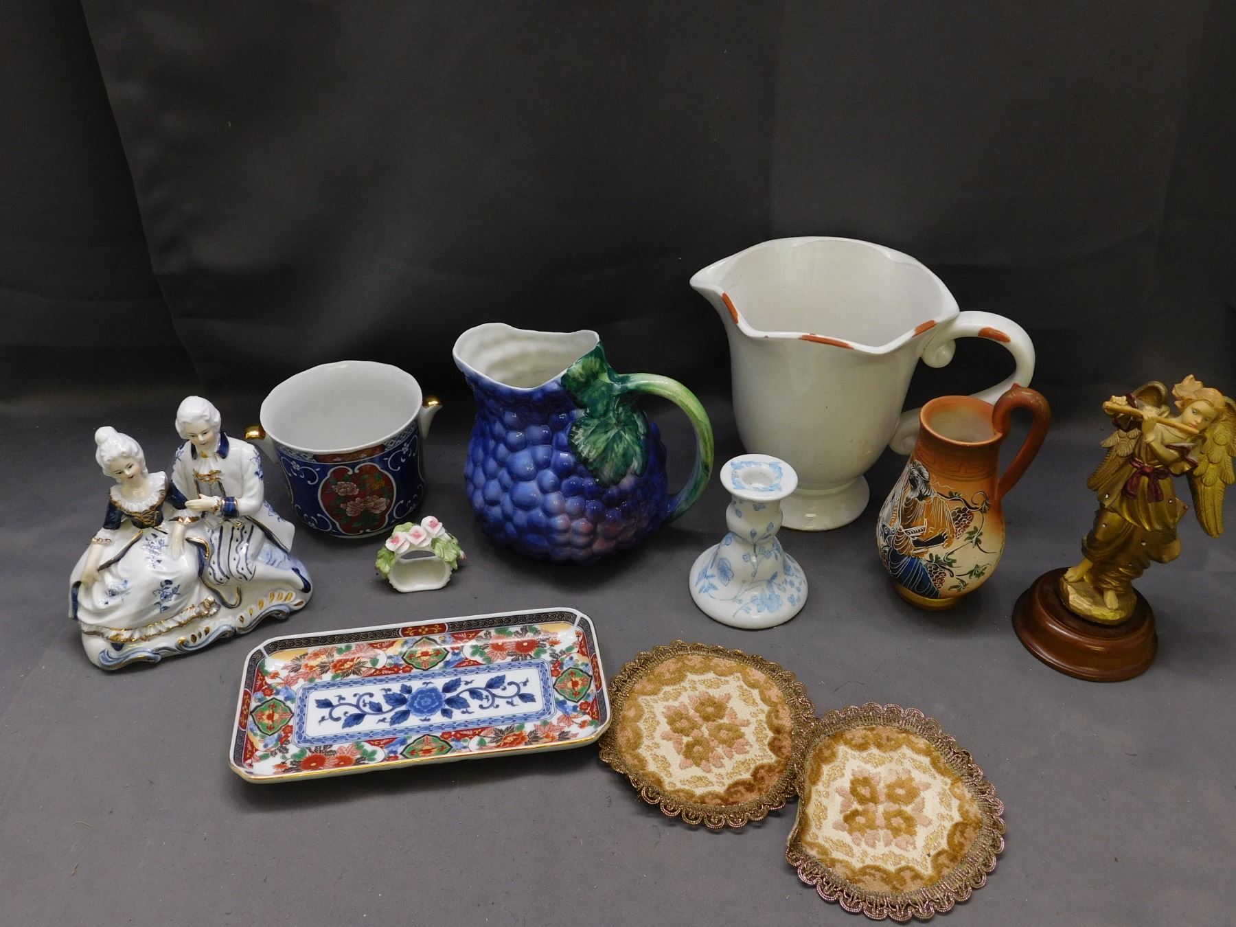Lot of Assorted Pottery, Grape Decanter, Figurines, Candlestick, Pitcher, Greece Japan Italy Etc