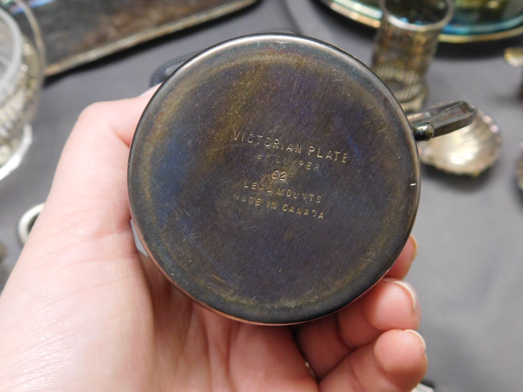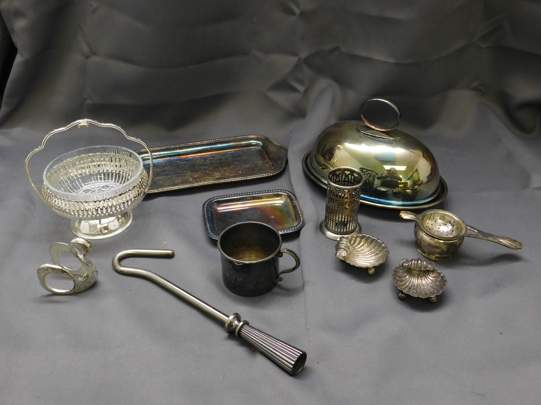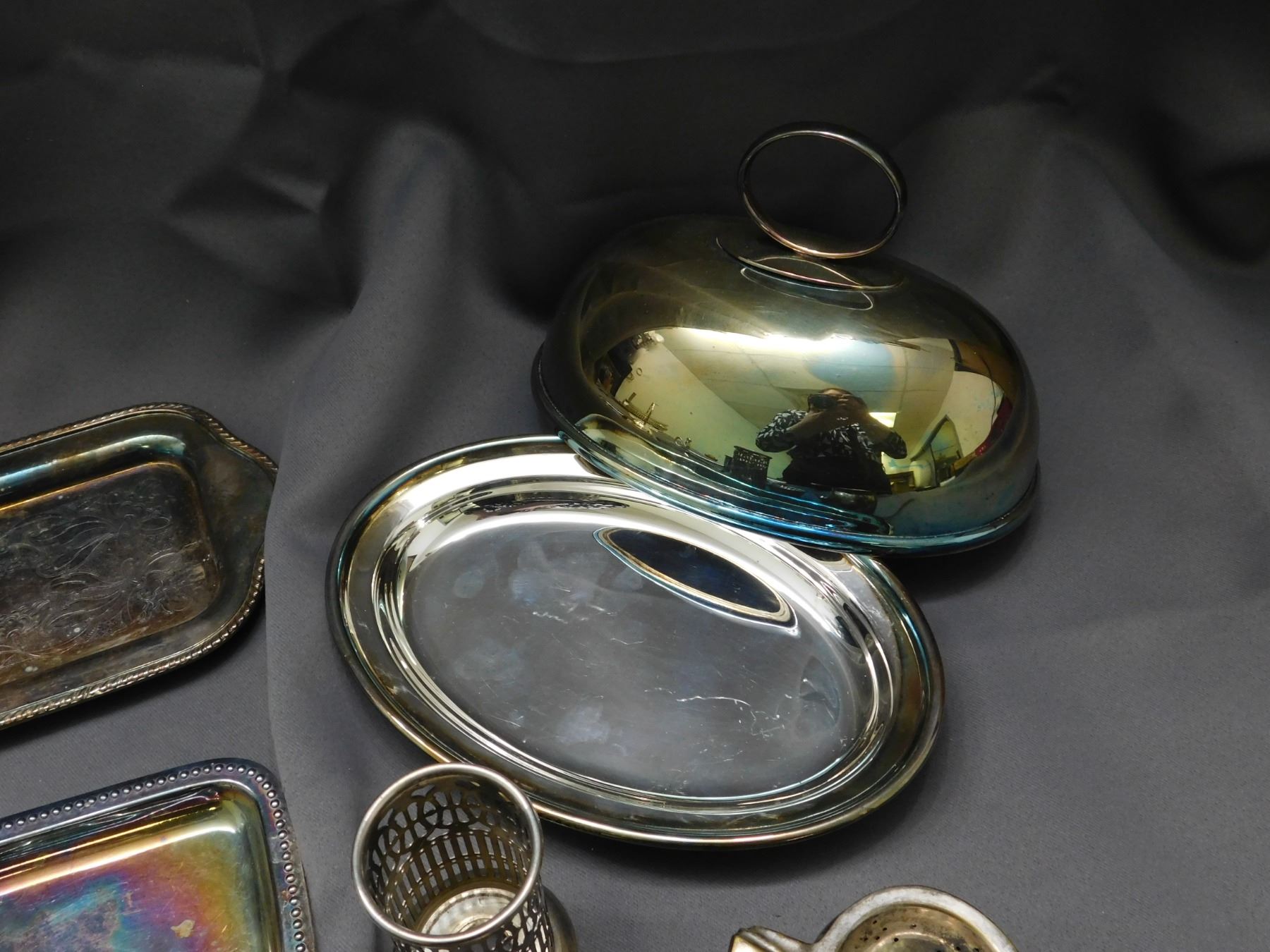 Lot of Assorted Silverplate Butter Dish, Trays, Salt, Tea Strainer, Curtain Pull, Olives