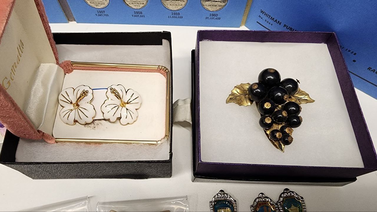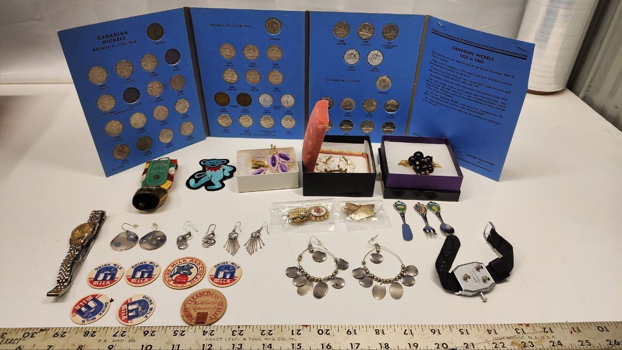 Lot of Assorted Small Treasures, Brooches, Earrings, Wrist Golf Point Tracker, Milk Tokens, Watch, Canadian Nickels - circa 1922-1960s (two nickels missing)
