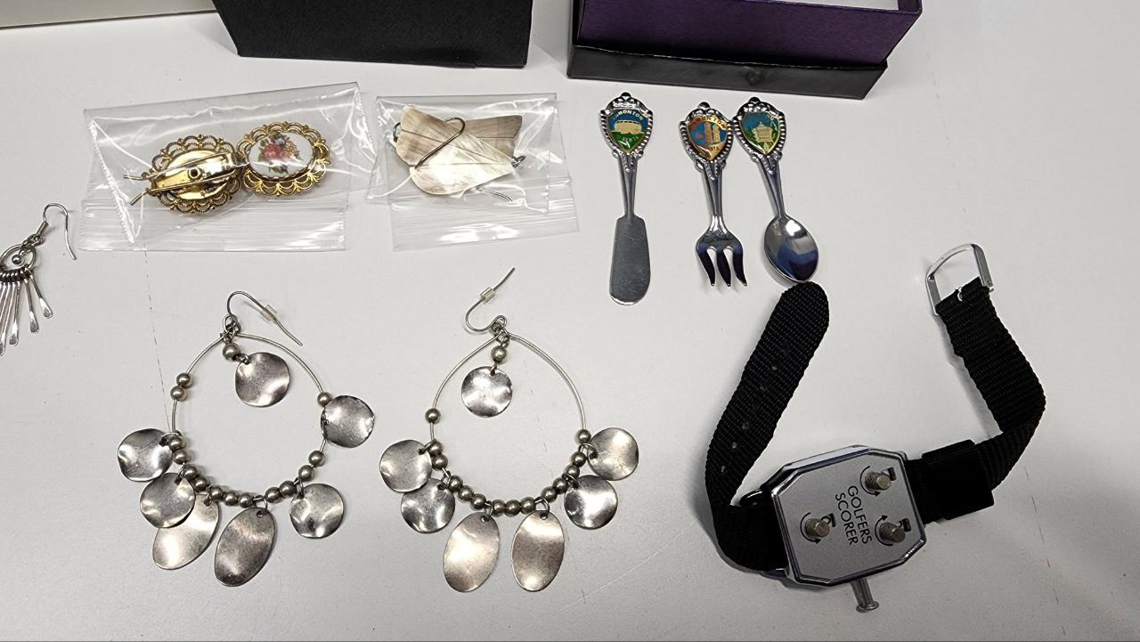 Lot of Assorted Small Treasures, Brooches, Earrings, Wrist Golf Point Tracker, Milk Tokens, Watch, C