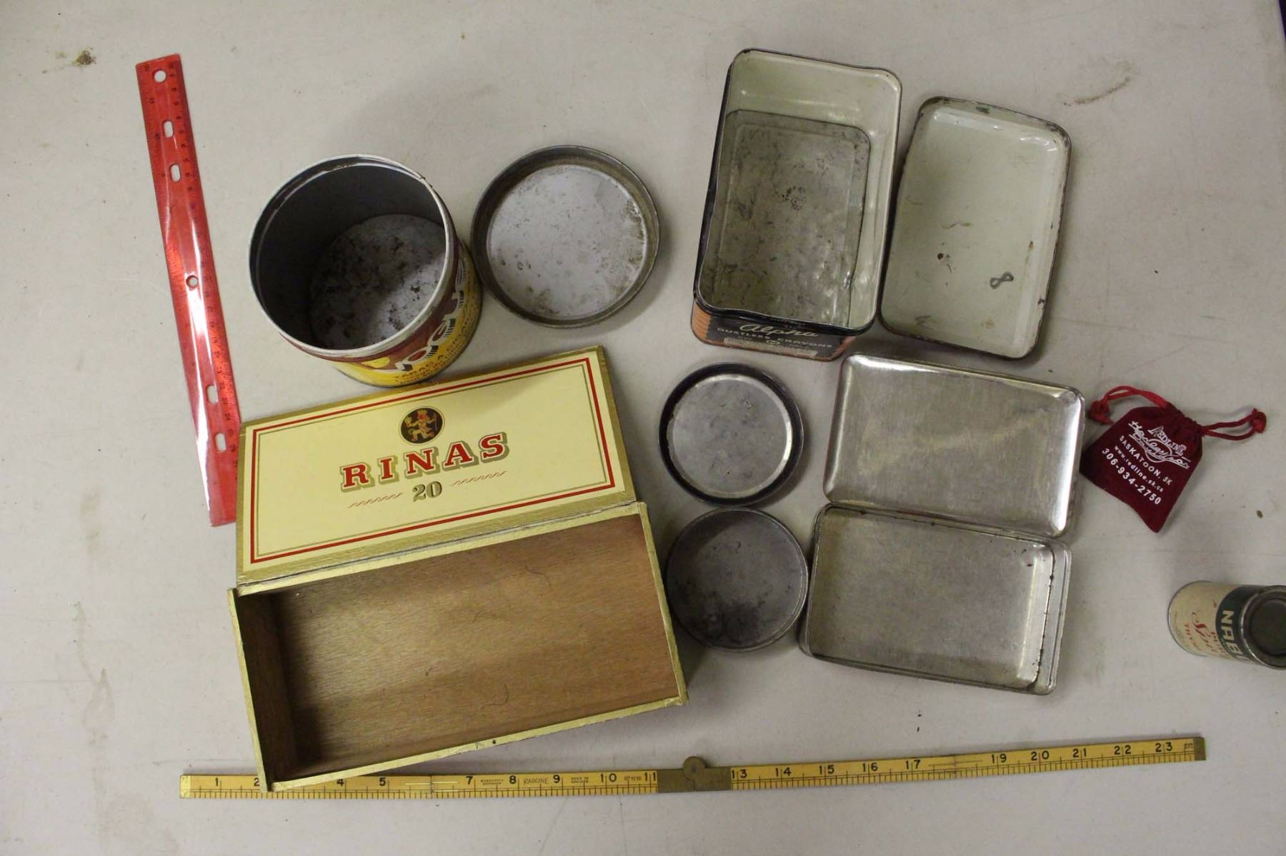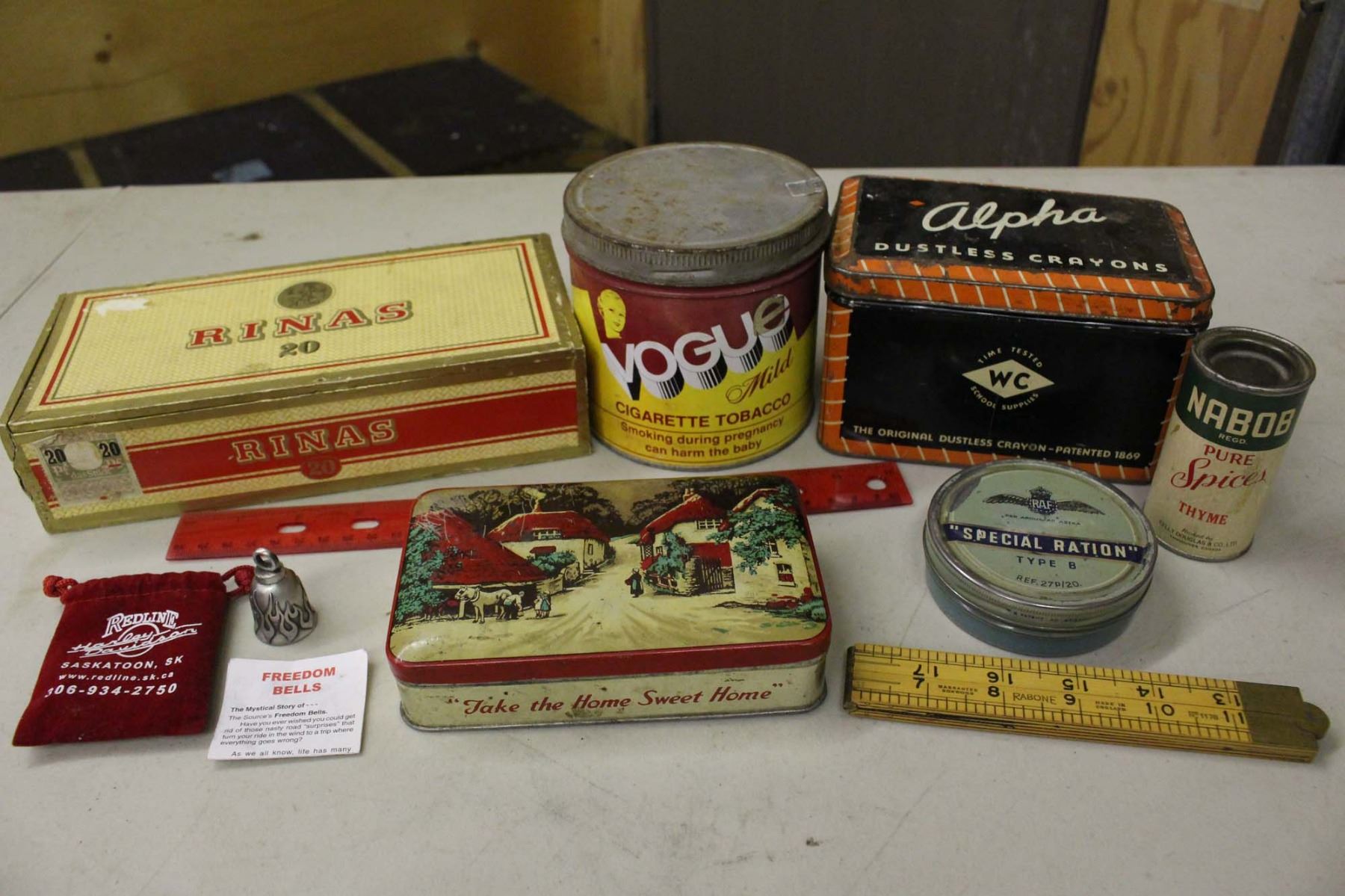 Lot of Assorted Tins (5)(Vogue Tobacco, Alpha Crayons, Blue Bird Toffee, Etc;)& Misc. (Rinas, Redline Bell, Rabone Ruler, Etc;)