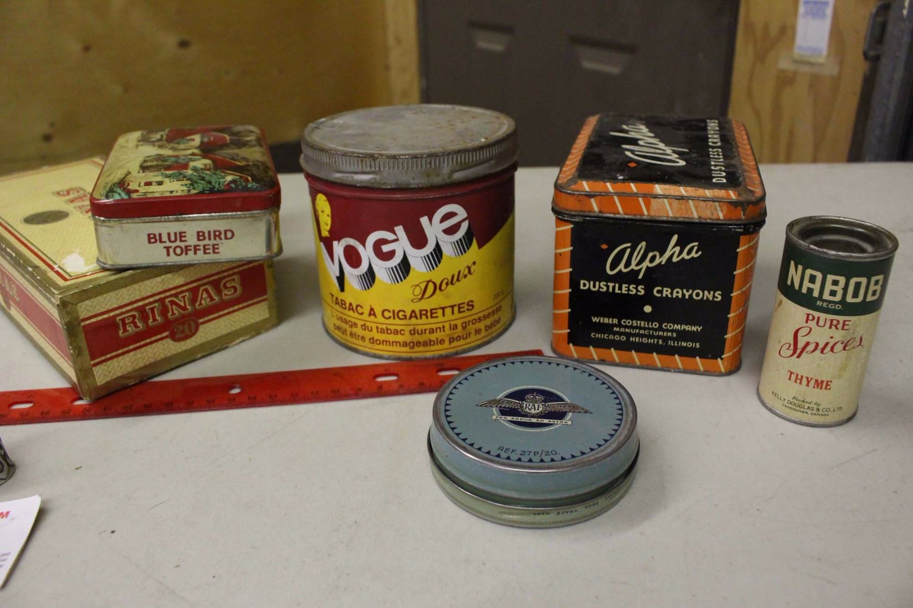 Lot of Assorted Tins (5)(Vogue Tobacco, Alpha Crayons, Blue Bird Toffee, Etc;)& Misc. (Rinas, Redlin