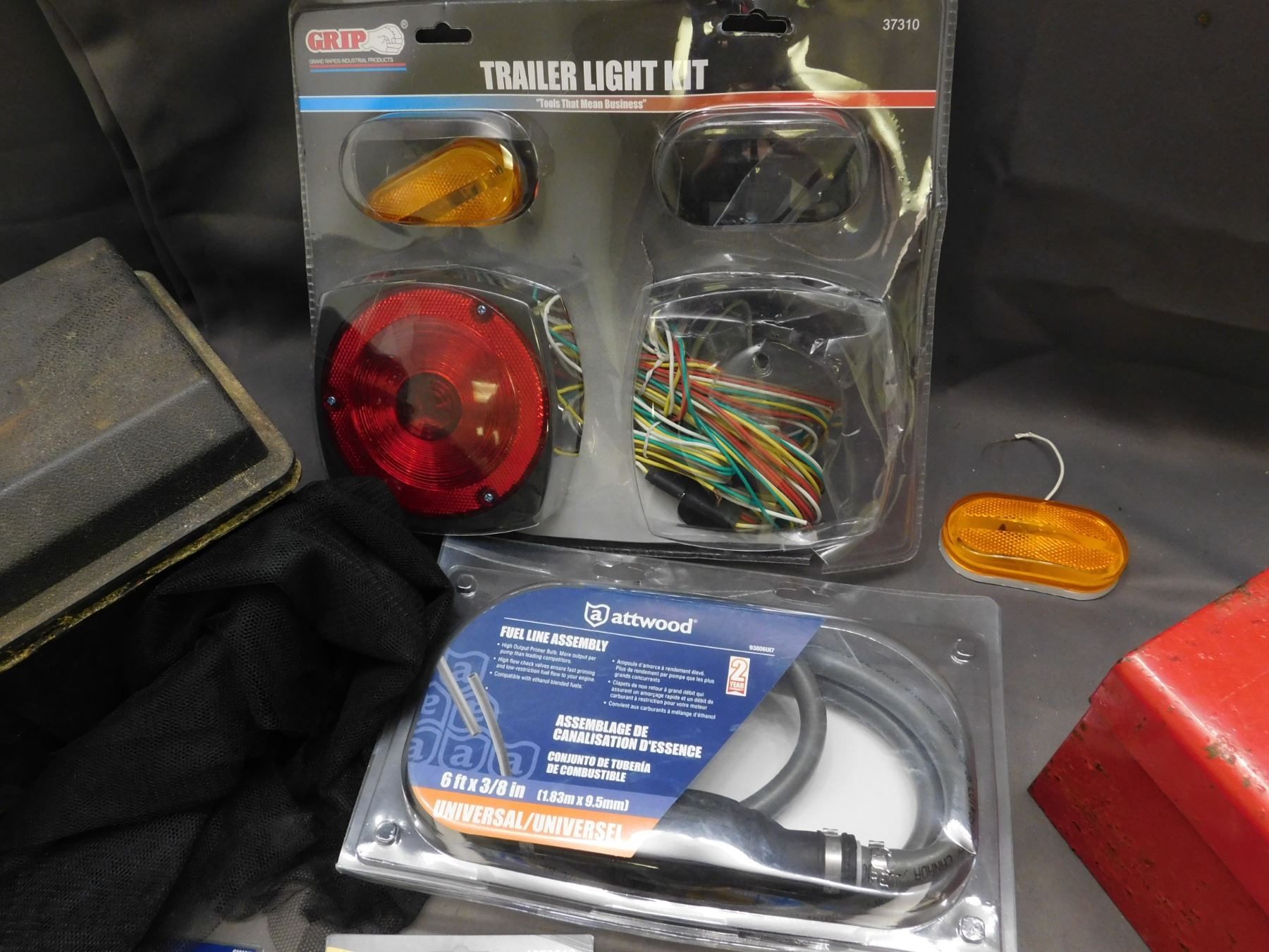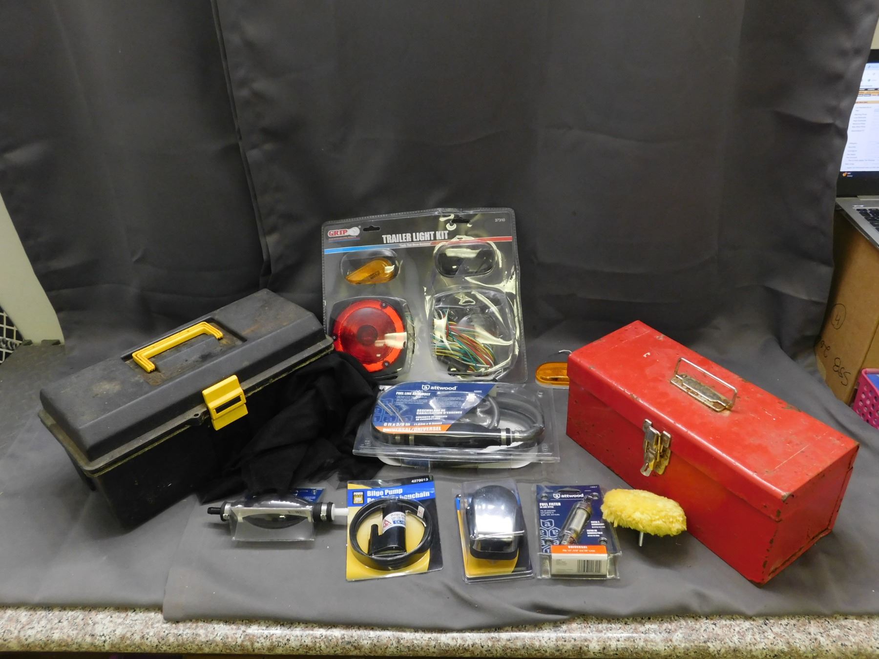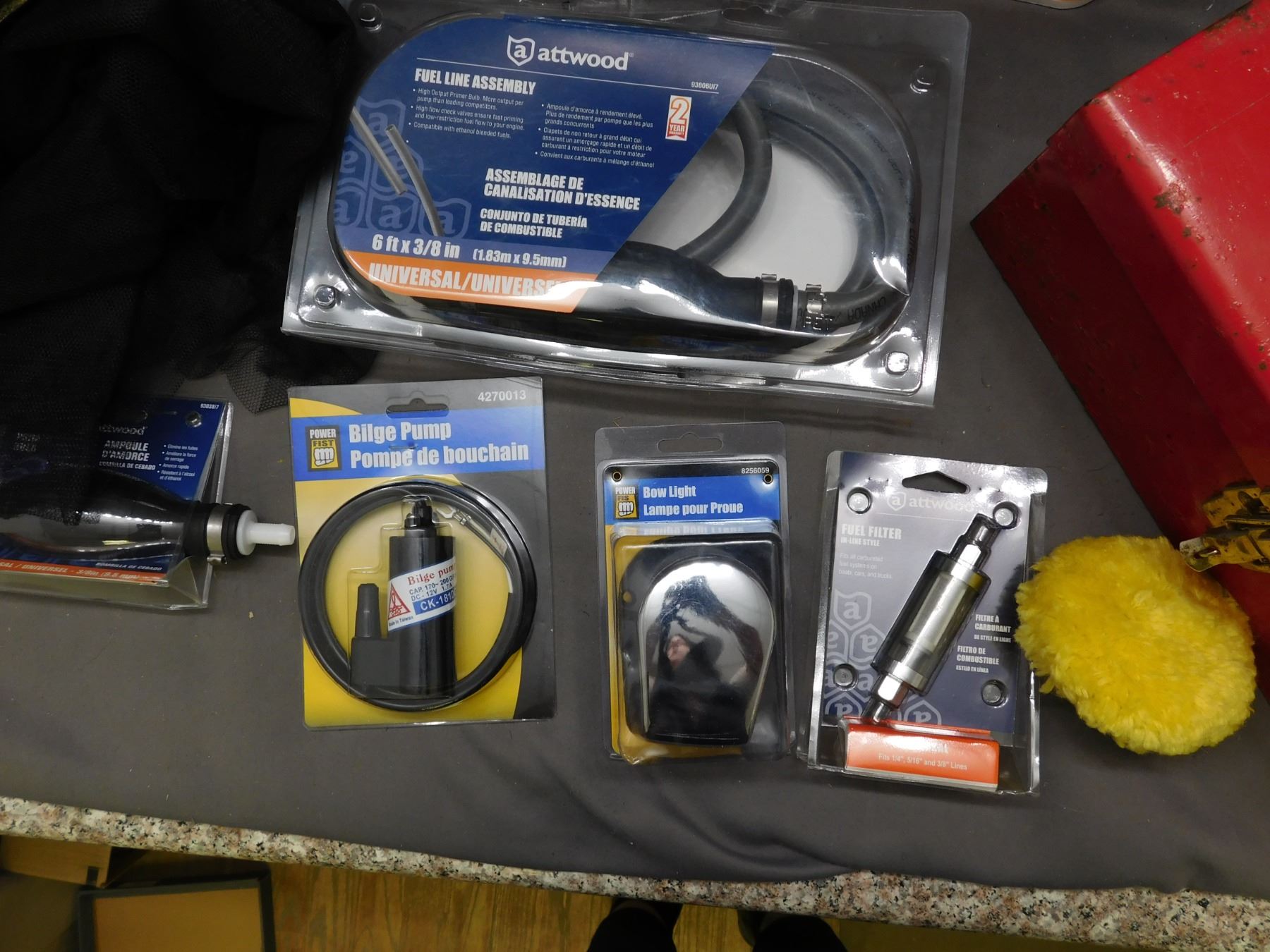 Lot of Assorted Tools, Trailer Light Kit, Tool Boxes, attwood Fuel Line Assembly, Bilge Pump, Bow
