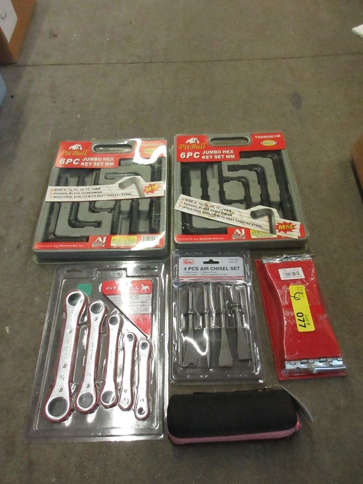 Two 6 piece jumbo hex keys sets, umbrella, wrench set, sander & 4 piece chisel set.