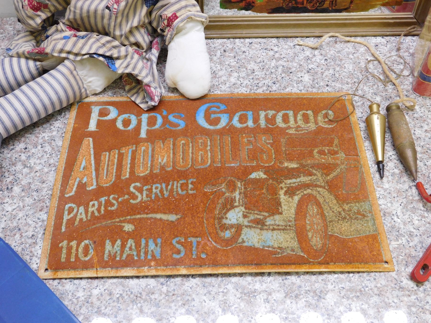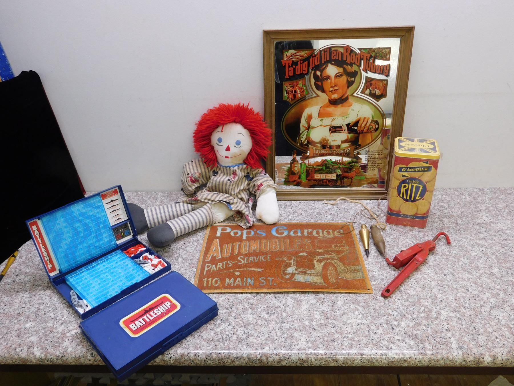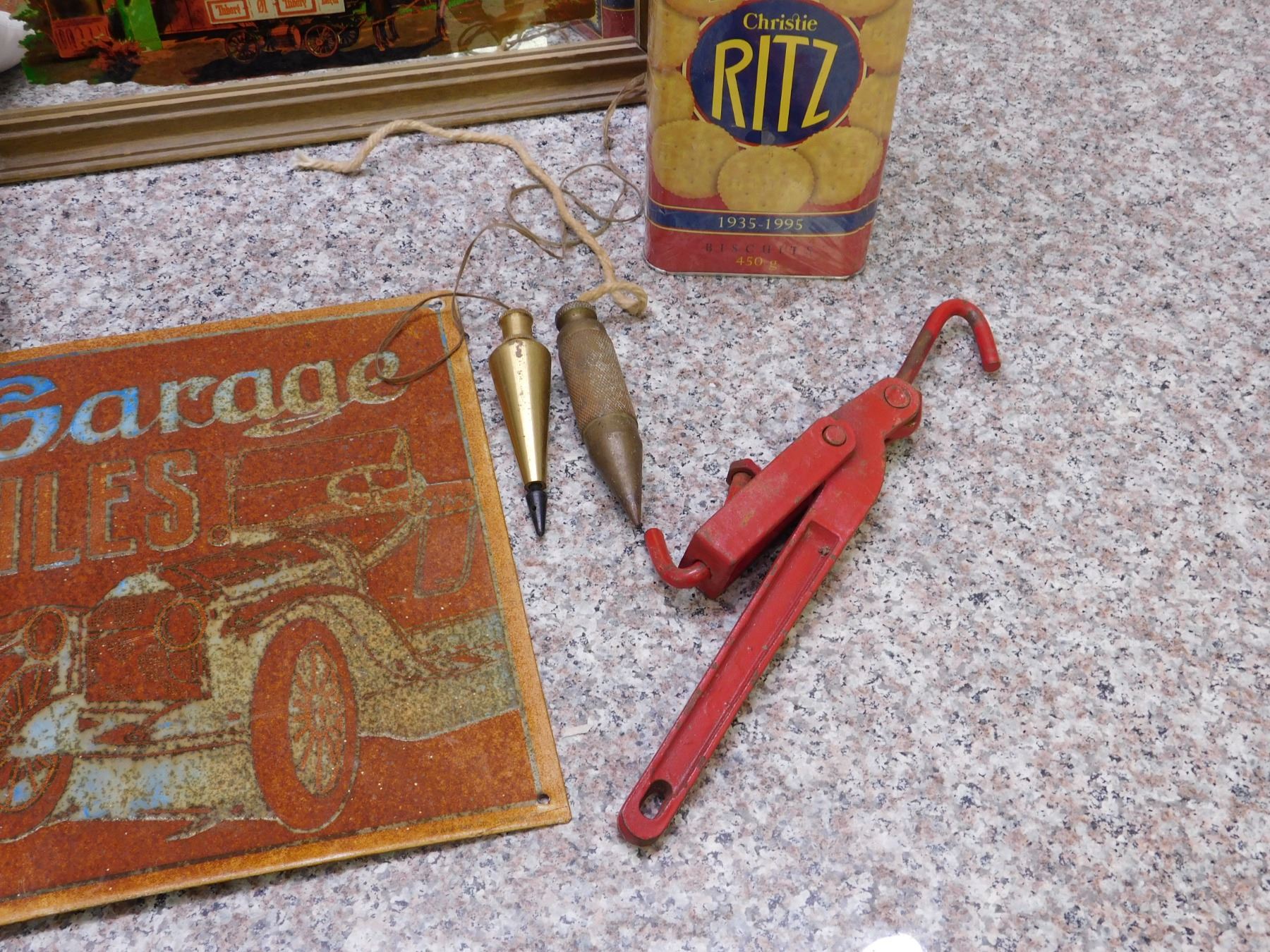 Lot of Assorted Vintage Knick Knacks Rusted Sign, Mirror Wall Sign, Advertising, Plumb Bombs, Etc
