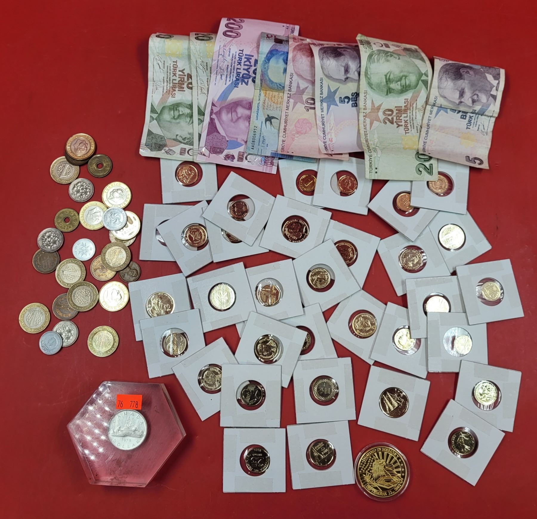Lot of Assorted World Currency w/ Paper Money, Coins, & 9/11 Commemorative Medallion