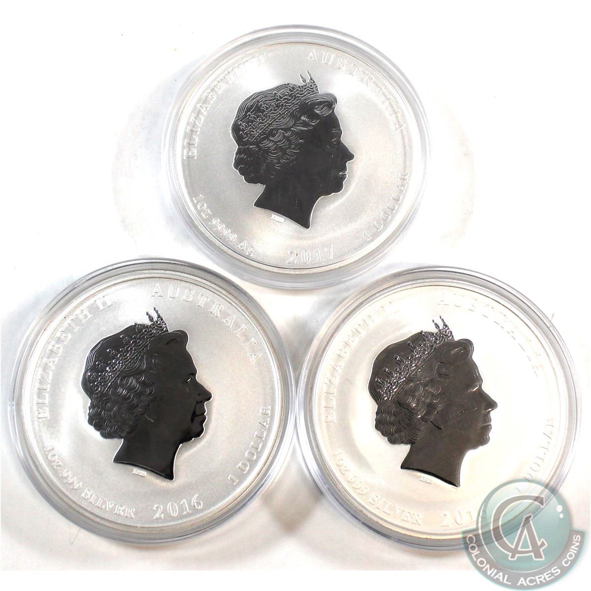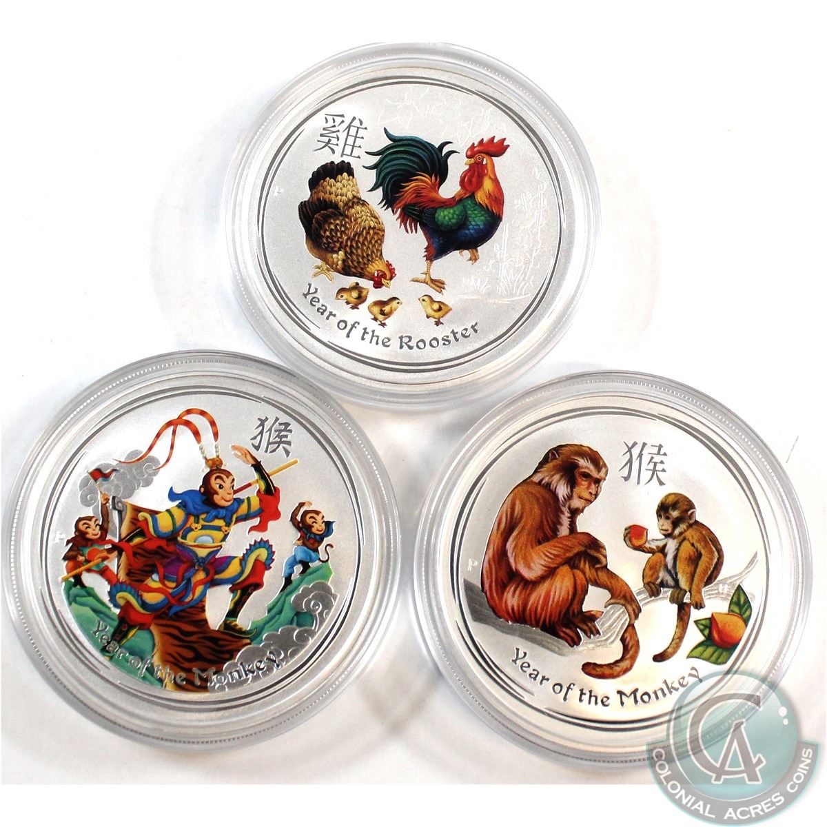 Lot of Australia 1oz .999 Fine Silver Coloured Coins in Capsules. You will receive 2x 2016 Year of the Monkey with different designs & 2017 Year of the Rooster (capsules are lightly scratched). 3pcs (TAX Exempt)