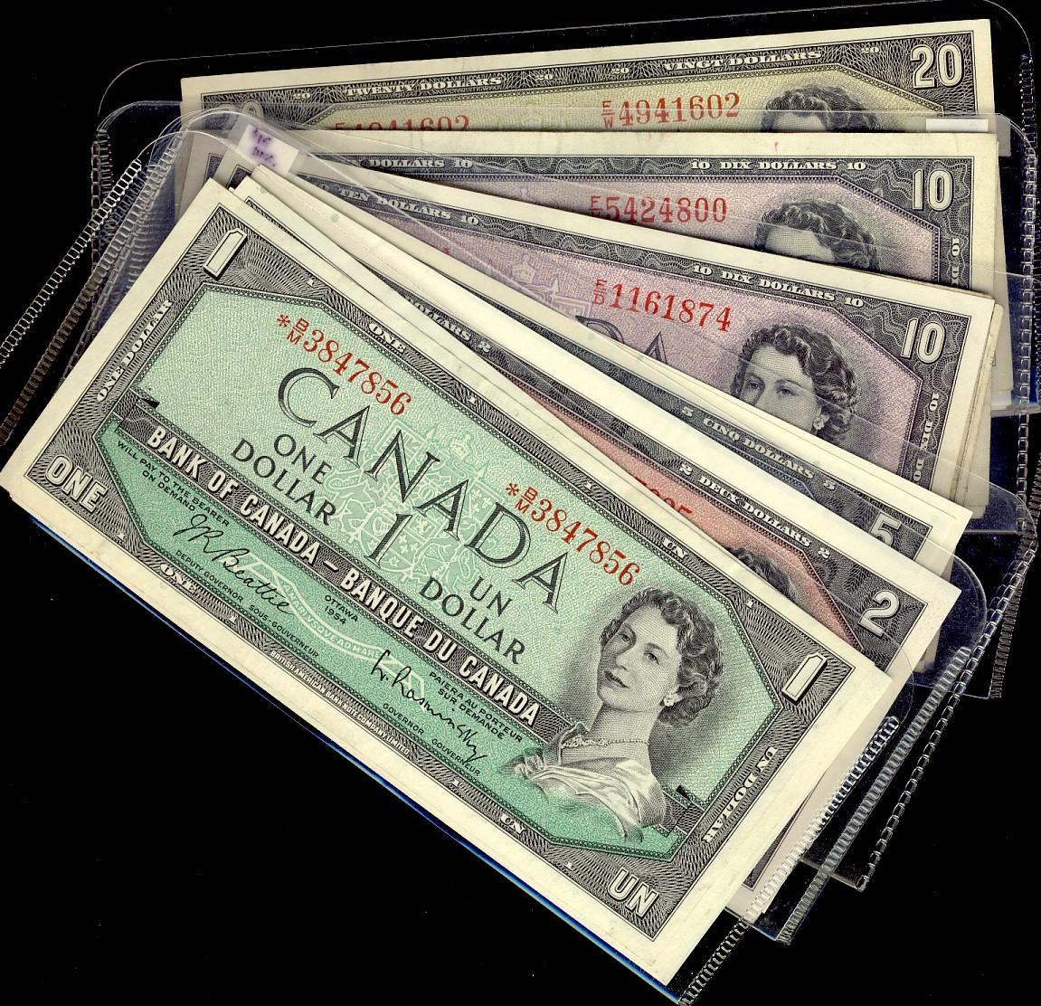 Lot of Bank of Canada 1954 issues. Lot includes 1954 $1 BC-37bA-i(1), BC-37c(5), 1954 $2 BCBC-38b(4), 1954 $5 BC-39b(2), 1954 $10 BC-40a(1), BC-40b(4), 1954 $20 BC-41b(5) and devil's face issues including 1954 $10 BC-BC32a(5) and 1954 $20 BC-33a(1). Mod