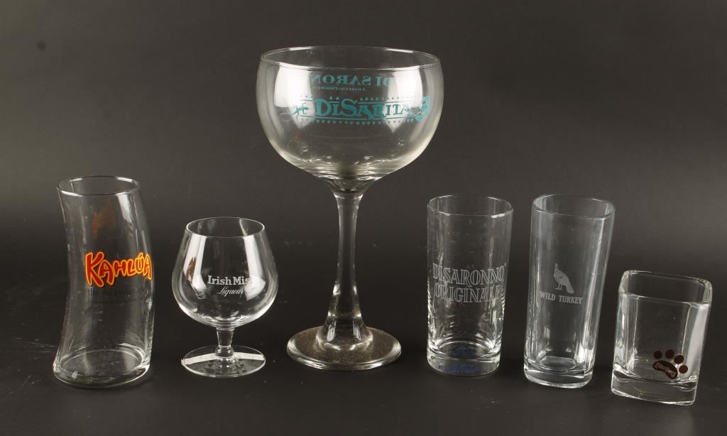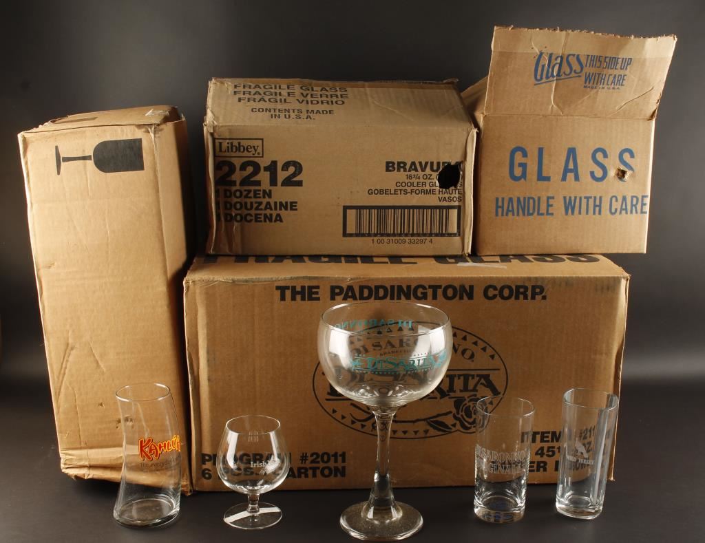 Including; 24 Di Sarronno tall glasses, 12 Early Times rock glasses, 4 Irish Mist Brandy Snifters, 6 DiSarita super bowls, 8 tall Wild Turkey glasses, and 12 Kahlua rock glasses.