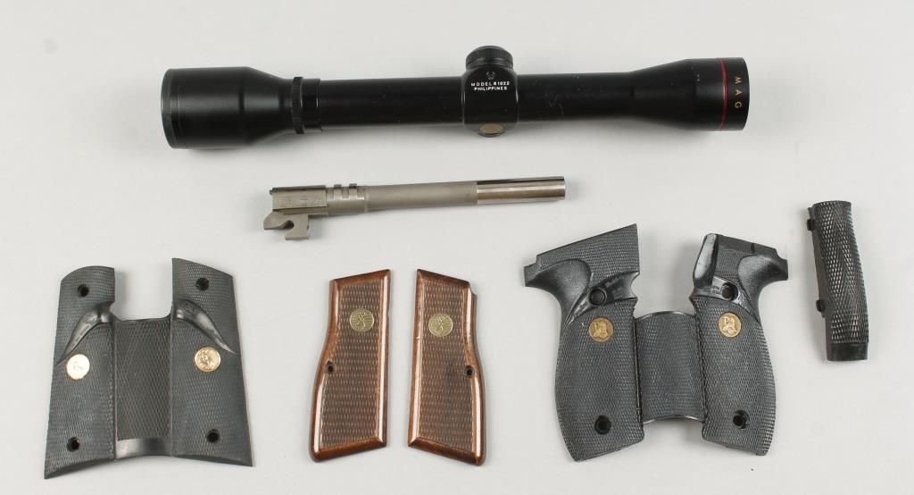 Including: Peters Stahl 9mm barrel for Browning Hi-Power -new, Colt/Pachmayer 1911 rubber grips, Browning Hi-Power Walnut grips-excellent condition, Simmons 4 x 32 scope for 22 magnum, and Pachmayer rubber grips for Sig Sauer Model P-226