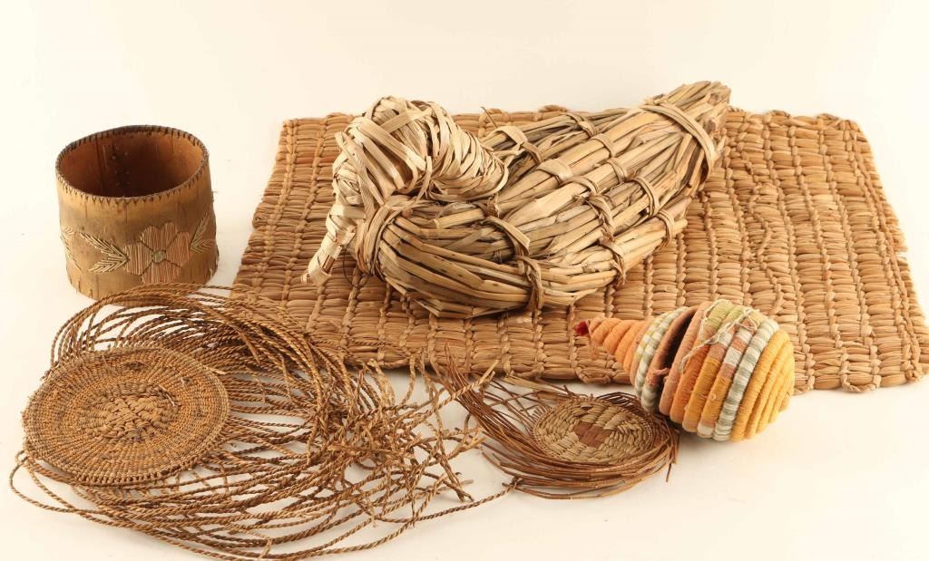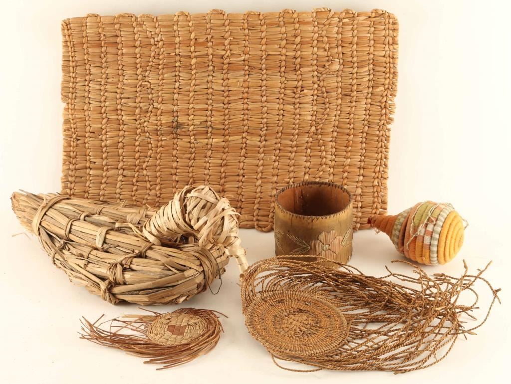 Including; (2) beginnings of Chehalis baskets, woodland birch basket, missing lid circa 1940 measures 3 1/2"x4", Egyptian lidded basket circa 1940 measures 5"x3", reed duck decoy, tribe unknown circa 1940 measures 6"x11", and a cattail mat, tribe unknown circa 1940 measures 12"x18".