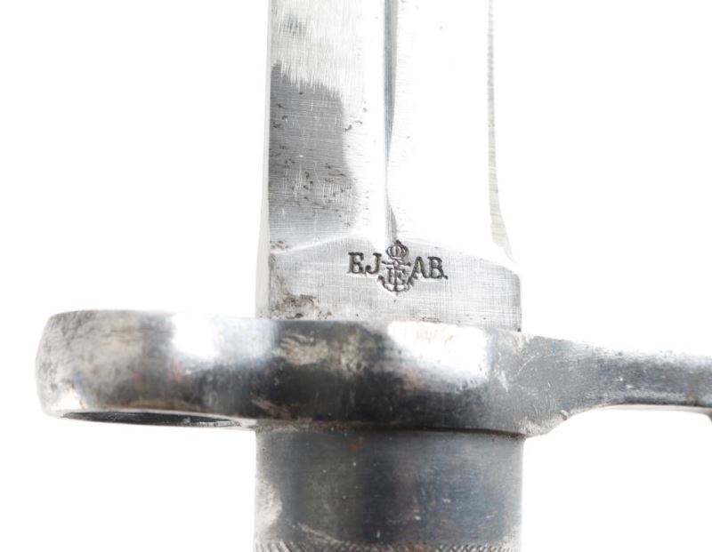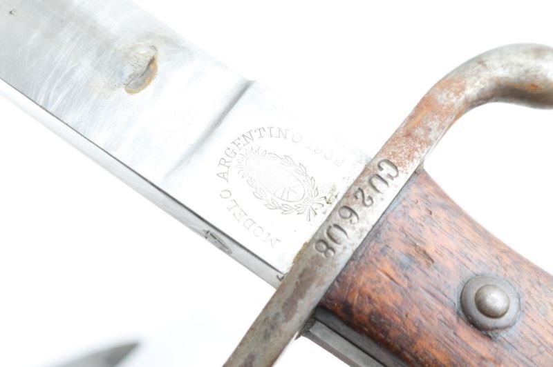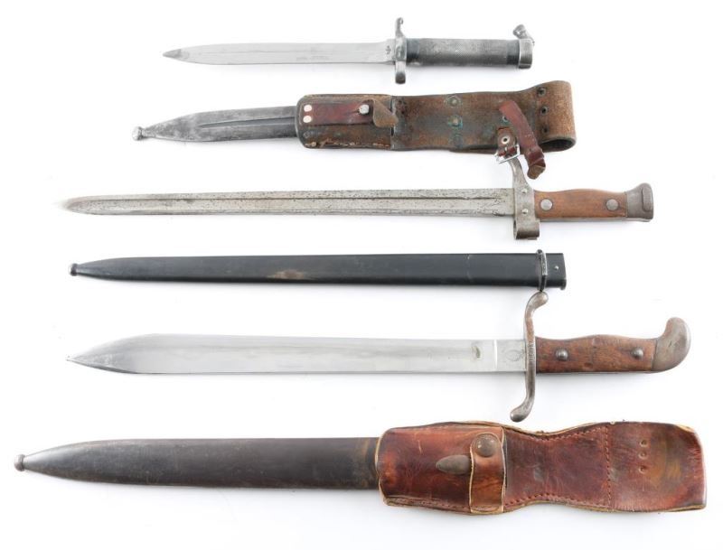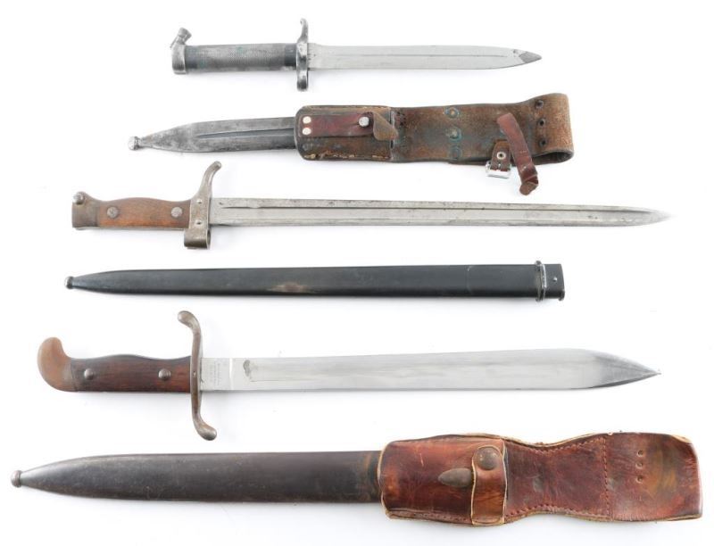 1) German made Argentine 1909 Short Sword/Machete. 14 3/4" blade. Ricasso marked "Modelo Argentino 1909" with crest. Reverse marked"Weyersberg Kirschbaum & Co. Solingen. Steel scabbard with brown leather frog. Serial #'s mismatched on crossguard and scabbard. Very good overall. There is some surface rust on the crossguard and pommel. 2) French Mle 1892 bayonet for use with the Berthier carbine or short rifles. 15 3/4" blade with feint proofs. Abbreviated quillon of the WW1 era. Steel scabbard. Blade is good but has dark spots. 3) Swedish M1896 Mauser bayonet. 8" double sided blade. For the M96 Mauser, and M38 short rifle. Hollow handle to fit cleaning rod. "EJ AB" with anchor on crossguard, ricasso, and scabbard. Blade has been lightly sharpened. Steel scabbard, with rare brown leather frog.