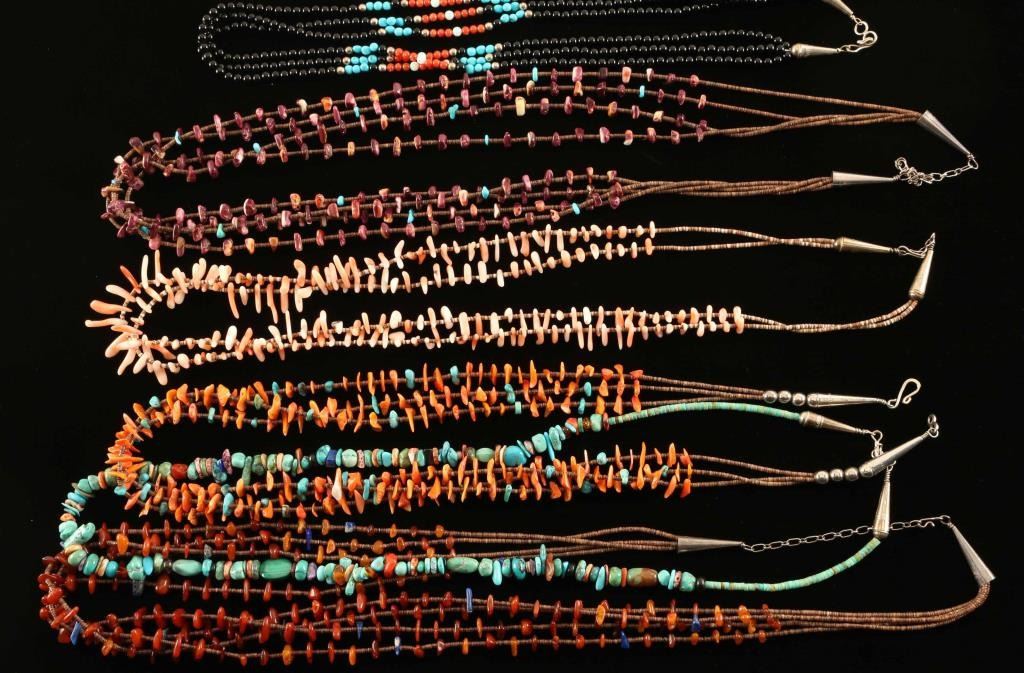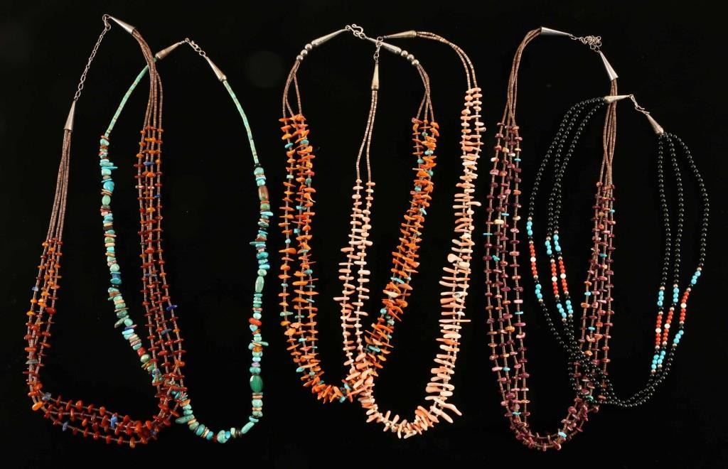 Single and multi strand necklaces with faux turquoise, coral, onyx and spiny oyster beads. Six total.