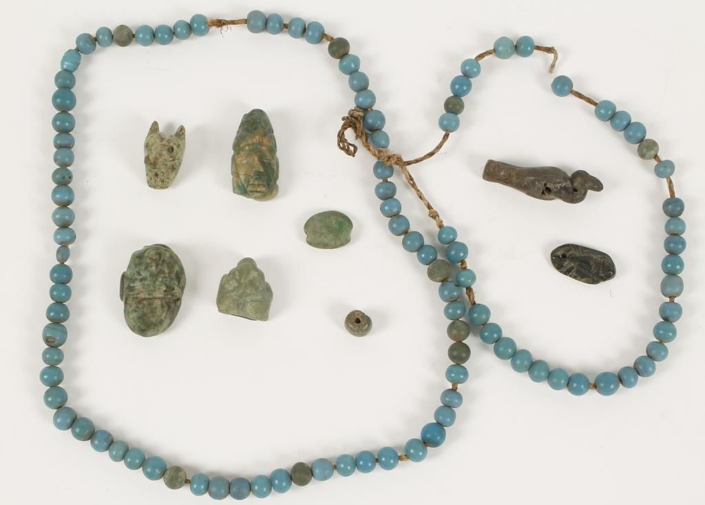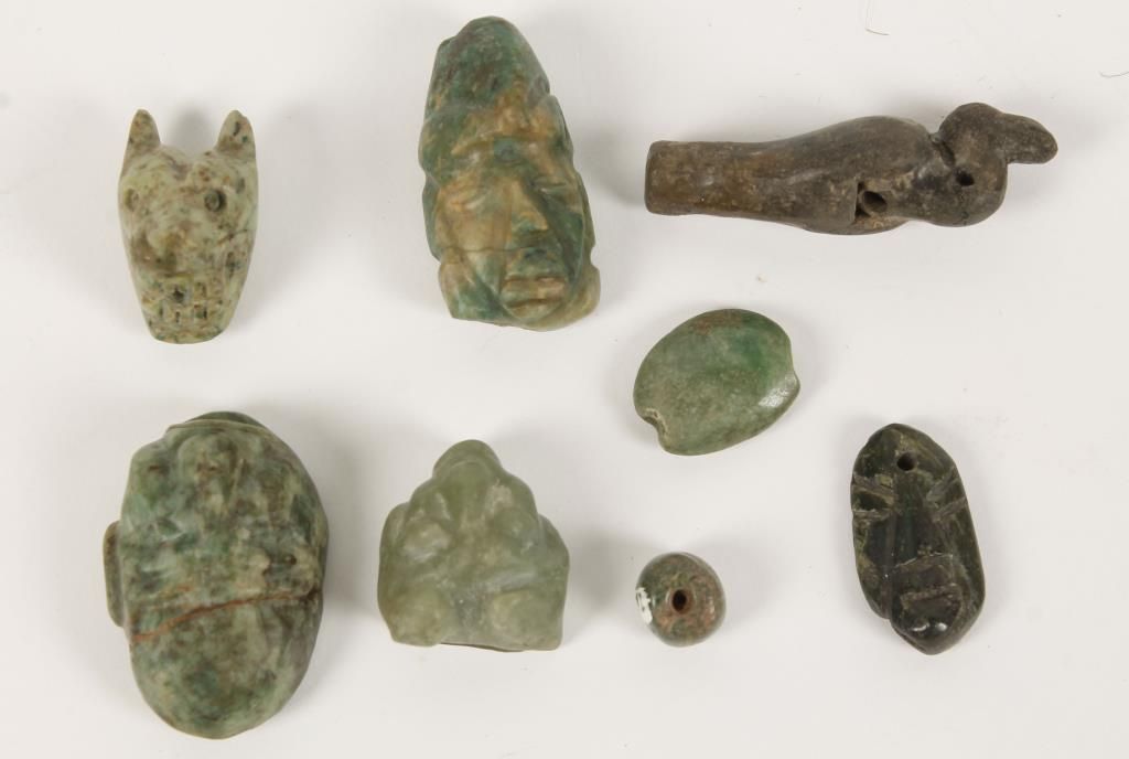Russian/ Eskimo Padre Beads. The beads were excavated in Alaska west coast/northern region in the 1950's. Age circa 1850's. Shows age but in overall good condition. (8) Jade Zapotec Beads. Circa 200-1528 A.D. Excavated in 1950 by Bill Jordan and Monte Alban. Authenticated by John Batkin curator of Colorado Springs Fine Arts. (2) small circular and oval beads. (3) beads are carved heads ranging from 1" to 1-1/2". (2) animal head beads 1". (1) bird bead which is also a whistle, 2" long. The bird bead has been restored.